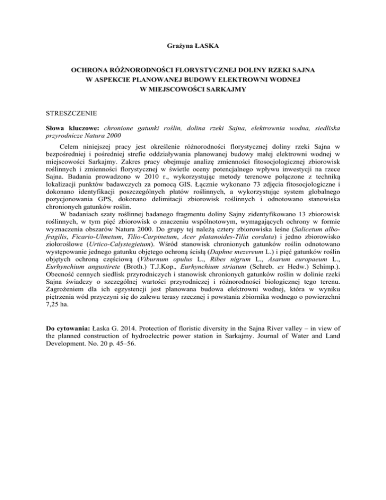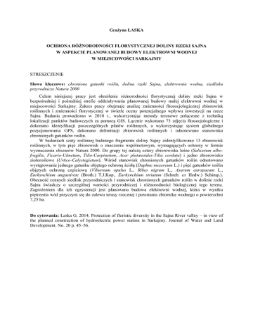 Grażyna ŁASKA OCHRONA RÓŻNORODNOŚCI FLORYSTYCZNEJ DOLINY RZEKI SAJNA W ASPEKCIE PLANOWANEJ BUDOWY ELEKTROWNI WODNEJ W MIEJSCOWOŚCI SARKAJMY STRESZCZENIE Słowa kluczowe: chronione gatunki roślin, dolina rzeki Sajna, elektrownia wodna, siedliska przyrodnicze Natura 2000 Celem niniejszej pracy jest określenie różnorodności florystycznej doliny rzeki Sajna w bezpośredniej i pośredniej strefie oddziaływania planowanej budowy małej elektrowni wodnej w miejscowości Sarkajmy. Zakres pracy obejmuje analizę zmienności fitosocjologicznej zbiorowisk roślinnych i zmienności florystycznej w świetle oceny potencjalnego wpływu inwestycji na rzece Sajna. Badania prowadzono w 2010 r., wykorzystując metody terenowe połączone z techniką lokalizacji punktów badawczych za pomocą GIS. Łącznie wykonano 73 zdjęcia fitosocjologiczne i dokonano identyfikacji poszczególnych płatów roślinnych, a wykorzystując system globalnego pozycjonowania GPS, dokonano delimitacji zbiorowisk roślinnych i odnotowano stanowiska chronionych gatunków roślin. W badaniach szaty roślinnej badanego fragmentu doliny Sajny zidentyfikowano 13 zbiorowisk roślinnych, w tym pięć zbiorowisk o znaczeniu wspólnotowym, wymagających ochrony w formie wyznaczenia obszarów Natura 2000. Do grupy tej należą cztery zbiorowiska leśne (Salicetum albofragilis, Ficario-Ulmetum, Tilio-Carpinetum, Acer platanoides-Tilia cordata) i jedno zbiorowisko ziołoroślowe (Urtico-Calystegietum). Wśród stanowisk chronionych gatunków roślin odnotowano występowanie jednego gatunku objętego ochroną ścisłą (Daphne mezereum L.) i pięć gatunków roślin objętych ochroną częściową (Viburnum opulus L., Ribes nigrum L., Asarum europaeum L., Eurhynchium angustirete (Broth.) T.J.Kop., Eurhynchium striatum (Schreb. ex Hedw.) Schimp.). Obecność cennych siedlisk przyrodniczych i stanowisk chronionych gatunków roślin w dolinie rzeki Sajna świadczy o szczególnej wartości przyrodniczej i różnorodności biologicznej tego terenu. Zagrożeniem dla ich egzystencji jest planowana budowa elektrowni wodnej, która w wyniku piętrzenia wód przyczyni się do zalewu terasy rzecznej i powstania zbiornika wodnego o powierzchni 7,25 ha. Do cytowania: Łaska G. 2014. Protection of floristic diversity in the Sajna River valley – in view of the planned construction of hydroelectric power station in Sarkajmy. Journal of Water and Land Development. No. 20 p. 45–56.