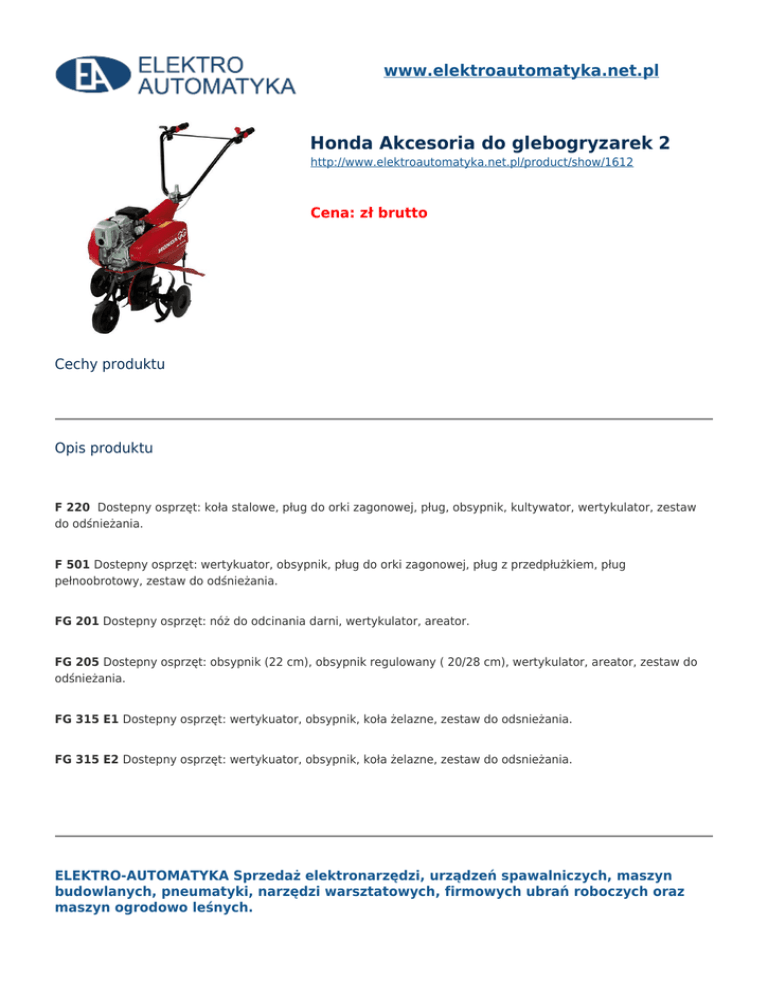 www.elektroautomatyka.net.pl Honda Akcesoria do glebogryzarek 2 http://www.elektroautomatyka.net.pl/product/show/1612 Cena: zł brutto Cechy produktu Opis produktu F 220 Dostepny osprzęt: koła stalowe, pług do orki zagonowej, pług, obsypnik, kultywator, wertykulator, zestaw do odśnieżania. F 501 Dostepny osprzęt: wertykuator, obsypnik, pług do orki zagonowej, pług z przedpłużkiem, pług pełnoobrotowy, zestaw do odśnieżania. FG 201 Dostepny osprzęt: nóż do odcinania darni, wertykulator, areator. FG 205 Dostepny osprzęt: obsypnik (22 cm), obsypnik regulowany ( 20/28 cm), wertykulator, areator, zestaw do odśnieżania. FG 315 E1 Dostepny osprzęt: wertykuator, obsypnik, koła żelazne, zestaw do odsnieżania. FG 315 E2 Dostepny osprzęt: wertykuator, obsypnik, koła żelazne, zestaw do odsnieżania. ELEKTRO-AUTOMATYKA Sprzedaż elektronarzędzi, urządzeń spawalniczych, maszyn budowlanych, pneumatyki, narzędzi warsztatowych, firmowych ubrań roboczych oraz maszyn ogrodowo leśnych. Sklep Bochnia ul. Brzeska 50 32-700 Bochnia Sklep Brzesko ul. Szarych Szeregów 23 32-800 Brzesko Serwis, Magazyn ul. Św. Brata Alberta 4 32-800 Brzesko tel. 691 572 333 e-mail: [email protected] tel. 609 523 230 e-mail: [email protected] tel. 609 523 645 e-mail: [email protected]