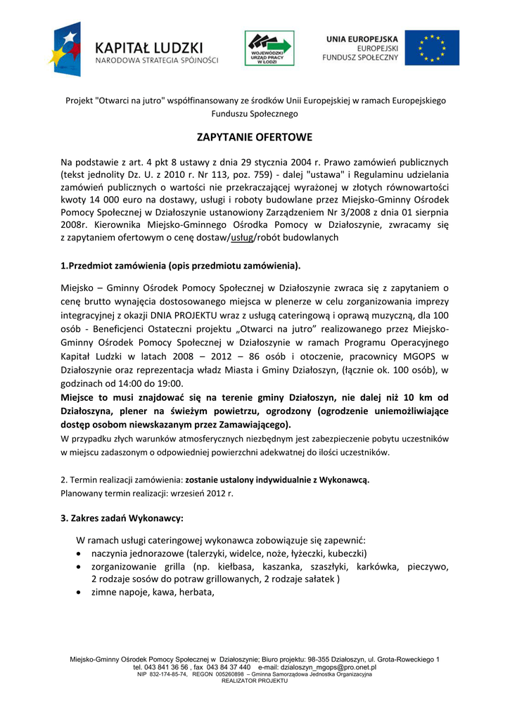 Projekt "Otwarci na jutro" współfinansowany ze środków Unii Europejskiej w ramach Europejskiego Funduszu Społecznego ZAPYTANIE OFERTOWE Na podstawie z art. 4 pkt 8 ustawy z dnia 29 stycznia 2004 r. Prawo zamówień publicznych (tekst jednolity Dz. U. z 2010 r. Nr 113, poz. 759) - dalej "ustawa" i Regulaminu udzielania zamówień publicznych o wartości nie przekraczającej wyrażonej w złotych równowartości kwoty 14 000 euro na dostawy, usługi i roboty budowlane przez Miejsko-Gminny Ośrodek Pomocy Społecznej w Działoszynie ustanowiony Zarządzeniem Nr 3/2008 z dnia 01 sierpnia 2008r. Kierownika Miejsko-Gminnego Ośrodka Pomocy w Działoszynie, zwracamy się z zapytaniem ofertowym o cenę dostaw/usług/robót budowlanych 1.Przedmiot zamówienia (opis przedmiotu zamówienia). Miejsko – Gminny Ośrodek Pomocy Społecznej w Działoszynie zwraca się z zapytaniem o cenę brutto wynajęcia dostosowanego miejsca w plenerze w celu zorganizowania imprezy integracyjnej z okazji DNIA PROJEKTU wraz z usługą cateringową i oprawą muzyczną, dla 100 osób - Beneficjenci Ostateczni projektu „Otwarci na jutro” realizowanego przez MiejskoGminny Ośrodek Pomocy Społecznej w Działoszynie w ramach Programu Operacyjnego Kapitał Ludzki w latach 2008 – 2012 – 86 osób i otoczenie, pracownicy MGOPS w Działoszynie oraz reprezentacja władz Miasta i Gminy Działoszyn, (łącznie ok. 100 osób), w godzinach od 14:00 do 19:00. Miejsce to musi znajdować się na terenie gminy Działoszyn, nie dalej niż 10 km od Działoszyna, plener na świeżym powietrzu, ogrodzony (ogrodzenie uniemożliwiające dostęp osobom niewskazanym przez Zamawiającego). W przypadku złych warunków atmosferycznych niezbędnym jest zabezpieczenie pobytu uczestników w miejscu zadaszonym o odpowiedniej powierzchni adekwatnej do ilości uczestników. 2. Termin realizacji zamówienia: zostanie ustalony indywidualnie z Wykonawcą. Planowany termin realizacji: wrzesień 2012 r. 3. Zakres zadań Wykonawcy: W ramach usługi cateringowej wykonawca zobowiązuje się zapewnić: naczynia jednorazowe (talerzyki, widelce, noże, łyżeczki, kubeczki) zorganizowanie grilla (np. kiełbasa, kaszanka, szaszłyki, karkówka, pieczywo, 2 rodzaje sosów do potraw grillowanych, 2 rodzaje sałatek ) zimne napoje, kawa, herbata, Miejsko-Gminny Ośrodek Pomocy Społecznej w Działoszynie; Biuro projektu: 98-355 Działoszyn, ul. Grota-Roweckiego 1 tel. 043 841 36 56 , fax 043 84 37 440 e-mail: [email protected] NIP 832-174-85-74, REGON 005260898 – Gminna Samorządowa Jednostka Organizacyjna REALIZATOR PROJEKTU Projekt "Otwarci na jutro" współfinansowany ze środków Unii Europejskiej w ramach Europejskiego Funduszu Społecznego słodki poczęstunek oraz Zapewnienie 70 lizaków i 200 szt. cukierków czekoladowych (100 szt. trufli czekoladowych i 100 szt. cukierków czekoladowych z galaretką), które będą rozdawane dzieciom uczestników imprezy. Wykonawca zapewni oprawę muzyczną i nagłośnienie niezbędne do wykonania zamówienia. Wykonawca zapewni 100 miejsc siedzących przy stołach lub ławach do konsumpcji. Wykonawca zapewni transport na miejsce imprezy, jeśli znajduje się ono poza Działoszynem, dla osób, które nie będą miały mozliwości dotarcia we własnym zakresie. Wszelkie ustalenia, co do sposobu realizacji tej usługi zostaną ustalone indywidualnie z Wykonawcą. Wykonawca zapewni zorgazozowanie zabawy dla dzieci w postaci - dmuchanej zjeżdżalni o wys. min. 5 m, wymiarach podstawy min. 5m.x8m. lub trampoliny Średnica - 4,3 m, wysokość : 3m. 5. Kryteria oceny ofert: - cena – 80% - wskazanie miejsca o najlepszym potencjale technicznym do wykonania usługi – 20% 7. Sposób przygotowania oferty: Ofertę sporządzić należy na załączonym druku "OFERTA" (załącznik nr 1 do niniejszego zapytania). Ofertę sporządzić należy w języku polskim, w formie pisemnej, na maszynie, komputerze, nieścieralnym atramentem lub długopisem. Oferta winna być podpisana przez osobę upoważnioną do reprezentowania Wykonawcy. W przypadku składania oferty w siedzibie Zamawiającego lub pocztą na kopercie należy umieścić napis - Oferta na zorganizowanie DNIA PROJEKTU w ramach projektu "Otwarci na jutro” Ofertę złożyć można osobiście u Zamawiającego pok. Nr 1, faksem, e-mailem lub pocztą. Zamawiający nie dopuszcza możliwości składania ofert częściowych ani wariantowych. Oferta musi obejmować całość zamówienia. 8. Miejsce i termin złożenia oferty. Ofertę złożyć należy do dnia 04.09.2012 r. godz. 1200 w siedzibie Zamawiającego w pok. Nr 1 lub na adres: Miejsko-Gminny Ośrodek Pomocy Społecznej w Działoszynie ul Grota Roweckiego 1; 98-355 Działoszyn tel.43 84 13 656; fax 43 84 37 440 e –mail: [email protected] 9. Zamawiający udzieli zamówienia Wykonawcy, którego oferta będzie najkorzystniejsza, czyli będzie Miejsko-Gminny Ośrodek Pomocy Społecznej w Działoszynie; Biuro projektu: 98-355 Działoszyn, ul. Grota-Roweckiego 1 tel. 043 841 36 56 , fax 043 84 37 440 e-mail: [email protected] NIP 832-174-85-74, REGON 005260898 – Gminna Samorządowa Jednostka Organizacyjna REALIZATOR PROJEKTU Projekt "Otwarci na jutro" współfinansowany ze środków Unii Europejskiej w ramach Europejskiego Funduszu Społecznego miała najkorzystniejszą cenę oraz wskaże miejsce o najlepszym potencjale technicznym do wykonania usługi. Informacje o wyborze oferty, jako najkorzystniejszej oraz miejscu i terminie podpisania umowy Zamawiający przekaże na piśmie wybranemu Wykonawcy. 10.Sposób rozliczenia realizacji usługi Zamawiający zapłaci za faktycznie zrealizowane usługi dla osób uczestniczących w imprezie. 11. Informacja dotycząca płatności: Płatność wyłącznie przelewem do 21 dni po wykonaniu usługi. Faktura lub rachunek wystawiony zgodnie z podpisaną umową. ………………………………….. (pieczęć Wykonawcy) Miejsko-Gminny Ośrodek Pomocy Społecznej w Działoszyni
