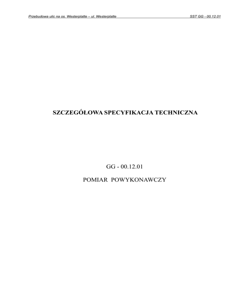 Przebudowa ulic na os. Westerplatte – ul. Westerplatte SST GG - 00.12.01 SZCZEGÓŁOWA SPECYFIKACJA TECHNICZNA GG - 00.12.01 POMIAR POWYKONAWCZY Przebudowa ulic na os. Westerplatte – ul. Westerplatte SST GG - 00.12.01 1. WSTĘP 1.1. Przedmiot SST Przedmiotem specyfikacji są wymagania dotyczące wykonania i odbioru prac geodezyjnych związanych z pomiarami powykonawczymi przy przebudowie ul. Westerplatte w Brzegu. 1.2. Zakres stosowania SST Niniejsza specyfikacja jest dokumentem przetargowym i kontraktowym przy zlecaniu i realizacji przedmiotowego zadania. 1.3. Zakres orac objętych SST Ustalenia zawarte w niniejszej specyfikacji dotyczą zasad wykonywania pomiarów powykonawczych zrealizowanych drogowych obiektów budowlanych. Zakres prac obejmuje: - prace przygotowawcze - prace polowe - prace obliczeniowe i kartograficzne. 1.4. Określenia podstawowe Wymienione poniżej określenia należy rozumieć następująco: 1.4.1. Dokumentacja geodezyjna i kartograficzna – jest to zbiór dokumentów powstałych w wyniku geodezyjnych prac polowych i kameralnych oraz opracowań kartograficznych. 1.4.2. Drogowe obiekty budowlane – droga i węzły drogowe, obiekty mostowe, ekrany akustyczne, mury oporowe. 1.4.3. Dziennik prac geodezyjnych – zeszyt z ponumerowanymi stronami, służący do notowania wszelkich uzgodnień dokonywanych między Wykonawcą i Inżynierem (Zamawiającym). 1.4.4. Granica ustalona wg stanu prawnego – jest to granica ustalona w trybie postępowania: rozgraniczeniowego, podziałowego, scalenia lub wymiany gruntów, sądowego lub innego administracyjnego ustalającego lub przenoszącego własność. 1.4.5. Kierownik prac geodezyjnych – osoba wyznaczona przez Wykonawcę, posiadająca odpowiednie uprawnienia zawodowe z zakresu geodezji i kartografii, upoważniona do kierowania pracami i do występowania w imieniu Wykonawcy w sprawach dotyczących realizacji umowy. 1.4.6. Linia rozgraniczająca – jest to linia oddzielająca tereny o różnym przeznaczeniu np. Ulicę lub drogę od gruntów rolnych lub budowlanych. 1.4.7. Mapa zasadnicza – wieloskalowe opracowanie kartograficzne, zawierające aktualne informacje o przestrzennym rozmieszczeniu obiektów ogólnogeograficznych oraz elementów ewidencji gruntów i budynków, a także sieci uzbrojenia terenu. 1.4.8. Mur (ściana) oporowy – budowla utrzymująca w stanie stateczności uskok naziomu gruntów rodzimych lub nasypowych albo innych materiałów rozdrobnionych. Funkcje murów (ścian) oporowych mogą spełniać: mury kamienne, ceglane, betonowe, żelbetowe, ściany z gruntu zbrojonego, ściany z prefabrykatów żelbetowych, konstrukcje oporowe quasi skrzyniowe itp. 1.4.9. Ośrodek dokumentacji – właściwy rzeczowo i terenowo wojewódzki ośrodek dokumentacji geodezyjnej i kartograficznej lub jego filia. 1.4.10. Pozioma osnowa geodezyjna – usystematyzowany zbiór punktów, których wzajemne położenie na powierzchni odniesienia zostało określone przy zastosowaniu techniki geodezyjnej. 1.4.11. Rzeźba terenu – ukształtowanie pionowe naturalnych form terenu. 1.4.12. Sieć uzbrojenia terenu – wszelkiego rodzaju naziemne, nadziemne i podziemne przewody i urządzenia: wodociągowe, kanalizacyjne, gazowe, cieplne, telekomunikacyjne, elektroenergetyczne i inne. 1.4.13. Wysokościowa osnowa geodezyjna – usystematyzowany zbiór punktów, których wysokość w stosunku do przyjętej powierzchni odniesienia została określona przy zastosowaniu techniki geodezyjnej. 1.4.14. Pozostałe określenia podstawowe są zgodne z obowiązującymi przepisami (odpowiednimi polskimi normami) i z definicjami podanymi w SST D-M-00.00.00 „Wymagania ogólne” pkt 1.4. Przebudowa ulic na os. Westerplatte – ul. Westerplatte SST GG - 00.12.01 1.5. Ogólne wymagania dotyczące prac geodezyjnych Pracami geodezyjnymi powinna kierować wyłącznie osoba posiadająca uprawnienia zawodowe, zgo-dnie z wymaganiami rozdziału 8 ustawy Prawo geodezyjne i kartograficzne (Dz.U. Nr 30 z 1989 r.). Wykonawca jest odpowiedzialny za ich jakość oraz zgodność z obowiązującymi przepisami prawny-mi i technicznymi, ustaleniami OST i SST oraz poleceniami Inżyniera. 1.5.1. Dokumentacja wstępna Obejmuje podstawowe informacje o zrealizowanych obiektach budowlanych, które należy objąć pomiarem powykonawczym. 1.5.2. Ochrona własności Wykonawca jest zobowiązany do ochrony przed uszkodzeniem lub zniszczeniem własności prywatnej i publicznej. W razie wyrządzenia szkód w związku z wykonywaniem prac geodezyjnych (zniszczenie: drzew, krzewów, nasadzeń, plonów itp.), Wykonawca zobowiązany jest, zgodnie z przepisami Kodeksu Cywilnego i ustawy Prawo geodezyjne i kartograficzne, do naprawienia tych szkód lub wypłacenia właścicielom odszkodowania. 1.5.3. Bezpieczeństwo i higiena pracy Wykonawca ponosi pełną odpowiedzialność za bezpieczeństwo i higienę pracy. W szczególności dotyczy to pomiarów na istniejących drogach, a także inwentaryzacji urządzeń podziemnych (otwieranie, przewietrzanie i wchodzenie do studzienek). Wykonawca zobowiązany jest zabezpieczyć roboty prowadzone na drogach publicznych odpowiednimi znakami drogowymi, zgodnie z zatwierdzonym projektem organizacji ruchu. Organizacja ruchu drogowego oraz sprzęt dla ochrony życia i zdrowia osób zatrudnionych przy wykonywaniu w/w prac nie podlegają odrębnej zapłacie. 2. MATERIAŁY Materiały do wykonywania prac geodezyjnych powinny spełniać wymagania PN i instrukcji technicznych, a ewentualne odstępstwa należy bezwzględnie uzgodnić z Inżynierem. Materiały używane do prac polowych: - jako znaki naziemne – słupki betonowe, - jako znaki podziemne – płytki betonowe z krzyżem, rurki drenarskie, butelki, - jako znaki wysokościowe – repery metalowe. Dla ustalenia rodzaju znaków: osnów poziomych i wysokościowych oraz punktów granicznych, należy korzystać z wytycznych technicznych G-1.9 „Katalog znaków geodezyjnych oraz zasady stabilizac