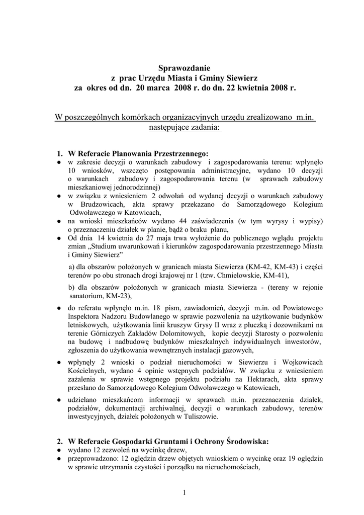 Sprawozdanie z prac Urzędu Miasta i Gminy Siewierz za okres od dn. 20 marca 2008 r. do dn. 22 kwietnia 2008 r. W poszczególnych komórkach organizacyjnych urzędu zrealizowano m.in. następujące zadania: 1. W Referacie Planowania Przestrzennego: w zakresie decyzji o warunkach zabudowy i zagospodarowania terenu: wpłynęło 10 wniosków, wszczęto postępowania administracyjne, wydano 10 decyzji o warunkach zabudowy i zagospodarowania terenu (w sprawach zabudowy mieszkaniowej jednorodzinnej) w związku z wniesieniem 2 odwołań od wydanej decyzji o warunkach zabudowy w Brudzowicach, akta sprawy przekazano do Samorządowego Kolegium Odwoławczego w Katowicach, na wnioski mieszkańców wydano 44 zaświadczenia (w tym wyrysy i wypisy) o przeznaczeniu działek w planie, bądź o braku planu, Od dnia 14 kwietnia do 27 maja trwa wyłoŜenie do publicznego wglądu projektu zmian „Studium uwarunkowań i kierunków zagospodarowania przestrzennego Miasta i Gminy Siewierz” a) dla obszarów połoŜonych w granicach miasta Siewierza (KM-42, KM-43) i części terenów po obu stronach drogi krajowej nr 1 (tzw. Chmielowskie, KM-41), b) dla obszarów połoŜonych w granicach miasta Siewierza - (tereny w rejonie sanatorium, KM-23), do referatu wpłynęło m.in. 18 pism, zawiadomień, decyzji m.in. od Powiatowego Inspektora Nadzoru Budowlanego w sprawie pozwolenia na uŜytkowanie budynków letniskowych, uŜytkowania linii kruszyw Grysy II wraz z płuczką i dozownikami na terenie Górniczych Zakładów Dolomitowych, kopie decyzji Starosty o pozwoleniu na budowę i nadbudowę budynków mieszkalnych indywidualnych inwestorów, zgłoszenia do uŜytkowania wewnętrznych instalacji gazowych, wpłynęły 2 wnioski o podział nieruchomości w Siewierzu i Wojkowicach Kościelnych, wydano 4 opinie wstępnych podziałów. W związku z wniesieniem zaŜalenia w sprawie wstępnego projektu podziału na Hektarach, akta sprawy przesłano do Samorządowego Kolegium Odwoławczego w Katowicach, udzielano mieszkańcom informacji w sprawach m.in. przeznaczenia działek, podziałów, dokumentacji archiwalnej, decyzji o warunkach zabudowy, terenów inwestycyjnych, działek połoŜonych w Tuliszowie. 2. W Referacie Gospodarki Gruntami i Ochrony Środowiska: wydano 12 zezwoleń na wycinkę drzew, przeprowadzono: 12 oględzin drzew objętych wnioskiem o wycinkę oraz 19 oględzin w sprawie utrzymania czystości i porządku na nieruchomościach, 1 przesłano korespondencję w sprawach: wycinki drzew (28 pism), decyzji o środowiskowych uwarunkowaniach 5 pism), gospodarki odpadami oraz utrzymania czystości i porządku w gminie (55 pism), wydania pozwolenia wodnoprawnego (2 pisma), geodezji i gospodarki gruntami (20 pism), sporządzono protokoły w sprawach: wycinki drzew (12 protokołów), gospodarowania odpadami oraz utrzymania czystości i porządku na nieruchomościach (37 protokołów), koordynowano akcję wyłapywania bezdomnych zwierząt i zbiórkę odpadów elektrycznych i elektronicznych, przygotowano: 1 projekt uchwały w sprawie dzierŜawy nieruchomości gruntowej, 3 zarządzenia Burmistrza (w sprawach: gospodarki odpadami, edukacji ekologicznej oraz konkursu na najpiękniejszą posesję w Gminie Siewierz) i 5 zleceń na wykonanie usług z zakresu prac geodezyjnych i kartograficznych, opracowano sprawozdanie z realizacji Programu Ochrony Środowiska dla Miasta i Gminy Siewierz na lata 2004-2015, sporządzono 6 umów na dzierŜawę gruntów gminnych, przeprowadzono: 1 pisemny przetarg nieograniczony na sprzedaŜ nieruchomości gruntowej i 2 drugie pisemne przetargi nieograniczone na sprzedaŜ nieruchomości gruntowych, ogłoszono pisemny przetarg nieograniczony na sprzedaŜ nieruchomości gruntowej, wydano: - 4 decyzje zatwierdzające projekt podziału nieruchomości, - 2 postanowienia oraz 2 decyzje o rozgraniczeniu nieruchomości, - 4 zawiadomienia o oznaczeniu nieruchomości numerami porządkowymi, - 2 kserokopie decyzji przymusowego wykupu, - 4 kserokopie aktów własności ziemi, - 2 postanowienia prostujące oczywiste omyłki w aktach własności ziemi, - 2 postanowienia przekazujące sprawę do innego organu, - 4 postanowienia określające nowy termin załatwienia sprawy, wystąpiono z wnioskami o wydanie: odpisów z ksiąg wieczystych (7 wniosków), wypisów z ewidencji gruntów (2 wnioski), prowadzono ewidencję aktów notarialnych (wpłynęło 20 sztuk), udostępniano informacje z ewidencji gruntów. 3. W Referacie Rozwoju i Inwestycji: w zakresie realizacji inwestycji: przygotowano załoŜenia do przetargów na: Opracowanie projektu termomodernizacji Zespołu Szkół w Siewierzu, Budowę boisk sportowych przy Zespołach Szkolnych w Wojkowicach Kościelnych i śelisławicach oraz Rekonstrukcję zwodzonego mostu bramnego wraz z kładką dla pieszych w ramach zabezpieczenia i udostępnienia ruin Zamku w Siewierzu, do Powiatowego Inspektoratu Nadzoru Budowlanego zgłoszono zakończenie prac, związanych z wykonaniem platformy widokowej wraz ze schodami w wieŜy bramnej Zamku w Siewierzu, przekazano do realizacji projekt budowlano – wykonawczy dla budowy kanalizacji sanitarnej w Siewierzu – etap II (Osiedle Zachód). Kanalizacja na osiedlu zostanie wybudowana przez konsorcjum firm: KEM Sp. z o.o. z Dąbrowy Górniczej, BUSKOPOL Sp. z o.o. z Buska-Zdroju oraz HYDROMEL Sp. z o.o. z Końskich. Zadanie zostanie zrealizowane za kwotę 7.495.497,00 zł. Pozyskano dziennik budowy 2 dla ww. inwestycji i zgłoszono jej rozpoczęcie do Powiatowego Inspektoratu Nadzoru Budowlanego w Będzinie, zlecono wykonanie wizualizacji terenów sportowych przy Zespole Szkół w Wojkowicach Kościelnych i stadionu LKS „Przemsza” w Siewierzu, pozyskano kosztorysy i dokumentację budowlaną na przebudowę trzech stadionów sportowych w Gminie Siewierz, zorganizowano spotkanie z właścicielami nieruchomości w Podwarpiu – Hektarach, w związku z opracowywanym projektem drogi gminnej, przygotowano i zgłoszono do Starostwa Pow