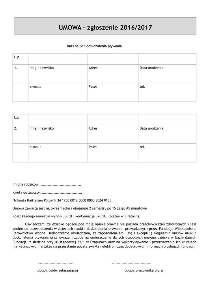 UMOWA – zgłoszenie 2016/2017 Kurs nauki i doskonalenia pływania L.p 1. Imię i nazwisko Adres Data urodzenia e-mail: Pesel tel. Imię i nazwisko Adres Data urodzenia e-mail: Pesel tel. L.p 2. Imiona rodziców:………………………………………… Kwota do zapłaty…………………………………………. Nr konta Raiffeisen Polbank 34 1750 0012 0000 0000 3024 9135 Umowa zawarta jest na okres 1 roku i obejmuje 2 semestry po 15 zajęć 45 minutowe Koszt każdego semestru wynosi 380 zł , kontynuacja 370 zł, (płatne w 3 ratach). Oświadczam, że dziecko będące pod moją opieką prawną nie posiada przeciwwskazań zdrowotnych i jest zdolne do uczestniczenia w zajęciach nauki i doskonalenia pływania, prowadzonych przez Fundacje Wielkopolskie Ratownictwo Wodne. Jednocześnie oświadczam, że zapoznałem/am się i akceptuję Regulamin kursów nauki i doskonalenia pływania oraz wyrażam zgodę na umieszczenie danych osobowych mojego dziecka w bazie danych Fundacji z siedzibą przy ul.Jagodowej 21/1 w Czapurach oraz na wykorzystywanie i przetwarzanie ich w celach marketingowych, a także na przesyłanie pocztą zwykłą i elektroniczną dodatkowych informacji o usługach fundacji. …………………………………… podpis osoby zgłaszającej ……………………………………… podpis pracownika biura Regulamin kursów nauki i doskonalenia pływania 1. Fundacja Wielkopolskie Ratownictwo Wodne prowadzi kursy nauki i doskonalenia pływania wg autorskiego programu „ Pływanie od niemowlaka do pływaka”. W skład kursu wchodzą 2 semestry po 15 jednostek lekcyjnych ( 45 min.). Celem kursu jest osiągnięcie konkretnych umiejętności określonych w programie nauczania, potwierdzonych egzaminem i otrzymaniem odpowiedniego dyplomu. 2. Warunkiem uczestnictwa w kursie jest terminowa wpłata należności zgodnie z umową, która jest jednoznaczna z akceptacją regulaminu kursu. 3. Wszystkich uczestników zajęć obowiązuje Regulamin Pływalni wywieszony w holu obiektu sportowego oraz zarządzenia Prezesa obiektu sportowego, a w szczególności: - pozostawienie okryć wierzchnich oraz butów w szatni, - wchodzenie na pływalnię wyłącznie w klapkach, - kąpiel w czepku ochronnym, - obowiązkowa kąpiel pod natryskiem przed wejściem do wody, - bezwzględny zakaz biegania oraz wykonywania skoków do wody bez zezwolenia instruktora, 4. Dbając o prawidłowy przebieg procesu nauczania oraz pełną koncentrację dzieci na zajęciach, prosimy aby podczas ich trwania rodzice opiekunowie nie przebywali na pływalni. Jeśli obecność rodziców okaże się niezbędna, instruktor prowadzący ma obowiązek powiadomić o tym fakcie. Rodzice i opiekunowie mają prawo poprosić o konsultacje z instruktorem dotyczącą rozwoju umiejętności, postępów i zachowania dziecka. 5. Osoby nie uczestniczące w kursach mogą przebywać na pływalni (trybunach) jedynie w wyznaczone dni (lekcje pokazowe, zawody). Aktualne informacje o wszystkich imprezach towarzyszących (Mikołajki, zawody, lekcje pokazowe, festyn rodzinny, zakończenie kursu) znajdują się na stronie www.fwrw.pl 6. W przypadku nieobecności na zajęciach nie przysługuje zwrot opłat. W przypadku choroby istnieje możliwość odrobienia zajęć w innym terminie, po wcześniejszym uzgodnieniu z pracownikiem fundacji. Odrabianie zajęć jest możliwe tylko i wyłącznie w ramach jednego bieżącego semestru. Z możliwości odrabiania zajęć wyłączone są lekcje pokazowe i zawody. Ze względu na ograniczoną ilość miejsc w grupie prosimy o wcześniejsze umawianie terminu odrabiania z instruktorem. 7. Pracownicy i obsługa pływalni nie ponoszą odpowiedzialności za przedmioty wartościowe pozostawione w szatniach lub na płycie pływalni. Istnieje możliwość pozostawienia rzeczy u instruktora prowadzącego. 8. Dostarczenie danych osobowych kursanta (ankieta) jest jednoznaczne : - z upoważnieniem do wpisania ich do bazy danych Fundacji mieszczącej się w Czapurach przy ul. Jagodowej 21/1 - ze zgodą na wykorzystywanie ich do przesyłania korespondencji i przetwarzania wyłącznie dla potrzeb związanych z działalnością fundacji, zgodnie z ustawą o ochronie danych osobowych.