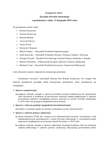 Protokół Nr 50/15 Zarządu Powiatu Sanockiego z posiedzenia w dniu 12 listopada 2015 roku W posiedzeniu udział wzięli: • Roman Konieczny • Wacław Krawczyk • Damian Biskup • Krzysztof Strzyż • Alicja Wosik • Krystyna Chrząszcz • Maryla Kopiec – Naczelnik Wydziału Organizacyjnego • Zofia Kijowska – Naczelnik Wydziału Oświaty, Promocji, Kultury i Rozwoju • Grzegorz Kozak – Dyrektor Powiatowego Centrum Pomocy Rodzinie w Sanoku • Bożena Pietruszka – Pełnomocnik do spraw Zdrowia i Pomocy Społecznej • Michała Cyran – Naczelnik Wydziału Inwestycji i Zamówień Publicznych Lista obecności stanowi załącznik do niniejszego protokołu. Posiedzenie otworzył i prowadził Starosta Pan Roman Konieczny. Na wstępie Pan Starosta przedstawił porządek obrad dzisiejszego posiedzenia, który przedstawia się następująco: 1. Sprawy organizacyjne: a) podjęcie uchwały zarządu w sprawie powołania komisji konkursowej do opiniowania ofert złożonych w konkursie na powierzenie realizacji zadania publicznego w zakresie prowadzenia punktów nieodpłatnej pomocy prawnej na terenie Powiatu Sanockiego w 2016 roku oraz przyjęcia regulaminu pracy komisji. 2. Sprawy z zakresu geodezji i gospodarki nieruchomościami: a) prośba o wyrażenie zgody na zlecenie wykonania wyceny nieruchomości 3. Sprawy z zakresu pomocy społecznej: a) pismo dyrektora PCPR dot. zmiany kwot dofinansowania kosztów uczestnictwa osób niepełnosprawnych pochodzących z terenu Powiatu Sanockiego w warsztatach terapii zajęciowej znajdujących się na terenie innych Powiatów w 2015 roku b) podjęcie uchwały zarządu w sprawie ogłoszenia otwartego konkursu ofert na realizację zadania publicznego w zakresie pomocy społecznej, dotyczącego prowadzenia domu pomocy społecznej dla 41 osób w podeszłym wieku i osób przewlekle somatycznie chorych c) informacja dyrektora odnośnie możliwości pozyskania środków 4. Sprawy z zakresu służby zdrowia: a) prośba o podjęcie uchwały zarządu w sprawie wyrażenia zgody na wydzierżawienie przez SPZOZ w Sanoku części nieruchomości (Izba Przyjęć) b) prośba o podjęcie uchwały zarządu w sprawie wyrażenia zgody na wynajem przez SPZOZ w Sanoku części nieruchomości (pomieszczenie w przychodni przy ul. Lipińskiego) c) prośba o podjęcie uchwały zarządu w sprawie wyrażenia zgody na wynajem przez SPZOZ w Sanoku części nieruchomości (powierzchnia w SPZOZ) d) prośba o podjęcie uchwały zarządu w sprawie wyrażenia zgody na wynajem przez SPZOZ w Sanoku części nieruchomości (stacja mycia i dezynfekcji łóżek) e) zaopiniowanie projektu uchwały Rady Powiatu w sprawie wyrażenia zgody na ustanowienie hipoteki na nieruchomości Powiatu Sanockiego 5. Sprawy z zakresu inwestycji i zamówień publicznych: a) prośba o podjęcie decyzji odnośnie objęcia wszystkich szkół projektem poprawa jakości kształcenia zawodowego b) prośba Wójta Gminy Tyrawa Wołoska o podjęcie działań mających na celu remont mostu w m. Siemuszowa c) zajęcie stanowiska w sprawie wyboru ofert na świadczenie usługi dostępu do internetu dla Starostwa d) wniosek Komisji Transportu, Gospodarki Nieruchomości, Rolnictwa i Ochrony Środowiska o przygotowanie informacji odnośnie wszystkich dróg 6. Sprawy z zakresu oświaty, promocji, kultury i rozwoju: a) prośba dyrektora ZS Nr 4 o przydzielenie środków finansowych na wkład własny do projektu „Narodowy Program Rozwoju Czytelnictwa” b) prośba dyrektora ZS Nr 4 w Sanoku o zwiększenie planu finansowego c) prośba dyrektora ZS Nr 5 o dokonania zmian w układzie wykonawczym d) informacja dyrektora RCRE w Sanoku o przewidywanych brakach w planie finansowym 2015 r. e) prośba dyrektora ZS Nr 2 w Sanoku o przyznanie środków finansowych na wykonanie remontów i zakupów związanych z decyzjami Sanepidu f) informacja o stanie realizacji zadań oświatowych w roku szkolnym 2014/2015 g) prośba dyrektora Podkarpackiej Szkoły Przedsiębiorczości o przyjęcie po terminie wniosku o udzielenie dotacji na 2016 rok 2 h) prośba dyrektora SOSW o wyrażenie zgody na zatrudnienie pomocy pedagogicznej i) prośba dyrektora SOSW o dofinansowanie „Mikołajkowego Dnia Sportu” j) podjęcie uchwały zarządu w sprawie upoważnienia pani M. Niemczyk dyrektora ZS Nr 4 w Sanoku k) podjęcie uchwały zarządu w sprawie upoważnienia pani J. Nazarkiewicz dyrektora ZS Nr 4 w Sanoku l) podjęcie uchwały zarządu w sprawie powołania Komisji Egzaminacyjnej dla nauczyciela kontraktowego ubiegającego się o awans na stopień nauczyciela mianowanego m) prośba UKS Niedźwiadki MOSiR o dofinansowanie wyjazdu dzieci na Ogólnopolski Turniej Hokejowy w Krynicy n) prośba Towarzystwa Miłośników Lwowa i Kresów Południowo – Wschodnich o wsparcie akcji mikołajkowej o) prośba dyrektora Muzeum Historycznego w Sanoku o przedłużenie okresu rozpoczęcie kolejnej komisyjnej kontroli wpisów dokumentacji ewidencyjnej 7. Sprawy z zakresu komunikacji i transportu: a) zaopiniowanie projektu uchwały Rady Powiatu w sprawie ustalenia wysokości opłat za usunięcie pojazdu z drogi i jego parkowanie na parkingu strzeżonym oraz wysokości kosztów powstałych w przypadku odstąpienia od usunięcia pojazdu 8. Sprawy budżetowe: a) prośba p.o. dyrektora PZD w Sanoku o zwrot dochodów za zajęcie pasa drogowego b) podjęcie uchwały zarządu w sprawie likwidacji mienia ruchomego w Starostwie Powiatowym w Sanoku c) podjęcie uchwały zarządu w sprawie zmiany uchwały budżetowej Powiatu Sanockiego na 2015 rok (5.330zł - ZS Nr 4) d) podjęcie uchwały zarządu w sprawie zmiany uchwały budżetowej Powiatu Sanockiego na 2015 rok (2.330 zł - ZS Nr 2) e) podjęcie uchwały zarządu w sprawie zmiany uchwały budżetowej Powiatu Sanockiego na 2015 rok (4.000 zł - PZD, 35.170 zł - PUP) f) podjęcie uchwały zarządu w sprawie zmiany uchwały budżetowej Powiatu Sanockiego na 2015 rok (700 zł – PINB) g) podjęcie uchwały zarządu w