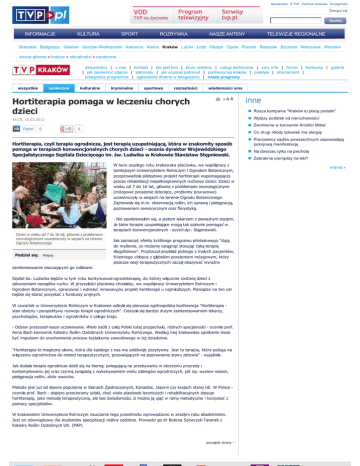 Abonament O TVP Centrum prasowe Dostępnoś ć Zaloguj się INFORMACJE KULTURA SPORT ROZRYWKA NASZE ANTENY TELEWIZJE REGIONALNE Białystok Bydgoszcz Gdańsk Gorzów Wielkopolski Katowice Kielce Kraków Lublin Łódź Olsztyn Opole Poznań Rzeszów Szczecin Warszawa Wrocław strona główna » kraków » aktualności » społeczne aktualności | o nas | kontakt | kto jest kim | biuro reklamy | u sługi techniczne | sms info | forum | konkursy | galerie | jak zamieścić zdjęcie | patronaty | jak uzyskać patronat | partnerzy tvp kraków | praktyki | abonament | przegrania programów | ogłoszenia drobne w telegazecie | nasze programy wszystkie społeczne kulturalne kryminalne sportowe rozmaitości wiadomości sms Hortiterapia pomaga w leczeniu chorych dzieci Rusza kampania "Kraków tu płacę podatki" Wyższy podatek od nieruchomości 14:19, 15.03.2012 Zwolnienia w koncernie Arcellor Mittal Fajne! 0 0 Co drugi młody człowiek ma alergię Hortiterapia, czyli terapia ogrodnicza, jest terapią uzupełniającą, która w znakomity sposób pomaga w terapiach konwencjonalnych chorych dzieci - ocenia dyrektor Wojewódzkiego Specjalistycznego Szpitala Dziecięcego im. św. Ludwika w Krakowie Stanisław Stępniewski. W lecie zeszłego roku krakowska placówka, we współpracy z tamtejszym Uniwersytetem Rolniczym i Ogrodem Botanicznym, przeprowadziła pilotażowy projekt hortiterapii wspomagającej proces rehabilitacji niepełnosprawnych ruchowo dzieci. Dzieci w wieku od 7 do 16 lat, głównie z problemami neurologicznymi (mózgowe porażenie dziecięce, problemy pourazowe) uczestniczyły w sesjach na terenie Ogrodu Botanicznego. Zajmowały się m.in. obserwacją roślin, ich uprawą i pielęgnacją, poznawaniem sensorycznym oraz florystyką. - Nie spodziewałem się, a jestem lekarzem z poważnym stażem, że takie terapie uzupełniające mogą tak szalenie pomagać w terapiach konwencjonalnych - ocenił dyr. Stępniewski. Dzieci w wieku od 7 do 16 lat, głównie z problemami neurologicznymi uczestniczyły w sesjach na terenie Ogrodu Botanicznego Podziel się: Więcej Jak zaznaczył, efekty krótkiego programu pilotażowego "dają do myślenia, co możemy osiągnąć stosując taką terapię długofalowo". Przytoczył przykład jednego z małych pacjentów, 9-letniego chłopca z głębokim porażeniem mózgowym, który podczas sesji terapeutycznych zaczął okazywać wyraźne zainteresowanie otaczającymi go roślinami. Szpital św. Ludwika będzie w tym roku kontynuował ogrodoterapię, do której włączone zostaną dzieci z zaburzeniami narządów ruchu. W przyszłości placówka chciałaby, we współpracy Uniwersytetem Rolniczym i Ogrodem Botanicznym, opracować i wdrożyć innowacyjny projekt hortiterapii u najmłodszych. Pieniądze na ten cel będzie się starać pozyskać z funduszy unijnych. W czwartek w Uniwersytecie Rolniczym w Krakowie odbyła się pierwsza ogólnopolska konferencja "Hortiterapia stan obecny i perspektywy rozwoju terapii ogrodniczych". Cieszyła się bardzo dużym zainteresowaniem lekarzy, psychologów, terapeutów i ogrodników z całego kraju. - Odzew przeszedł nasze oczekiwania. Wiele osób z całej Polski tutaj przyjechało, różnych specjalności - oceniła prof. Anna Bach kierownik Katedry Roślin Ozdobnych Uniwersytetu Rolniczego. Według niej krakowskie spotkanie może być impulsem do uruchomienia procesu kształcenia zawodowego w tej dziedzinie. "Hortiterapia to magiczne słowo, która dla każdego z nas ma oddźwięk pozytywny. Jest to terapia, która polega na włączeniu ogrodnictwa do metod terapeutycznych, pozwalających na poprawienie stanu zdrowia" - wyjaśniła. Jak dodała terapia ogrodnicza dzieli się na bierną: polegającą na przebywaniu w otoczeniu przyrody i kontemplowaniu jej oraz czynną związaną z wykonywaniem wielu zabiegów ogrodniczych, jak np. wysiew nasion, pielęgnacja roślin, zbiór owoców. Metoda jest już od dawna popularna w Stanach Zjednoczonych, Kanadzie, Japonii czy krajach starej UE. W Polsce oceniła prof. Bach - dopiero przecieramy szlaki, choć wiele placówek leczniczych i rehabilitacyjnych stosuje hortiterapię, jako metodę terapeutyczną, ale bez świadomości, iż można ją ująć w ramy metodyczne i korzystać z pomocy specjalistów. W krakowskim Uniwersytecie Rolniczym nauczanie tego przedmiotu wprowadzono w zeszłym roku akademickim. Jest on obowiązkowy dla studentów specjalizacji rośliny ozdobne. Prowadzi go dr Bożena Szewczyk-Taranek z Katedry Roślin Ozdobnych UR. (PAP) początek strony ^ Pracownicy sądów powszechnych zapowiadają pokojową manifestację Na dworzec tylko na piechotę Zabraknie pieniędzy na leki? więcej » zobacz także Abonament TVP Rada Programowa Zgłoś program (ROPAT) Zamówienia publiczne Zgłoś nadużycie w sieci tvp regionalne Centrum prasowe Program dla prasy Serwis fotograficzny Sklep TVP Emisja w TVP Reklama w tvp.pl Oferta handlowa Telegazeta ogłoszenia Biuro Reklamy Naziemna Telewizja Cyfrowa Odbiór programów TVP Merchandising (znaki) regulamin tvp.pl | pomoc | polityka prywatności | redakcja | newsletter | kontakt Białystok Bydgoszcz Gdańsk Gorzów Wlkp. Katowice Kielce Kraków Lublin Łódź Olsztyn Opole Poznań Rzeszów Szczecin Warszawa Wrocław © 2012 Telewizja Polska S.A.