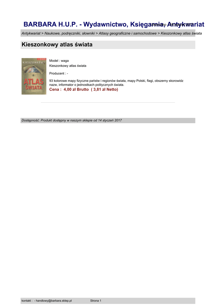 Utworzono Antykwariat : 08 marzec 2017 BARBARA H.U.P. - Wydawnictwo, Księgarnia, Antykwariat > Naukowe, podręczniki, słowniki > Atlasy geograficzne i samochodowe > Kieszonkowy atlas świata Kieszonkowy atlas świata Model : waga Kieszonkowy atlas świata Producent : 93 kolorowe mapy fizyczne państw i regionów świata, mapy Polski, flagi, obszerny skorowidz nazw, informator o jednostkach politycznych świata. Cena : 4,00 zł Brutto ( 3,81 zł Netto) Dostępność: Produkt dostępny w naszym sklepie od 14 styczeń 2017 kontakt : - [email protected] Strona 1