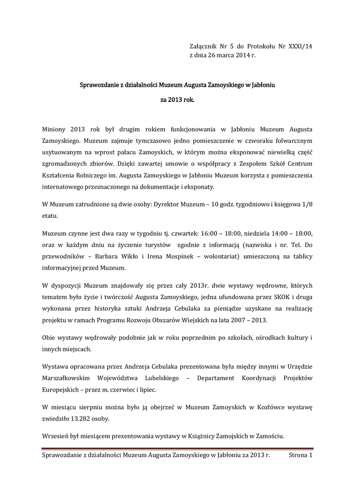 Załącznik Nr 5 do Protokołu Nr XXXI/14 z dnia 26 marca 2014 r. Sprawozdanie z działalności Muzeum Augusta Zamoyskiego w Jabłoniu za 2013 rok. Miniony 2013 rok był drugim rokiem funkcjonowania w Jabłoniu Muzeum Augusta Zamoyskiego. Muzeum zajmuje tymczasowo jedno pomieszczenie w czworaku folwarcznym usytuowanym na wprost pałacu Zamoyskich, w którym można eksponować niewielką część zgromadzonych zbiorów. Dzięki zawartej umowie o współpracy z Zespołem Szkół Centrum Kształcenia Rolniczego im. Augusta Zamoyskiego w Jabłoniu Muzeum korzysta z pomieszczenia internatowego przeznaczonego na dokumentacje i eksponaty. W Muzeum zatrudnione są dwie osoby: Dyrektor Muzeum – 10 godz. tygodniowo i księgowa 1/8 etatu. Muzeum czynne jest dwa razy w tygodniu tj. czwartek: 16:00 – 18:00, niedziela 14:00 – 18:00, oraz w każdym dniu na życzenie turystów zgodnie z informacją (nazwiska i nr. Tel. Do przewodników – Barbara Wikło i Irena Mospinek – wolontariat) umieszczoną na tablicy informacyjnej przed Muzeum. W dyspozycji Muzeum znajdowały się przez cały 2013r. dwie wystawy wędrowne, których tematem było życie i twórczość Augusta Zamoyskiego, jedna ufundowana przez SKOK i druga wykonana przez historyka sztuki Andrzeja Cebulaka za pieniądze uzyskane na realizację projektu w ramach Programu Rozwoju Obszarów Wiejskich na lata 2007 – 2013. Obie wystawy wędrowały podobnie jak w roku poprzednim po szkołach, ośrodkach kultury i innych miejscach. Wystawa opracowana przez Andrzeja Cebulaka prezentowana była między innymi w Urzędzie Marszałkowskim Województwa Lubelskiego – Departament Koordynacji Projektów Europejskich – przez m. czerwiec i lipiec. W miesiącu sierpniu można było ją obejrzeć w Muzeum Zamoyskich w Kozłówce wystawę zwiedziło 13.282 osoby. Wrzesień był miesiącem prezentowania wystawy w Książnicy Zamojskich w Zamościu. Sprawozdanie z działalności Muzeum Augusta Zamoyskiego w Jabłoniu za 2013 r. Strona 1 W październiku uczniowie Gimnazjum w Siemieniu dzięki goszczeniu u siebie wystawy mogli poznać życie i twórczość wielkiego artysty rzeźbiarza. Przez okres niemal trzech miesięcy wystawa eksponowana była w „Milton Hotels” w Sobieniach Królewskich pod Warszawą. Wystawa SKOKU prócz krótkich pobytów w Szkołach wystawiona była w Zespole Szkół Centrum Kształcenia Rolniczego im. Augusta Zamoyskiego w czasie trwania Ogólnopolskiego Pleneru Rzeźbiarskiego. Obie wystawy w ciągu 2013 r. obejrzało 17.000 osób. Prezentacja wystaw połączona była z prelekcją związaną tematycznie z twórczością artysty a także wzbogacana ekspozycją kopii rzeźb Augusta Zamoyskiego powstałych w czasie Ogólnopolskiego Pleneru Rzeźbiarskiego pn. „Lato z Augustem Zamoyskim”- 2013 r. Przez okres całego roku Muzeum jest organizatorem lekcji muzealnych, które odbywały się w Szkołach lub w pomieszczeniu muzealnym. Ogółem przeprowadzono 13 lekcji muzealnych. W każdy czwartek (16:00 – 18:00) i niedzielę (14:00 – 18:00) Muzeum jest udostępniane dla zwiedzających a także w każdy inny dzień na życzenie turystów, co zdarza się dosyć często zwłaszcza w okresie letnim. W ciągu roku Muzeum odwiedziło około 500 osób w tym wiele osób z terenów bardzo odległych np. Zakopane, Wrocław czy Paryż. Muzeum wypożycza gromadzone prace naukowe osobom zainteresowanym a są to głównie młode osoby piszące prace magisterskie lub licencjackie pochodzące z naszego regionu. Ostatnio wypożyczono materiały osobie piszącej pracę doktorską n. Zamoyskich linii Włodawskiej. Muzeum prowadzi szerokie kontakty z pracownikami innych muzeów, a artystami, z historykami sztuki i z innymi instytucjami kulturalnymi. Stała współpraca z Muzeum Literatury im. Adama Mickiewicza w Warszawie, z Muzeum Zamoyskich w Kozłówce, z Lubelskim Oddziałem Historyków Sztuki oraz z artystami takimi jak np. Anna Grocholska i innymi wybitnymi twórcami pozwala na właściwie ukierunkowanie działań Muzeum. W 2013 roku powstała strona internetowa Muzeum i ciągle jeszcze trwa jej uzupełnianie, odbywają się konsultację i wybór właściwych zdjęć czy tekstów. Sprawozdanie z działalności Muzeum Augusta Zamoyskiego w Jabłoniu za 2013 r. Strona 2 Cały czas trwa porządkowanie eksponatów znalezionych w „ rządcówce” a przekazanych przez Irenę Mospinek, (archiwizacja, itp.) a także inne prace inwentarzowe, które mogą być kontynuowane już w stałym miejscu przeznaczonym na Muzeum, gdzie będą właściwe do tej pracy warunki. Muzeum przez cały rok włącza się w działania związane z organizacją wielu imprez kulturalnych na terenie Gminy Jabłoń i jest obecne tam , gdzie wymaga tego scenariusz imprez. Muzeum jest głównym organizatorem Majowych Spotkań z Augustem Zamoyskim. 19 maja 2013r. w Muzeum została otwarta stała wystawa pt. „August Zamoyski w Brazylii”, a przed pałacem Zamoyskich można było obejrzeć materiały archiwalne z folwarku Zamoyskich w Jabłoniu. Bardzo interesujące były programy przygotowane przez dzieci i młodzież wszystkich Szkól z terenu całej Gminy. Szkoły przedstawiały „Bohaterów’ swoich miejscowości. Bardzo ważną imprezą był Ogólnopolski Plener rzeźbiarski pn. „Lato z Augustem Zamoyskim”, który mógł być zrealizowany dzięki pieniądzom otrzymanym z projektu w ramach Programu Rozwoju Obszarów Wiejskich na lata 2007 – 2013 tzw. małych Projektów. Sprawozdanie przygotowane przez Dyrektor Muzeum Augusta Zamoyskiego w Jabłoniu p. Barbarę Wikło. Sprawozdanie z działalności Muzeum Augusta Zamoyskiego w Jabłoniu za 2013 r. Strona 3