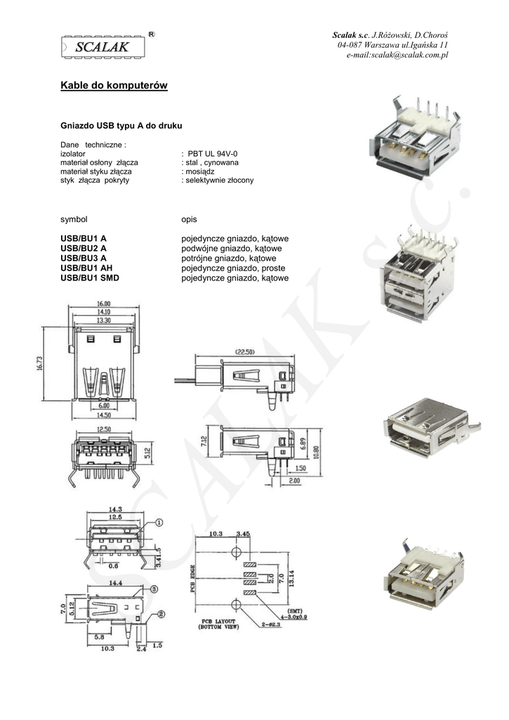 Scalak s.c. J.Różowski, D.Choroś 04-087 Warszawa ul.Igańska 11 e-mail:[email protected] Kable do komputerów Gniazdo USB typu A do druku Dane techniczne : izolator materiał osłony złącza materiał styku złącza styk złącza pokryty : PBT UL 94V-0 : stal , cynowana : mosiądz : selektywnie złocony symbol opis USB/BU1 A USB/BU2 A USB/BU3 A USB/BU1 AH USB/BU1 SMD pojedyncze gniazdo, kątowe podwójne gniazdo, kątowe potrójne gniazdo, kątowe pojedyncze gniazdo, proste pojedyncze gniazdo, kątowe Scalak s.c. J.Różowski, D.Choroś 04-087 Warszawa ul.Igańska 11 e-mail:[email protected] Gniazdo USB typu B do druku Dane techniczne : izolator materiał osłony złącza materiał styku złącza styk złącza pokryty : PBT UL 94V-0 : stal , cynowana : mosiądz : selektywnie złocony symbol USB/BU1 B USB/BU1 BH opis pojedyncze gniazdo, kątowe pojedyncze gniazdo, proste Scalak s.c. J.Różowski, D.Choroś 04-087 Warszawa ul.Igańska 11 e-mail:[email protected] Wtyk USB typu A na kabel Dane techniczne : izolator materiał osłony złącza : PBT UL 94V-0 : stal , cynowana symbol USB/ ST1 A Wtyk USB typu B na kabel Dane techniczne : izolator materiał osłony złącza symbol USB/ ST1 B : PBT UL 94V-0 : stal , cynowana