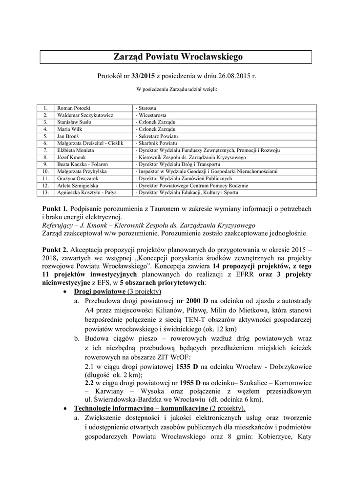 Zarząd Powiatu Wrocławskiego Protokół nr 33/2015 z posiedzenia w dniu 26.08.2015 r. W posiedzeniu Zarządu udział wzięli: 1. 2. 3. 4. 5. 6. 7. 8. 9. 10. 11. 12. 13. Roman Potocki Waldemar Szczykutowicz Stanisław Susło Maria Wilk Jan Bronś Małgorzata Dreiseitel - Cieślik Elżbieta Monieta Józef Kmonk Beata Kaczka - Folaron Małgorzata Przybylska Grażyna Owczarek Arleta Szmigielska Agnieszka Kosztyło - Pałys - Starosta - Wicestarosta - Członek Zarządu - Członek Zarządu - Sekretarz Powiatu - Skarbnik Powiatu - Dyrektor Wydziału Funduszy Zewnętrznych, Promocji i Rozwoju - Kierownik Zespołu ds. Zarządzania Kryzysowego - Dyrektor Wydziału Dróg i Transportu - Inspektor w Wydziale Geodezji i Gospodarki Nieruchomościami - Dyrektor Wydziału Zamówień Publicznych - Dyrektor Powiatowego Centrum Pomocy Rodzinie - Dyrektor Wydziału Edukacji, Kultury i Sportu Punkt 1. Podpisanie porozumienia z Tauronem w zakresie wymiany informacji o potrzebach i braku energii elektrycznej. Referujący – J. Kmonk – Kierownik Zespołu ds. Zarządzania Kryzysowego Zarząd zaakceptował w/w porozumienie. Porozumienie zostało zaakceptowane jednogłośnie. Punkt 2. Akceptacja propozycji projektów planowanych do przygotowania w okresie 2015 – 2018, zawartych we wstępnej „Koncepcji pozyskania środków zewnętrznych na projekty rozwojowe Powiatu Wrocławskiego”. Koncepcja zawiera 14 propozycji projektów, z tego 11 projektów inwestycyjnych planowanych do realizacji z EFRR oraz 3 projekty nieinwestycyjne z EFS, w 5 obszarach priorytetowych: Drogi powiatowe (3 projekty) a. Przebudowa drogi powiatowej nr 2000 D na odcinku od zjazdu z autostrady A4 przez miejscowości Kilianów, Piławę, Milin do Mietkowa, która stanowi bezpośrednie połączenie z siecią TEN-T obszarów aktywności gospodarczej powiatów wrocławskiego i świdnickiego (ok. 12 km) b. Budowa ciągów pieszo – rowerowych wzdłuż dróg powiatowych wraz z ich niezbędną przebudową będących przedłużeniem miejskich ścieżek rowerowych na obszarze ZIT WrOF: 2.1 w ciągu drogi powiatowej 1535 D na odcinku Wrocław - Dobrzykowice (długość ok. 2 km); 2.2 w ciągu drogi powiatowej nr 1955 D na odcinku– Szukalice – Komorowice – Karwiany – Wysoka oraz połączenie z węzłem przesiadkowym ul. Świeradowska-Bardzka we Wrocławiu (dł. odcinka 6 km). Technologie informacyjno – komunikacyjne (2 projekty). a. Zwiększenie dostępności i jakości elektronicznych usług oraz tworzenie i udostępnienie otwartych zasobów publicznych dla mieszkańców i podmiotów gospodarczych Powiatu Wrocławskiego oraz 8 gmin: Kobierzyce, Kąty Wrocławskie, Siechnice, Długołęka, Czernica, Mietków, Jordanów Śląski i Żórawina”. b. Modernizacja i rozbudowa systemów informatycznych do świadczenia e-usług wraz z pozyskaniem danych przez Powiaty Województwa Dolnośląskiego.. Projekt koordynowany przez Związek Powiatów Województwa Dolnośląskiego (udział 26 powiatów, w tym Powiat Wrocławski ok. 3 mln zł ) Edukacja (6 projektów: 3 z EFRR i 3 z EFS). a. Poprawa warunków kształcenia zawodowego w szkołach ponadgimnazjalnych zawodowych Powiatu Wrocławskiego: w Powiatowym Zespole Szkół nr 1 w Krzyżowicach poprzez adaptację poddasza budynku głównego szkoły oraz modernizację bazy dydaktycznej wraz z niezbędnym wyposażeniem oraz w Młodzieżowym Ośrodku Wychowawczym w Sobótce poprzez modernizację bazy dydaktycznej oraz w zakresie nauk cyfrowych. b. Poprawa warunków nauczania w szkołach specjalnych Powiatu Wrocławskiego, poprzez rozbudowę Specjalnego Ośrodka SzkolnoWychowawczego w Kątach Wrocławskich i wyposażenie szkoły w sprzęt oraz zakup wyposażenia do Zespołu Szkół Specjalnych w Wierzbicach. c. Poprawa warunków kształcenia w szkołach ponadgimnazjalnych Powiatu Wrocławskiego poprzez rozwój infrastruktury szkół w zakresie nauk cyfrowych. d. Różne formy terapii wspomagające rozwój uczniów szkół podstawowych, gimnazjalnych i ponadgimnazjalnych Powiatu Wrocławskiego. e. Projekt na rzecz integracji społeczno-zawodowej z elementami usług specjalistycznego poradnictwa dla wychowanek przebywających w Młodzieżowym Ośrodku Wychowawczym w Sobótce. f. Mam zawód – mam szansę. Poprawa efektywności energetycznej budynków użyteczności publicznej (1 projekt). 1.Poprawa efektywności energetycznej oraz ograniczenie niskiej emisji w budynkach użyteczności publicznej będących własnością Powiatu Wrocławskiego. a) Etap I – Modernizacja systemu grzewczego poprzez budowę nowej kotłowni wraz z sieciami oraz termomodernizacją obiektów wchodzących w skład Powiatowego Zespołu Szkół nr 1 w Krzyżowicach; b) Etap II – poprawa efektywności energetycznej w Młodzieżowym Ośrodku Wychowawczym w Sobótce oraz w Powiatowym Zespole Szkół nr 3 w Sobótce; c) Etap III – Starostwo Powiatowe we Wrocławiu (fotowoltaika). Opieka Społeczna a. Modernizacja infrastruktury wraz z zagospodarowaniem terenu Domu Dziecka w Kątach Wrocławskich. b. Budowa ośrodka wsparcia – Środowiskowego Domu Samopomocy wraz z zagospodarowaniem otoczenia w zieleń i drobną architekturę. Referujący – E. Monieta – Dyrektor Wydziału Funduszy Zewnętrznych, Promocji i Rozwoju Po dyskusji Zarząd jednogłośnie zaakceptował w/w propozycje. Punkt 3. Informacja dotycząca podjęcia prac w zakresie przygotowania dokumentacji projektowej oraz zabezpieczenie środków w budżecie powiatu dla niżej wymienionych projektów: 1) Droga powiatowa 2000D – Studium Wykonalności oraz Projekt Budowlany z pozwoleniem na budowę, PT (ogłoszenie konkursu – listopad 2015 r.), pozostałe drogi (SW – ogłoszenie naboru – kwiecień 2016 r.) 2) Projekt informatyczny e-urząd planowany w partnerstwie 8 gmin – Studium Wykonalności (ogłoszenie konkursu – grudzień 2015 r.) Zarząd postanowił wprowadzić w/w projekty do Wieloletniej Prognozy Finansowej i zarezerwować środki w budżecie na 2015