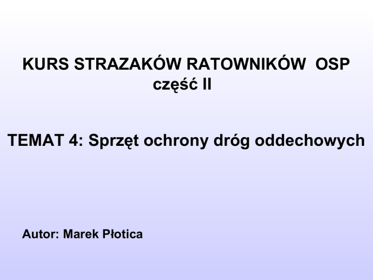 KURS STRAZAKÓW RATOWNIKÓW OSP część II TEMAT 4: Sprzęt ochrony dróg oddechowych Autor: Marek Płotica Proces oddychania Oddychanie jest to proces pobierania przez organizm tlenu z powietrza oraz wydzielania dwutlenku węgla powstałego w wyniku zachodzących w organizmie procesów życiowych. Skład powietrza 1% innych gazów to: dwutlenek węgla, argon, wodór, ksenon, neon, krypton, hel. Drogi oddechowe Układ krwionośny Pojemność płuc V - pojemność oddechowa, Vż - pojemność życiowa, Vwd - zapasowa pojemność wdechowa, Vz - objętość zalegająca, Vwy - zapasowa pojemność wydechowa, Vc -całkowita pojemność. Drogi wnikania niebezpiecznych substancji do organizmu Drogi oddechowe – poprzez oddychanie. Śluzówki – poprzez przebywania w skażonej atmosferze. Drogi pokarmowe – poprzez spożycie. Skóra – poprzez działanie na skórę. Krew – poprzez ugryzienie, wstrzyknięcie, działanie na uszkodzoną skórę. Zapotrzebowanie organizmu na powietrze Wykonywana czynność Zapotrzebowanie płuc w l/min Odpoczynek w pozycji leżącej 6 Pozycja siedząca 7 Pozycja stojąca 8 Praca lekka - spacer 18 Praca średnio ciężka - marsz 30 Praca ciężka - bieg 50 Praca bardzo ciężka 100 Objawy niedotlenienia apatia, wzmożone zaufanie do siebie, silne pobudzenie, zaniki pamięci, bezsenność, osłabienie, nudności, zaburzenie koordynacji ruchów, ból głowy, omdlenia, zaburzenia psychiczne, przyspieszenie akcji serca, sinica, drgawki. Podział sprzętu oddechowego stosowanego w straży Sprzęt ochrony dróg oddechowych Sprzęt filtracyjny Sprzęt izolacyjny Aparaty o obiegu otwartym Aparaty podciśnieniowe Aparaty o obiegu zamkniętym Aparaty nadciśnieniowe Warunki stosowania sprzętu filtracyjnego 1. Zawartość tlenu nie może być mniejsza od 17%. 2. Ilość szkodliwych związków nie może przekraczać wartości krytycznej. 3. Posiadamy pochłaniacz odpowiedni dla występującego gazu. Sprzęt filtrujący Maska dwudrożna Wąż Filtropochłaniacz Zawór zwrotny maski Maska dwudrożna typ GSM 1 - zawór wdechowy, 2 - zawór wydechowy, 3 - wycieraczka szyby, 4 - pokrętło wycieraczki. Przestrzeń martwa maski Schemat działania aparatu tlenowego Reduktor dwustopniowy o stopniach połączonych Reduktor dwustopniowy o stopniach rozłączonych Elementy aparatu o obiegu otwartym maska, automat oddechowy, wąż średniego ciśnienia, pasy nośne naramienne, butle, pas biodrowy, zawór odcinający, stelaż, manometr, - wąż wysokiego ciśnienia, - mocowanie butli, - reduktor, - sygnalizator akustyczny. Aparat powietrzny Schemat budowy aparatu AP 3 Reduktor dwustopniowy o stopniach połączonych 1 - butla, 2 - zawór odcinający, 3 - reduktor, 4 - sygnalizator akustyczny, 5 - wąż oddechowy, 6 - maska, 7 - przewód wysokociśnieniowy, 8 - manometr. Cechy wybite na butlach Butla stalowa i kompozytowa Aparat z butlą kompozytową Stelaż W przedstawionym obok stelażu zamontowany jest reduktor z sygnalizatorem akustycznym i wąż wysokiego ciśnienia z manometrem. 1 - stelaż, 2 - reduktor, 3 - pasy mocujące butlę, 4 - pasy naramienne, 5 - wąż wysokiego ciśnienia, 6 - manometr, 7 - pas biodrowy. Widok aparatu FASER APS 2/2 - 50 Aparat powietrzny FASER APS/3 Reduktor dwustopniowy o stopniach rozdzielonych 1 - butla, 2 - zawór odcinający, 3 - reduktor, 4 - automat oddechowy, 5 - maska, 6 - manometr, 7 - sygnalizator akustyczny. Czynności przy zakładaniu i zdejmowaniu maski Maska podciśnieniowa Części składowe maski Maska Przepływ powietrza przez maskę Manometr Zasada działania manometru - rurka Burdona Zintegrowany czujnik kontrolny bezprzewodowy na wężu wysokiego ciśnienia Okulary mocowane w masce Czujnik bezruchu Urządzenie foniczne podhełmowe Aparaty z funkcją ewakuacji poszkodowanych z maską pełnotwarzową z kapturem Przewożenie aparatów w samochodzie Czynności sprawdzające przed pracą aparatu 1. Uszkodzenia mechaniczne. 2. Plomby serwisowe. 3. Umocowanie i dokręcenie butli. 4. Działanie sygnalizatora. 5. Ciśnienie w butlach. 6. Szczelność aparatu. 7. Szczelność maski. 8. Kontrola pracy aparatu. Zasady bhp w trakcie pracy 1. 2. 3. 4. 5. 6. 7. 8. Nie uszkodzić mechanicznie aparatu. Nie odsunąć lub zerwać maski. Monitorować ciśnienie w butlach. W momencie zadziałania sygnalizatora opuścić strefę skażoną. Używać czujnika bezruchu. Używać sprzęt zgodnie z instrukcją. Używać sprzęt tylko na polecenie dowódcy. Utrzymywać łączność. 9. Wyjąć protezy zębowe. Komora treningowa Stanowisko kontrolne komory treningowej Zadymianie komory Ćwiczenia przed wejściem do komory Pokonywanie toru w komorze Przeszkody na torze Wykorzystano: Kosiński J.: Sprzęt ochrony dróg oddechowych. Wyższa Oficerska Szkoła Pożarnicza, Warszawa 1971. Rozmarynowicz M, Horak J, Jankowski K.: Ochrona dróg oddechowych. Instytut Wydawniczy CRZZ, Warszawa 1978. Zaremba A.: O budowie i czynnościach ciała ludzkiego. Państwowy. Zakład Wydawnictw Lekarskich, Warszawa 1975. Gil D: Wyposażenie osobiste i ochronne strażaka. Szkoła Podoficerska PSP. Bydgoszcz 2004. Historia Fabryki Sprzętu Ratunkowego i Lamp Górniczych „FASER” Tarnowskie Góry 2004. Instrukcje użycia, Instrukcje użytkowania, Instrukcje obsługi, materiały szkoleniowe i reklamowe firm; FASER, FENZY, MSA AUER, DREAGER, SCOTT, INTERSPIRO. DZIĘKUJĘ ZA UWAGĘ