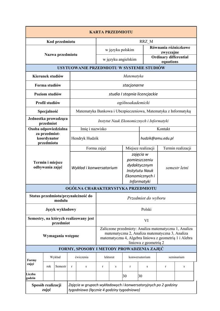 KARTA PRZEDMIOTU RRZ_M Równania różniczkowe w języku polskim zwyczajne Ordinary differential w języku angielskim equations Kod przedmiotu Nazwa przedmiotu USYTUOWANIE PRZEDMIOTU W SYSTEMIE STUDIÓW Kierunek studiów Matematyka Forma studiów stacjonarne Poziom studiów studia I stopnia licencjackie Profil studiów ogólnoakademicki Specjalność Matematyka Bankowa i Ubezpieczeniowa, Matematyka z Informatyką Jednostka prowadząca Instytut Nauk Ekonomicznych i Informatyki przedmiot Imię i nazwisko Kontakt Osoba odpowiedzialna za przedmiotkoordynator Hendryk Hudzik [email protected] przedmiotu Forma zajęć Miejsce realizacji Termin realizacji Termin i miejsce odbywania zajęć Wykład i konwersatorium zajęcia w pomieszczeniu dydaktycznym Instytutu Nauk Ekonomicznych i Informatyki semestr letni OGÓLNA CHARAKTERYSTYKA PRZEDMIOTU Status przedmiotu/przynależność do modułu Przedmiot do wyboru Język wykładowy Polski Semestry, na których realizowany jest przedmiot VI Wymagania wstępne Zaliczone przedmioty: Analiza matematyczna 1, Analiza matematyczna 2, Analiza matematyczna 3, Analiza matematyczna 4, Algebra liniowa z geometrią 1 i Alebra liniowa z geometrią 2 FORMY, SPOSOBY I METODY PROWADZENIA ZAJĘĆ Formy zajęć Wykład rok Semestr Liczba godzin Sposób realizacji zajęć ćwiczenia r s lektorat r konwersatorium s r 30 s seminarium r 30 Zajęcia w grupach wykładowych i konwersatoryjnych po 2 godziny tygodniowo (łącznie 4 godziny tygodniowo) s Egzamin obejmujący zagadnienia teoretyczne i umiejętności rozwiązywania wszystkich typów zadań Słowne (wykład, dyskusja) Metody dydaktyczne Praktyczne (rozwiązywanie zadań) Sposób zaliczenia zajęć Przedmioty powiązane/moduł Wykaz literatury Podstawowa Uzupełnia jąca Przedmioty do wyboru 1. Krusemeyer Mark, „Differential Equations”, Macmillan College Publishing Company, Inc, New York, 1994. 2. W. W. Stiepanow, „Równania różniczkowe”, PWN, Warszawa 1964. 3. N. M. Matwiejew, „Zadania z równań różniczkowych zwyczajnych” (tłumaczenie Jerzego Koźmińskiego), PWN, Warszawa, 1976r. 4. Otto Nikodem, „Równania Różniczkowe”, Księgarnia Akademicka, Poznań 1949r. 5. Andrzej Sołtysiak, „Analiza Matematyczna”, Część II, Wydawnictwo Naukowe UAM, Poznań. 6. W. Krysicki, L. Włodarski, „Zbiór zadań z analizy matematycznej”, cz. II, Wydawnictwo Naukowe PWN, Warszawa, 2007r. 1. A. Pelczar, J. Szarski, Wstęp do teorii równań różniczkowych, Część I , PWN, Warszawa 1987. 2. I.G. Pietrowski, Równania różniczkowe zwyczajne, PWN, Warszawa 1967. CELE, TREŚCI I EFEKTY KSZTAŁCENIA Cele przedmiotu (ogólne, szczegółowe) 1. Opanowanie metod rozwiązywania podstawowych typów równań różniczkowych. 2. Opanowanie sposobów rozwiązywania układów równań różniczkowych liniowych. 3. Opanowanie poszukiwania rozwiązań równania różniczkowego spełniającego zadane warunki początkowe metodą rozwijania poszukiwanej funkcji w szereg potęgowy i metodą zastosowania transformaty Laplace’a. 4. Podstawowa wiedza o zastosowaniach równań różniczkowych: obwiednia rodziny krzywych, trajektorie ortogonalne, opisy pewnych zjawisk fizycznych i biologicznych. Treści programowe Efekty kształcenia (kody) W1, W2, W3, U3 Forma zajęć W3, U3 W3, U3 W3, U3 W3, U3 W3, U3 W3, U2, U3 W3, U2, U3 W3, U2, U3 W3, U2, U3 U5, U4, U6 W3 Wykład i konwersat orium Temat Liczba godzin Ogólna postać równania różniczkowego. Zagadnienia Cauchy’ego (twierdzenia Peano i Picarda). 1 Równania o zmiennych rozdzielonych. Równania jednorodne; przykłady zastosowań (radioaktywne skażenie i wzrost populacji). Równania liniowe jednorodne i niejednorodne pierwszego rzędu (metoda uzmienniania stałej; metoda redukcji). Równania Bernoulliego (sprowadzanie ich do równań liniowych pierwszego rzędu) Równia różniczkowe zupełne; czynnik całkujący Równania Riccatiego. Równania liniowe o stałych współczynnikach ntego rzędu jednorodne i niejednorodne. Znajdowanie rozwiązania ogólnego równania niejednorodnego metodą uzmienniania stałych i metodą znajdywania rozwiązania szczególnego równania niejednorodnego metodą przewidywania. Równania Eulera (sprowadzanie ich do równań liniowych o stałych współczynnikach). Układy równań liniowych (metoda eliminacji i metoda wartości własnych). Rozwiązywanie równań różniczkowych liniowych 4 1 3 2 2 3 2 3 2 2 2 U2, U3 U2, U3 U2, U3 U2, U3 U2, U3 U2, U3 U2, U3 U2, U3 U2, U3 U2, U3 U2, U3 metodą rozwijania poszukiwanej funkcji w szereg potęgowy. Rozwiązywanie równań różniczkowych liniowych z warunkami początkowymi za pomocą transformaty Laplace’a. Kon1 Równania o zmiennych rozdzielonych. Kon2 Równania jednorodne; przykłady zastosowań (radioaktywne skażenie i wzrost populacji). Kon3 Równania liniowe jednorodne i niejednorodne pierwszego rzędu (metoda uzmienniania stałej; metoda redukcji). Kon4 Równania Bernoulliego (sprowadzanie ich do równań liniowych pierwszego rzędu) . Kon5 Równia różniczkowe zupełne; czynnik całkujący. Kon6 Równania Riccatiego. Kon7 Równania liniowe o stałych współczynnikach n-tego rzędu jednorodne i niejednorodne. Znajdowanie rozwiązania ogólnego równania niejednorodnego metodą uzmienniania stałych i metodą znajdywania rozwiązania szczególnego równania niejednorodnego metodą przewidywania. Kon8 Równania Eulera (sprowadzanie ich do równań liniowych o stałych współczynnikach). Kon9 Układy równań liniowych (metoda eliminacji i metoda wartości własnych). Kon10 Rozwiązywanie równań różniczkowych liniowych metodą rozwijania poszukiwanej funkcji w szereg potęgowy. Kon11 Rozwiązywanie równań różniczkowych liniowych z warunkami początkowymi za pomocą transformaty Laplace’a. U5, U6 3 2 3 4 2 4 2 4 2 2 2 3 30h + 30h Efekty kształcenia kod Student, który zaliczył przedmiot Odniesienie do efektów kształcenia dla kierunku w zakresie WIEDZY W1 dobrze rozumie r