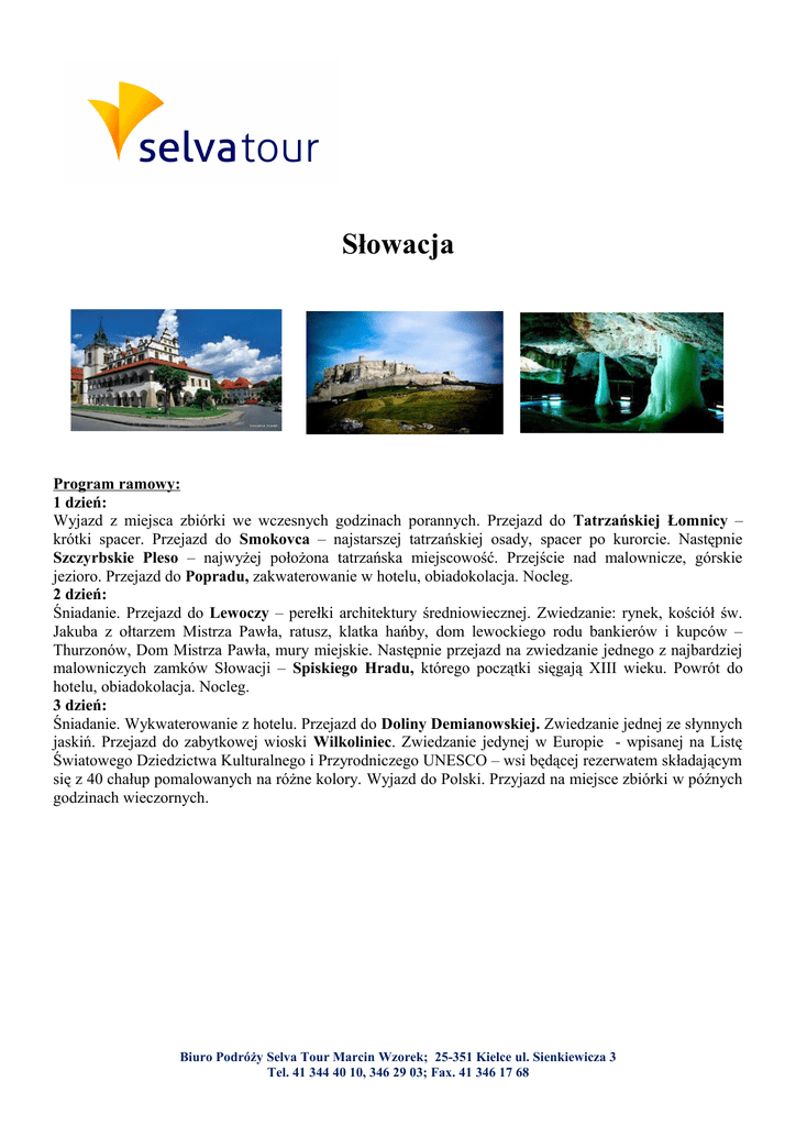 Słowacja Program ramowy: 1 dzień: Wyjazd z miejsca zbiórki we wczesnych godzinach porannych. Przejazd do Tatrzańskiej Łomnicy – krótki spacer. Przejazd do Smokovca – najstarszej tatrzańskiej osady, spacer po kurorcie. Następnie Szczyrbskie Pleso – najwyżej położona tatrzańska miejscowość. Przejście nad malownicze, górskie jezioro. Przejazd do Popradu, zakwaterowanie w hotelu, obiadokolacja. Nocleg. 2 dzień: Śniadanie. Przejazd do Lewoczy – perełki architektury średniowiecznej. Zwiedzanie: rynek, kościół św. Jakuba z ołtarzem Mistrza Pawła, ratusz, klatka hańby, dom lewockiego rodu bankierów i kupców – Thurzonów, Dom Mistrza Pawła, mury miejskie. Następnie przejazd na zwiedzanie jednego z najbardziej malowniczych zamków Słowacji – Spiskiego Hradu, którego początki sięgają XIII wieku. Powrót do hotelu, obiadokolacja. Nocleg. 3 dzień: Śniadanie. Wykwaterowanie z hotelu. Przejazd do Doliny Demianowskiej. Zwiedzanie jednej ze słynnych jaskiń. Przejazd do zabytkowej wioski Wilkoliniec. Zwiedzanie jedynej w Europie - wpisanej na Listę Światowego Dziedzictwa Kulturalnego i Przyrodniczego UNESCO – wsi będącej rezerwatem składającym się z 40 chałup pomalowanych na różne kolory. Wyjazd do Polski. Przyjazd na miejsce zbiórki w późnych godzinach wieczornych. Biuro Podróży Selva Tour Marcin Wzorek; 25-351 Kielce ul. Sienkiewicza 3 Tel. 41 344 40 10, 346 29 03; Fax. 41 346 17 68