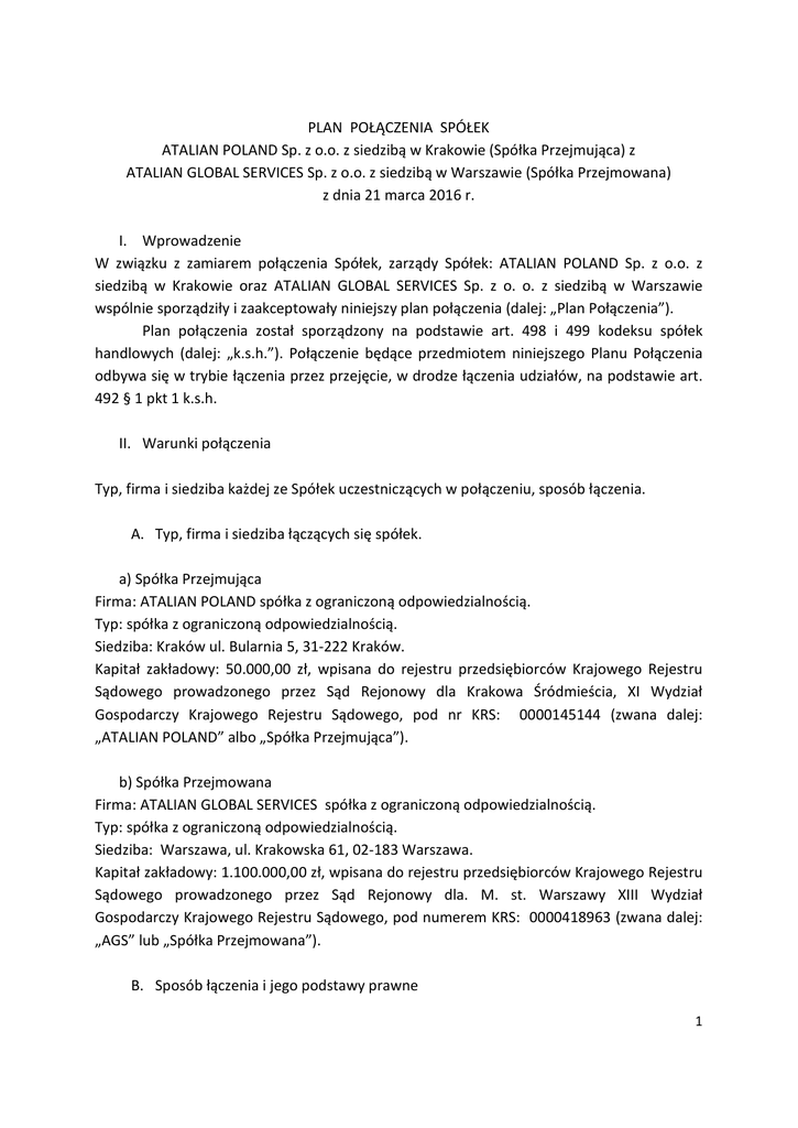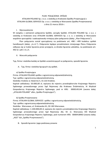PLAN POŁĄCZENIA SPÓŁEK ATALIAN POLAND Sp. z o.o. z