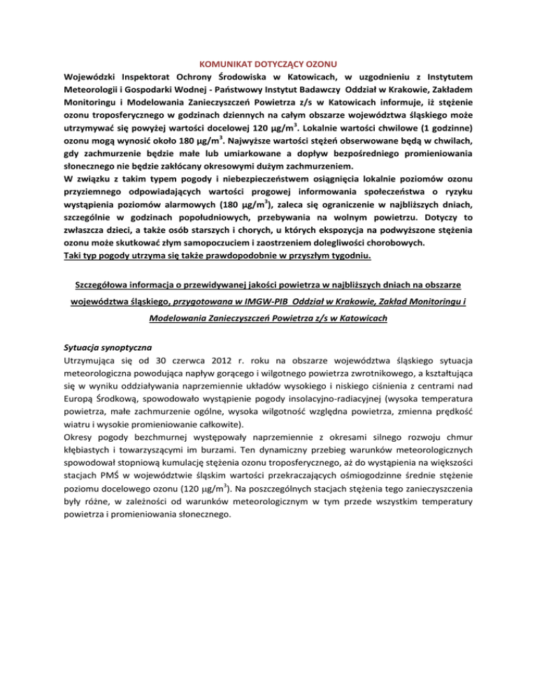 KOMUNIKAT DOTYCZĄCY OZONU Wojewódzki