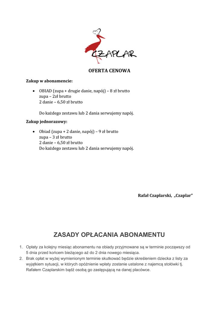 OFERTA CENOWA Zakup w abonamencie: OBIAD (zupa + drugie danie, napój) – 8 zł brutto zupa – 2zł brutto 2 danie – 6,50 zł brutto Do każdego zestawu lub 2 dania serwujemy napój. Zakup jednorazowy: Obiad (zupa + 2 danie, napój) – 9 zł brutto zupa – 3 zł brutto 2 danie – 6,50 zł brutto Do każdego zestawu lub 2 dania serwujemy napój. Rafał Czaplarski, „Czaplar” ZASADY OPŁACANIA ABONAMENTU 1. Opłaty za kolejny miesiąc abonamentu na obiady przyjmowane są w terminie począwszy od 5 dnia przed końcem bieżącego aż do 2 dnia nowego miesiąca. 2. Brak opłat w wyżej wymienionym terminie skutkować będzie skreśleniem dziecka z listy za wyjątkiem sytuacji, w których opóźnienie wpłaty zostanie ustalone z najemcą stołówki tj. Rafałem Czaplarskim bądź osobą go zastępującą na danej placówce. 3. Wpłaty za abonament obiadowy można dokonać bezpośrednio w stołówce szkolnej w dniach określonych w punkcie 1 w godz. 11-16 lub przelewem na numer konta. 56 1050 1924 1000 0092 1493 4128 tytułem: opłata abonamentu imię i nazwisko dziecka oraz klasa (z informacją czy abonament dotyczy pełnego obiadu czy tylko zupy lub drugiego dania) odbiorca: „Czaplar” Usługi Gastronomiczne Rafał Czaplarski, ul. Kolejowa 28b, 05-806 Komorów 4. W przypadku dokonania wpłaty przelewem w ostatnich dniach przyjmowania opłat (określonych w pkt 1) lub przed weekendem prosimy, ze względu na opóźnienie księgowania wpłat na koncie, o przesyłanie potwierdzenia przelewu na adres [email protected] 5. Odwoływanie obiadów należy zgłaszać drogą telefoniczną do godziny 9:00 pod nr tel. 730-743-248 6. Osoby, które zgłoszą nieobecność dziecka do godziny 9:00 nie ponoszą kosztów wyżywienia przez okres nieobecności dziecka włącznie z dniem zgłoszenia. Zgłoszenie tego faktu po godzinie 9: 00 skutkować będzie odliczeniem opłaty dopiero od następnego dnia.