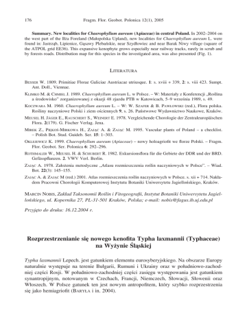 176 Fragm. Flor. Geobot. Polonica 12(1), 2005 Summary. New localities for Chaerophyllum aureum (Apiaceae) in central Poland. In 2002–2004 on the west part of the Iłża Foreland (Małopolska Upland), new localities for Chaerophyllum aureum L. were found in: Jastrząb, Lipienice, Gąsawy Plebańskie, near Szydłowiec and near Barak Niwy village (square of the ATPOL grid EE36). This expansive kenophyte grows especially near railway tracks, rarely in scrub and by forests roads. Distribution map for this species in the investigated area, was also presented (Fig. 1). Literatura Besser W. 1809. Primitiae Florae Galiciae Austriacae utriusque. 1: s. xviii + 339, 2: s. viii 423. Sumpt. Ant. Doll., Viennae. Klimko M. & Chmiel J. 1989. Chaerophyllum aureum L. w Polsce. – W: Materiały z Konferencji „Roślina a środowisko” zorganizowanej z okazji 48 zjazdu PTB w Katowicach, 5–9 września 1989, s. 49. Koczwara M. 1960. Chaerophyllum aureum L. – W: W. Szafer & B. Pawłowski (red.), Flora polska. Rośliny naczyniowe Polski i ziem ościennych 9, s. 26. Państwowe Wydawnictwo Naukowe, Kraków. Meusel H. Jäger E., Rauschert S., Weinert E. 1978. Vergleichende Chorologie der Zentraleuropäischen Flora. 2(179). G. Fischer Verlag. Jena. Mirek Z., Piękoś-Mirkowa H., Zając A. & Zając M. 1995. Vascular plants of Poland – a checklist. – Polish Bot. Stud. Guideb. Ser. 15: 1–303. Oklejewicz K. 1999. Chaerophyllum aureum (Apiaceae) – nowy holoagriofit we florze Polski. – Fragm. Flor. Geobot. Ser. Polonica 6: 292–296. Rothmaler W., Meusel H. & Schubert R. 1982. Exkursionsflora für die Gebiete der DDR und der BRD. Gefässpflanzen. 2. VWV Verl. Berlin. Zając A. 1978. Założenia metodyczne „Atlasu rozmieszczenia roślin naczyniowych w Polsce”. – Wiad. Bot. 22(3): 145–155. Zając A. & Zając M (red.) 2001. Atlas rozmieszczenia roślin naczyniowych w Polsce. s. xii + 714. Nakła dem Pracowni Chorologii Komputerowej Instytutu Botaniki Uniwersytetu Jagiellońskiego, Kraków. Marcin Nobis, Zakład Taksonomii Roślin i Fitogeografii, Instytut Botaniki Uniwersytetu Jagiellońskiego, ul. Kopernika 27, PL-31-501 Kraków, Polska; e-mail: [email protected] Przyjęto do druku: 16.12.2004 r. Rozprzestrzenianie się nowego kenofita Typha laxmannii (Typhaceae) na Wyżynie Śląskiej Typha laxmannii Lepech. jest gatunkiem elementu eurosyberyjskiego. Na obszarze Europy naturalnie występuje na terenie Bułgarii, Rumuni i Ukrainy oraz w południowo-zachod niej części Rosji. W południowo-zachodniej części zasięgu występowania jest gatunkiem synantropijnym, notowanym w Czechach, Francji, Niemczech, Słowacji, Słowenii oraz Włoszech. W Polsce gatunek ten jest nowym antropofitem, który szybko rozprzestrzenia się jako hemiagriofit (Baryła i in. 2004). Notatki botaniczne 177 Ryc. 1. Rozmieszczenie Typha laxmannii Lepech. w Polsce. ▲– nowe stanowisko Fig. 1. Distribution of Typha laxmannii Lepech. in Poland. ▲ – new station Na terenie Polski pierwszy raz odnotowano jego występowanie w Krainie Świętokrzyskiej na siedliskach w kamieniołomach: Kowala–Sobków w 1988 r., kwadrat ATPOL EE84 oraz w 1990 r. Zachełmie w pobliżu Zagnańska, kwadrat ATPOL EE64 (Ryc. 1). Następnie w 1999 r. podany został z Wyżyny Śląskiej, ze stanowiska w Kuźnicy Warężyńskiej (Baryła i in. 2004). Latem 2004 r. odkryto nowe rozlegle stanowisko Typha laxmannii na terenie gminy Trzebinia w powiecie chrzanowskim. Zlokalizowane jest ono około 2 km na N od osiedla Siersza miasta Trzebini, w sztucznym, betonowym korycie potoku Jaworznik przepływa jącym przez teren tzw. „Pola Siersza” – najbardziej wysuniętego na południowy-wschód wyrobiska Kopalni Piasku Szczakowa S.A., kwadrat ATPOL DF46. Nowoodkryte stanowisko Typha laxmannii składa się z dziesięciu odrębnych płatów. Pierwsze trzy płaty zlokalizowane są w odległości 2 km od Trzebini. Następnie, w górę biegu koryto potoku zakręca w kierunku północnym oddalając się od miasta. Kolejne 7 pła tów napotyka się w odległości ponad jednego kilometra od pierwszych i dalej na odcinku 3 km biegu strumienia. Znajdują się one średnio w odległości od 150–300 m od siebie. Dno betonowego koryta potoku ma szerokość 2 m, opisywane płaty pokrywają niemal całą szerokość jego dna na odcinkach od około 2 m do 20 m długości. Liczba owocujących okazów w zależności od wielkości danego płata waha się od kilkudziesięciu do kilkuset; 178 Fragm. Flor. Geobot. Polonica 12(1), 2005 w sumie liczba wszystkich owocujących łodyg wynosi około trzech tysięcy. Osobniki są zanurzone na głębokość ok. 15 cm w stosunkowo wartkiej wodzie. Podłoże stanowi piasek zmieszany z mułem, którego miąższość od betonowego dna waha się w granicach 10 do 20 cm. Pomiędzy płatami Typha laxmannii, a brzegiem koryta znajduje się niekiedy wąski pas (ok. 20 cm szerokości) wolny od roślin, gdzie przepływa główny nurt wody. Część pła tów T. laxmannii przedzielanych jest od siebie płatami o podobnych rozmiarach T. latifolia lub Phragmites australis (juv.); na dużych odcinkach potok także zupełnie pozbawiony jest roślinności. Z innych gatunków roślin pałce T. laxmannii towarzyszą sporadycznie okazy Bidens frondosa oraz Alisma plantago-aquatica. Na nie pokrytych jeszcze roślinnością od cinkach zamulonego koryta, płaty T. laxmannii, nie napotykając na konkurencję ze strony T. latifolia lub P. australis, intensywnie się rozrastają, zajmując kolejne partie nagiego pod łoża. Świadczy o tym obserwowany płat młodych osobników, które najwyraźniej wyrosły w sezonie wegetacyjnym 2004, jak również spotykane w środku płatów pozostałości oka zów owocujących w poprzednim sezonie wegetacyjnym. Tak więc opisywane stanowisko istniało już przynajmniej w 2003 r. Betonowe koryto potoku Jaworznik zostało wybudowane pod koniec lat osiemdziesią tych ubiegłego wieku, w związku z kolejnym przełożeniem bi