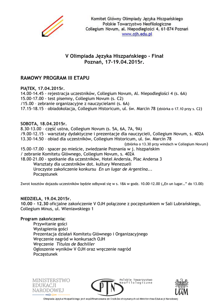 V Olimpiada Języka Hiszpańskiego - Finał Poznań, 17-19.04.2015r. RAMOWY PROGRAM III ETAPU PIĄTEK, 17.04.2015r. 14.00-14.45 - rejestracja uczestników, Collegium Novum, Al. Niepodległości 4 (s. 6A) 15.00-17.00 - test pisemny, Collegium Novum (s. C2) /15.00 – zebranie organizacyjne z nauczycielami (s. 6A) 17.15-18.15 – obiadokolacja, Collegium Historicum, ul. św. Marcin 78 (zbiórka o 17.10 przy s. C2) SOBOTA, 18.04.2015r. 8.30-13.00 – część ustna, Collegium Novum (s. 5A, 6A, 7A, 9A) /9.00-12.15 – warsztaty dydaktyczne i prezentacje dla nauczycieli, Collegium Novum, s. 402A 13.30-14.50 – obiad dla uczestników, Collegium Historicum, ul. św. Marcin 78 (zbiórka o 13.30 przy windach w Collegium Novum) 15.00-17.00 – spacer po mieście, zwiedzanie Poznania w j. hiszpańskim / zebranie Komitetu Głównego, Collegium Novum, s. 402A 18.00-21.00 - spotkanie dla uczestników, Hotel Andersia, Plac Andersa 3 Warsztaty dla uczestników dot. kultury Wenezueli Uroczyste zakończenie konkursu En un lugar de Argentina... Poczęstunek Zwrot kosztów dojazdu uczestników będzie odbywał się w s. 18A w godz. 10.00-12.00 („En un lugar…” do 13.00) NIEDZIELA, 19.04.2015r. 10.00 – 12.30 oficjalne zakończenie V OJH połączone z poczęstunkiem w Sali Lubrańskiego, Collegium Minus, ul. Wieniawskiego 1 Program zakończenia: Przywitanie gości Wystąpienia gości Prezentacja działań Komitetu Głównego i Organizacyjnego Wręczenie nagród w konkursach OJH Wręczenie Títulos de Bachiller Ogłoszenie wyników V OJH oraz wręczenie nagród Poczęstunek V Olimpiada Języka Hiszpańskiego - Finał Poznań, 17-19.04.2015r. RAMOWY PROGRAM III ETAPU PIĄTEK, 17.04.2015r. 14.00-14.45 - rejestracja uczestników, Collegium Novum, Al. Niepodległości 4 (s. 6A) 15.00-17.00 - test pisemny, Collegium Novum (s. C2) /15.00 – zebranie organizacyjne z nauczycielami (s. 6A) 17.15-18.15 – obiadokolacja, Collegium Historicum, ul. św. Marcin 78 (zbiórka o 17.10 przy s. C2) SOBOTA, 18.04.2015r. 8.30-13.00 – część ustna, Collegium Novum (s. 5A, 6A, 7A, 9A) /9.00-12.15 – warsztaty dydaktyczne i prezentacje dla nauczycieli, Collegium Novum, s. 402A 13.30-14.50 – obiad dla uczestników, Collegium Historicum, ul. św. Marcin 78 (zbiórka o 13.30 przy windach w Collegium Novum) 15.00-17.00 – spacer po mieście, zwiedzanie Poznania w j. hiszpańskim / zebranie Komitetu Głównego, Collegium Novum, s. 402A 18.00-21.00 - spotkanie dla uczestników, Hotel Andersia, Plac Andersa 3 Warsztaty dla uczestników dot. kultury Wenezueli Uroczyste zakończenie konkursu En un lugar de Argentina... Poczęstunek Zwrot kosztów dojazdu uczestników będzie odbywał się w s. 18A w godz. 10.00-12.00 („En un lugar…” do 13.00) NIEDZIELA, 19.04.2015r. 10.00 – 12.30 oficjalne zakończenie V OJH połączone z poczęstunkiem w Sali Lubrańskiego, Collegium Minus, ul. Wieniawskiego 1 Program zakończenia: Przywitanie gości Wystąpienia gości Prezentacja działań Komitetu Głównego i Organizacyjnego Wręczenie nagród w konkursach OJH Wręczenie Títulos de Bachiller Ogłoszenie wyników V OJH oraz wręczenie nagród Poczęstunek