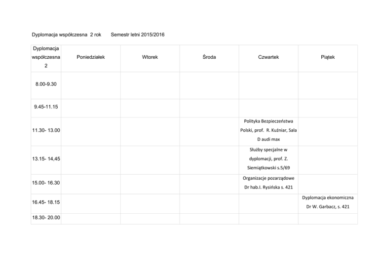 Dyplomacja współczesna 2 rok Semestr letni 2015/2016 Dyplomacja współczesna Poniedziałek Wtorek Środa Czwartek Piątek 2 8.00-9.30 9.45-11.15 Polityka Bezpieczeństwa 11.30- 13.00 Polski, prof. R. Kuźniar, Sala D audi max Służby specjalne w 13.15- 14,45 dyplomacji, prof. Z. Siemiątkowski s.5/69 15.00- 16.30 16.45- 18.15 18.30- 20.00 Organizacje pozarządowe Dr hab.I. Rysińska s. 421 Dyplomacja ekonomiczna Dr W. Garbacz, s. 421
