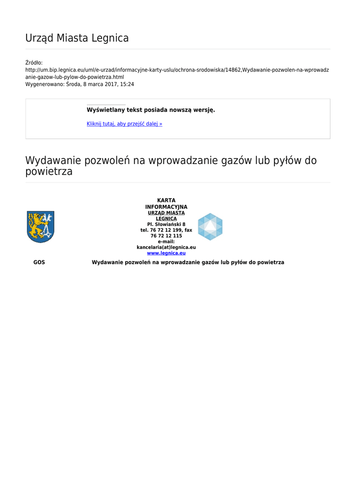 Urząd Miasta Legnica Źródło: http://um.bip.legnica.eu/uml/e-urzad/informacyjne-karty-uslu/ochrona-srodowiska/14862,Wydawanie-pozwolen-na-wprowadz anie-gazow-lub-pylow-do-powietrza.html Wygenerowano: Środa, 8 marca 2017, 15:24 Wyświetlany tekst posiada nowszą wersję. Kliknij tutaj, aby przejść dalej » Wydawanie pozwoleń na wprowadzanie gazów lub pyłów do powietrza KARTA INFORMACYJNA URZĄD MIASTA LEGNICA Pl. Słowiański 8 tel. 76 72 12 199, fax 76 72 12 115 e-mail: kancelaria(at)legnica.eu www.legnica.eu GOS Wydawanie pozwoleń na wprowadzanie gazów lub pyłów do powietrza Wymagane dokumenty: 1. Wniosek, który powinien zawierać dane zgodnie z art. 184 i 221 ustawy z dnia 27 kwietnia 2001 roku Prawo ochrony środowiska (t.jedn.Dz.U. z 2013 r.,poz.1232 z późniejszymi zmianami) Opłaty: • Od pozwoleń wydanych w związku z wykonywaną działalnością gospodarczą - 2.011 zł • Od pozwoleń wydawanych w związku z działalnością gospodarczą wykonywaną przez mikroprzedsiębiorców oraz małych i średnich przedsiębiorców - 506 zł • Od pozwolenia na wprowadzanie gazów i pyłów do powietrza, wydanego w wyniku przeprowadzenia postępowania kompensacyjnego, wynosi 150% stawek wymienionych w powyższych punktach Miejsce dokonywania opłat: Kasa Urzędu Miasta - parter, pok. 6 lub konto: Bank PeKaO S.A. I O/Legnica 32 1240 1473 1111 0010 4343 3697 Miejsce załatwiania sprawy: • Złożenie wniosku w Kancelarii Urzędu Miasta, parter pokój nr 5 Terminy załatwienia sprawy: W ciągu miesiąca, a sprawy szczególnie skomplikowane w ciągu 2 miesięcy od dnia wszczęcia postępowania Jednostka odpowiedzialna: Wydział Środowiska i Gospodarowania Odpadami, pokój nr 302, tel. 76 721 23 47 Tryb odwoławczy: Od decyzji przysługuje stronom prawo wniesienia odwołania do Samorządowego Kolegium Odwoławczego w Legnicy, za pośrednictwem Prezydenta Miasta Legnicy, w terminie 14 dni od daty otrzymania decyzji Podstawa prawna: Art. 183 i 220 Ustawy z dnia 27 kwietnia 2001r. Prawo ochrony środowiska (t.jedn.Dz.U. z 2013 r.,poz.1232 z późniejszymi zmianami) GOS Zapraszamy codziennie od 7.30 do 15.30, a we wtorki od 8.00 do 16.00 Metadane Data publikacji 09.10.2015 Rejestr zmianStarsze wersje dokumentu Podmiot udostępniający informację: Urząd Miasta Legnica Osoba wytwarzająca/odpowiadająca za informację: Maria Łapot Osoba udostępniająca informację: Alina Godyń Wydział Środowiska i Gospodarowania Odpadami Osoba modyfikująca informację: