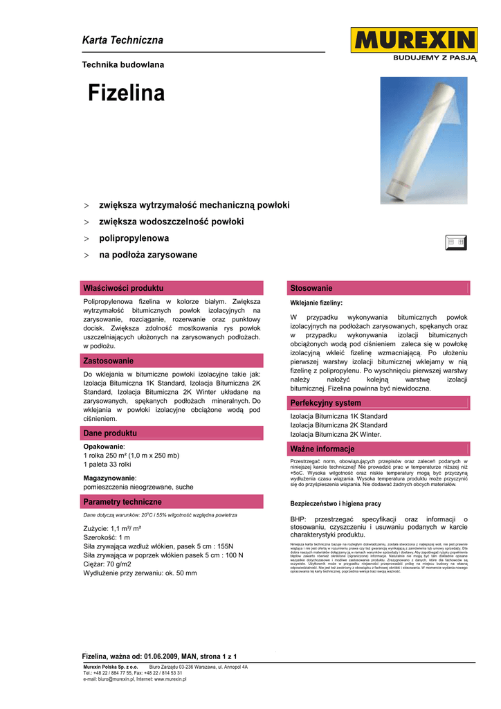 Karta Techniczna Technika budowlana FLT_FIZELINA Fizelina > zwiększa wytrzymałość mechaniczną powłoki > zwiększa wodoszczelność powłoki > polipropylenowa > na podłoŜa zarysowane Właściwości produktu Stosowanie Polipropylenowa fizelina w kolorze białym. Zwiększa wytrzymałość bitumicznych powłok izolacyjnych na zarysowanie, rozciąganie, rozerwanie oraz punktowy docisk. Zwiększa zdolność mostkowania rys powłok uszczelniających ułoŜonych na zarysowanych podłoŜach. w podłoŜu. Wklejanie fizeliny: W przypadku wykonywania bitumicznych powłok izolacyjnych na podłoŜach zarysowanych, spękanych oraz w przypadku wykonywania izolacji bitumicznych obciąŜonych wodą pod ciśnieniem zaleca się w powłokę izolacyjną wkleić fizelinę wzmacniającą. Po ułoŜeniu pierwszej warstwy izolacji bitumicznej wklejamy w nią fizelinę z polipropylenu. Po wyschnięciu pierwszej warstwy naleŜy nałoŜyć kolejną warstwę izolacji bitumicznej. Fizelina powinna być niewidoczna. Zastosowanie Do wklejania w bitumiczne powłoki izolacyjne takie jak: Izolacja Bitumiczna 1K Standard, Izolacja Bitumiczna 2K Standard, Izolacja Bitumiczna 2K Winter układane na zarysowanych, spękanych podłoŜach mineralnych. Do wklejania w powłoki izolacyjne obciąŜone wodą pod ciśnieniem. Perfekcyjny system Izolacja Bitumiczna 1K Standard Izolacja Bitumiczna 2K Standard Izolacja Bitumiczna 2K Winter. Dane produktu Opakowanie: 1 rolka 250 m² (1,0 m x 250 mb) 1 paleta 33 rolki WaŜne informacje Przestrzegać norm, obowiązujących przepisów oraz zaleceń podanych w niniejszej karcie technicznej! Nie prowadzić prac w temperaturze niŜszej niŜ +5oC. Wysoka wilgotność oraz niskie temperatury mogą być przyczyną wydłuŜenia czasu wiązania. Wysoka temperatura produktu moŜe przyczynić się do przyśpieszenia wiązania. Nie dodawać Ŝadnych obcych materiałów. Magazynowanie: pomieszczenia nieogrzewane, suche Parametry techniczne Bezpieczeństwo i higiena pracy o Dane dotyczą warunków: 20 C i 55% wilgotność względna powietrza BHP: przestrzegać specyfikacji oraz informacji o stosowaniu, czyszczeniu i usuwaniu podanych w karcie charakterystyki produktu. ZuŜycie: 1,1 m²/ m² Szerokość: 1 m Siła zrywająca wzdłuŜ włókien, pasek 5 cm : 155N Siła zrywająca w poprzek włókien pasek 5 cm : 100 N CięŜar: 70 g/m2 WydłuŜenie przy zerwaniu: ok. 50 mm 01 Fizelina, waŜna od: 01.06.2009, MAN, strona 1 z 1 Murexin Polska Sp. z o.o. Biuro Zarządu 03-236 Warszawa, ul. Annopol 4A Tel.: +48 22 / 884 77 55, Fax: +48 22 / 814 53 31 e-mail: [email protected], Internet: www.murexin.pl Niniejsza karta techniczna bazuje na rozległym doświadczeniu, została stworzona z najlepszej woli, nie jest prawnie wiąŜąca i nie jest ofertą w rozumieniu prawa czy teŜ gwarancją wynikającą z zamówienia lub umowy sprzedaŜy. Dla dobra naszych materiałów dołączamy ją w ramach warunków sprzedaŜy i dostawy. Aby zapobiegać ryzyku popełnienia błędów zawarto równieŜ określone (ograniczone) informacje. Naturalnie nie mogą być tam dokładnie opisane wszystkie dotychczasowe i moŜliwe zastosowania produktu. Zrezygnowano z danych, które dla fachowców są oczywiste. UŜytkownik moŜe w przypadku niejasności przeprowadzić próbę na miejscu budowy na własną odpowiedzialność. Nie jest teŜ zwolniony z obowiązku z fachowej obróbki i stosowania. W momencie wydania nowego opracowania tej karty technicznej, poprzednia wersja traci swoją waŜność. 1