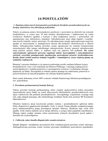 14 POSTULATÓW 1. Zamiana toksycznych instrumentów pochodnych (kredytów pseudowalutowych) na kredyty złotówkowe oraz likwidacja polisolokat Należy za pomocą ustawy bezwarunkowo przeliczyć z powrotem na złotówki (na wniosek kredytobiorcy, w czasie max 30 dni) kredyty denominowane i indeksowane do walut (zwłaszcza franków) zgodnie z kursem z dnia podpisania umowy i potwierdzić ich spekulacyjny oraz złotówkowy charakter. Odwalutowanie musi objąć kapitał i wszelkie inne koszty (odsetki, marże, prowizje). Po odwalutowaniu zasady oprocentowania mają być zgodne ze stosowanymi w analogicznym okresie dla kredytów złotówkowych w danym banku. Zabezpieczenia banków powinny zostać ograniczone do wartości kredytowanej nieruchomości albo innego udzielonego zabezpieczenia. Koszty operacji odwalutowania mają ponieść jedynie banki, w żadnym razie nie państwo lub podatnik. Do czasu wprowadzenia opisanych powyżej regulacji należy bezwzględnie i natychmiastowo zawiesić wszystkie postępowania egzekucyjne prowadzone przeciw kredytobiorcom. Każdy dzień zwłoki oznacza kolejne tragedie i samobójstwa, coraz większą plamę na sumieniu rządzących. Bierność i pozorne działania w tej sprawie podważają resztki zaufania kilkuset tysięcy kredytobiorców wraz z ich rodzinami do Państwa Polskiego, i narażają rządzących na zarzut hipokryzji i współuczestnictwa w przestępstwie oszustwa i wyłudzenia, którego dopuściły się banki. Szczególnie ta właśnie sprawa domaga się załatwienia, ponieważ w przeciwieństwie do innych projektów nie obciąża budżetu państwa. Musi zostać dokonany zwrot 100% wartości wkładu finansowego klientom posiadającym tzw. polisolokaty. 2. Powołanie parlamentarnej komisji śledczej Należy powołać komisję parlamentarną, która wyjaśni społeczeństwu kulisy procederu wprowadzenia przez banki na rynek toksycznych nibykredytów pseudowalutowych oraz opcji walutowych dla polskich przedsiębiorców. Szczególnego wyjaśnienia wymaga tutaj rola, jaką odegrał pracujący dla londyńskiego Goldman Sachs były premier RP Kazimierz Marcinkiewicz. Obydwie bankowe akcje kosztowały polskie rodziny i przedsiębiorców (głównie dobre firmy eksportowe) gigantyczne pieniądze i były w istocie formą rabunku zorganizowanego przez międzynarodową grupę przestępczą (projekt Abacus). Skutkiem tego wiele firm upadło, wiele rodzin znalazło się na skraju ubóstwa, a tysiące ludzi popełniły samobójstwa. Dlatego należy podjąć starania celem postawienia winnych decydentów przed sądem i skazania ich za przestępstwo. 3. Całkowity zakaz handlu długami jako zasada ustrojowa Handel długami i działalność prywatnych firm windykacyjnych powinna zostać zakazana. Zdelegalizowana powinna zostać również prywatna działalność pożyczkowa (parabanki). Prawo do windykacji powinno zostać w wyłącznej gestii państwa. Na koniec II kwartału 2015 roku tylko firmy, zrzeszone w Konferencji Przedsiębiorstw Finansowych w Polsce, obsługiwały wierzytelności o nominalnej wartości 61,6 miliarda PLN. Oznacza to 3-krotny wzrost wartości portfeli w stosunku do grudnia 2010 roku, kiedy to kształtowała się ona na poziomie 20,4 mld PLN. 4. Upaństwowienie zawodu komornika Komornicy powinni zostać etatowymi pracownikami Ministerstwa Sprawiedliwości (nie mogą podlegać Sądom, które gwarantują im praktyczną bezkarność), bez prawa do pobierania prowizji od windykowanych kwot (oprócz pensji powinni pobierać jedynie opłaty za czynności). W Polsce doszło do skrajnie patologicznej sytuacji: na 16 mln zatrudnionych (włącznie z szarą strefą) przypada 7 mln egzekucji komorniczych. Konieczność zadłużania się społeczeństwa jest wymuszona sztucznie wytworzonym głodem monetarnym, który wynika z faktu braku pieniędzy w portfelach Polaków do wykupienia owoców ich własnej pracy, czyli PKB. Jak wynika z „Europejskiego Raportu Płatności Konsumenckich”, sporządzonego przez Intrum Justitia w 21 krajach europejskich, 35 proc. obywateli obawia się, że po uregulowaniu stałych rachunków nie starczy im środków na inne, bieżące wydatki. 37 proc. Polaków w wieku 18-24 lat przyznaje, że bez pożyczki nie jest w stanie wydać jednorazowo 300 euro, liczonego jako połowa średniego, miesięcznego wynagrodzenia. Wymuszone zadłużenie się i brak możliwości spłaty kredytów, jest główną przyczyną plagi samobójstw – ok. 7 tys. rocznie, czyli dwukrotność ofiar wypadków samochodowych. Komornik ma egzekwować, nie rabować. Przychody komorników z tego rabunkowego procederu, wyniosły tylko w 2015 roku ponad 1 mld zł. 5. Zakaz reklamy usług finansowych Należy wprowadzić całkowity zakaz reklamy produktów finansowych i ubezpieczeniowych, a zwłaszcza kredytów, pożyczek oraz usług windykacyjnych. (To samo powinno dotyczyć produktów farmaceutycznych, używek oraz reklam skierowanych do małoletnich). 6. Odejście od stosowania stopy WIBOR Należy zlikwidować stopę WIBOR jako pozory koszt (oprocentowania), który ponoszą banki podczas udzielania kredytu, ponieważ banki nie pożyczają pieniędzy podczas akcji kredytowej, a jedynie je kreują, tworząc je z niczego (ex nihilo), nie mają prawa doliczać obciążenia w postaci WIBOR-u do całościowego kosztu kredytu. 7. Wykup kredytów złotówkowych przez NBP Po likwidacji kredytów pseudowalutowych na rynku pozostaną jedynie kredyty złotówkowe. Wobec nich należy zastosować zasadę powszechnej restrukturyzacji polegającej na wyemitowaniu przez NBP pieniędzy, za pomocą których zostaną wykupione zobowiązania klientów wobec banków komercyjnych (monetyzacja istniejących i zakupionych dóbr). Spłata zobowiązań dłużników będzie w przyszłości następować wobec NBP, bez odsetek (z możliwością negocjacji korzystnych harmonogramów). Bank centralny powinien te spłaty wyksięgować z systemu, by nie powstał pieniądz inflacyjny. Podob
