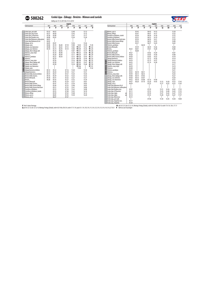 v 500262 Ceska Lipa,,aut.nadr. Ceska Lipa,,kriz.U jezu Ceska Lipa,,U Ploucnice Ceska Lipa,Ziznikov,rozc. Ceska Lipa,Dobranov,velkovykrm Ceska Lipa,Dobranov,hl.sil. Zakupy,,zel.st. Zakupy,,nam. Zakupy,,rozc.Kamenice Zakupy,,rozc.Velenice Zakupy,,Nove Zakupy sidl. Velenice,,stary mlyn Velenice,, Velenice,,prodejna Velenice,, Velenice,,stary mlyn Zakupy,,Nove Zakupy sidl. Zakupy,,rozc.Velenice Zakupy,,rozc.Kamenice Zakupy,,nam. Zakupy,Kamenice,hrbitov Zakupy,Kamenice, Brniste,Velky Grunov,hrbitov Brniste,Velky Grunov, Brniste,Hlemyzdi, Brniste,, Brniste,Hlemyzdi, Brniste,Velky Grunov, Brniste,Velky Grunov,Mitop Brniste,Velky Grunov,kult.dum Pertoltice p.Ralskem,, Pertoltice p.Ralskem,,statek Mimon,,Mitop Mimon,,aut.st. Mimon,,zel.st. Gültig von 15.12.2013 bis 14.12.2014 001 005 009 fl fl fl 03.55 03.57 03.58 04.00 04.01 04.02 04.05 04.06 04.08 04.10 04.55 04.58 05.00 05.03 04.12 04.13 04.15 04.16 04.18 04.20 05.07 05.10 05.12 05.14 05.16 05.18 05.20 05.22 05.24 05.26 05.28 05.30 05.32 05.34 05.37 05.39 05.41 05.43 05.45 05.47 05.49 05.51 05.53 05.55 05.59 06.05 06.07 täglich 039 007 fl fl 011 021 003 hk fl fl 12.40 12.43 12.47 12.50 06.40 06.42 06.44 06.46 06.48 06.49 06.50 07.10 07.12 07.14 07.16 07.18 07.21 07.23 07.25 07.27 07.29 07.31 07.33 07.35 07.38 07.40 07.43 07.45 07.47 12.56 13.00 13.02 13.04 13.07 13.10 13.11 13.13 13.14 13.16 13.17 13.18 13.20 13.21 13.24 13.25 13.27 13.35 13.37 13.39 13.40 13.41 13.43 13.45 13.48 13.50 Fahrtnummer 15.12 15.15 15.17 15.20 14.45 14.47 14.49 14.51 14.53 14.54 14.56 14.58 15.00 15.02 15.04 15.06 15.08 15.26 15.30 15.32 15.34 15.37 15.40 15.41 15.43 15.44 15.46 15.47 15.48 15.50 15.51 15.54 15.55 15.57 15.59 16.01 16.03 16.05 16.06 16.08 16.10 16.14 16.20 17.20 17.22 17.24 17.26 17.28 17.29 17.31 17.33 17.35 17.37 17.39 17.41 17.42 EURO-NEISSE-TICKET EURO-NEISSE-TICKET Fahrtnummer Ceská Lípa - Zákupy - Brniste - Mimon und zurück Mimon,,aut.st. Mimon,,Mitop Pertoltice p.Ralskem,,statek Pertoltice p.Ralskem,, Brniste,Velky Grunov,kult.dum Brniste,Velky Grunov,Mitop Brniste,Velky Grunov, Velenice,,prodejna Brniste,Hlemyzdi, Brniste,, Velenice,,prodejna Brniste,Hlemyzdi, Brniste,Velky Grunov, Brniste,Velky Grunov,hrbitov Zakupy,Kamenice, Zakupy,Kamenice,hrbitov Zakupy,,rozc.Velenice Zakupy,,Nove Zakupy sidl. Velenice,,stary mlyn Velenice,, Velenice,,prodejna Velenice,, Velenice,,stary mlyn Zakupy,,Nove Zakupy sidl. Zakupy,,rozc.Velenice Zakupy,,rozc.Kamenice Zakupy,,nam. Zakupy,,zel.st. Ceska Lipa,Dobranov,hl.sil. Ceska Lipa,Dobranov,velkovykrm Ceska Lipa,Ziznikov,rozc. Ceska Lipa,,U Ploucnice Ceska Lipa,,Lipka an Ceska Lipa,,Lipka ab Ceska Lipa,,Manesova Ceska Lipa,,aut.nadr. Ceska Lipa,,Vagonka rozc. Ceska Lipa,,Vagonka 004 006 008 012 täglich 024 026 028 038 036 fl fl fl fl hj hj hk fl fl 06.45 06.47 06.50 06.52 06.54 06.55 06.57 14.15 14.17 14.18 14.19 14.21 14.22 14.24 15.50 15.52 15.55 15.57 15.59 16.00 16.02 06.59 07.01 14.26 14.28 16.04 16.06 07.02 07.03 07.05 07.12 07.13 07.14 14.29 14.30 14.32 14.36 14.37 14.38 07.16 07.20 07.22 14.40 14.45 17.43 17.45 05.45 05.47 05.50 05.52 05.54 05.55 05.57 06.50 04.25 04.27 04.28 04.30 04.33 04.34 04.35 04.37 04.39 04.40 04.41 04.42 04.44 04.48 04.50 04.52 04.57 04.59 05.07 05.11 05.13 05.14 05.15 05.59 06.01 06.08 06.10 06.12 06.14 06.16 06.18 06.20 06.51 06.53 07.05 07.07 07.08 07.10 15.15 15.17 16.30 16.32 16.07 16.08 16.10 16.14 16.15 16.16 16.17 16.19 16.20 16.21 16.23 16.25 16.27 16.29 16.31 16.33 16.35 07.29 07.32 07.34 07.35 15.21 15.25 15.27 15.28 16.36 16.40 16.42 16.43 16.42 16.45 16.47 16.47 17.52 17.55 17.57 17.57 07.40 15.30 16.45 16.50 18.00 05.17 05.20 fl Mo-Fr ohne Feiertage hk ab 16.12.13, bis 12.12.14, Montag-Freitag (Schule), nicht 4.8.14 bis 29.8.14, nicht 17.4.14, 18.4, 17.11 hj ab 16.12.13, bis 12.12.14, Montag-Freitag (Schule), nicht 4.8.14 bis 29.8.14, nicht 17.11.14, auch 31.1.14, 10.3.14, 11.3.14, 12.3.14, 13.3.14, 14.3.14, 27.10.1 hält nur zum Aussteigen