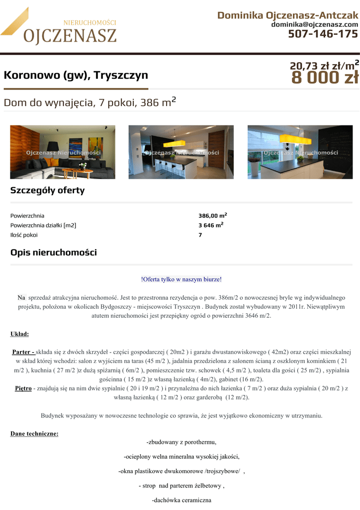 Dominika Ojczenasz-Antczak [email protected] 507-146-175 20,73 zł zł/m2 8 000 zł Koronowo (gw), Tryszczyn Dom do wynajęcia, 7 pokoi, 386 m2 Szczegóły oferty Powierzchnia 386,00 m2 Powierzchnia działki [m2] 3 646 m2 Ilość pokoi 7 Opis nieruchomości !Oferta tylko w naszym biurze! Na sprzedaż atrakcyjna nieruchomość. Jest to przestronna rezydencja o pow. 386m/2 o nowoczesnej bryle wg indywidualnego projektu, położona w okolicach Bydgoszczy - miejscowości Tryszczyn . Budynek został wybudowany w 2011r. Niewątpliwym atutem nieruchomości jest przepiękny ogród o powierzchni 3646 m/2. Układ: Parter - składa się z dwóch skrzydeł - części gospodarczej ( 20m2 ) i garażu dwustanowiskowego ( 42m2) oraz części mieszkalnej w skład której wchodzi: salon z wyjściem na taras (45 m/2 ), jadalnia przedzielona z salonem ścianą z oszklonym kominkiem ( 21 m/2 ), kuchnia ( 27 m/2 )z dużą spiżarnią ( 6m/2 ), pomieszczenie tzw. schowek ( 4,5 m/2 ), toaleta dla gości ( 25 m/2) , sypialnia gościnna ( 15 m/2 )z własną łazienką ( 4m/2), gabinet (16 m/2). Piętro - znajdują się na nim dwie sypialnie ( 20 i 19 m/2 ) i przynależna do nich łazienka ( 7 m/2 ) oraz duża sypialnia ( 20 m/2 ) z własną łazienką ( 12 m/2 ) oraz garderobą (12 m/2). Budynek wyposażany w nowoczesne technologie co sprawia, że jest wyjątkowo ekonomiczny w utrzymaniu. Dane techniczne: -zbudowany z porothermu, -ocieplony welna mineralna wysokiej jakości, -okna plastikowe dwukomorowe /trojszybowe/ , - strop nad parterem żelbetowy , -dachówka ceramiczna -Ogrzewanie podlogowe , -odkurzacz centralny, -rekuperacja, -rolety zewnętrzne, -barmy na pilota, - przydomowa oczyszczalnia, -woda z wodociągu, -ogrzewanie gazowe – piec dwufunkcyjny, -solary, -filtr wody, -alarm , monitoring Budynek spełni wymagania nawet najbardziej wymagających osób, które cenią sobie wysoką jakość wykończenia i wyposażenia wnętrz. Jest to dom całkowicie "kompletny" wszystkie elementy ze sobą współgrają tworząc harmonijną całość. !Polecam i zapraszam na prezentację! Nieruchomość Rodzaj domu wolnostojący Technologia budowlana phorotherm Garaż na dwa samochody Stan prawny Własność Typ kaucji jednomiesięczna Okna nowe PCV Instalacje nowe Balkon duży Pokrycie dachu dachówka ceramiczna Stan budynku do zamieszkania Tarasy taras