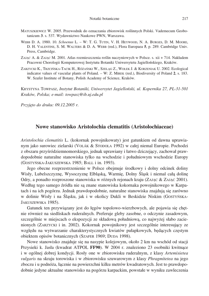 Notatki botaniczne 217 MATUSZKIEWICZ W. 2005. Przewodnik do oznaczania zbiorowisk roślinnych Polski. Vademecum Geobotanicum 3. s. 537. Wydawnictwo Naukowe PWN, Warszawa. WEBB D. A. 1980. 10. Schoenus L. – W: T. G. TUTIN, V. H. HEYWOOD, N. A. BURGES, D. M. MOORE, D. H. VALENTINE, S. M. WALTERS & D. A. WEBB (red.), Flora Europaea 5, p. 289. Cambridge Univ. Press, Cambridge. ZAJĄC A. & ZAJĄC M. 2001. Atlas rozmieszczenia roślin naczyniowych w Polsce. s. xii + 714. Nakładem Pracowni Chorologii Komputerowej Instytutu Botaniki Uniwersytetu Jagiellońskiego, Kraków. ZARZYCKI K., TRZCIŃSKA-TACIK H., RÓŻAŃSKI W., SZELĄG Z., WOŁEK J. & KORZENIAK U. 2002. Ecological indicator values of vascular plants of Poland. – W: Z. MIREK (red.), Biodiversity of Poland 2, s. 183. W. Szafer Institute of Botany, Polish Academy of Science, Kraków. KRYSTYNA TOWPASZ, Instytut Botaniki, Uniwersytet Jagielloński, ul. Kopernika 27, PL-31-501 Kraków, Polska; e-mail: [email protected] Przyjęto do druku: 09.12.2005 r. Nowe stanowisko Aristolochia clematitis (Aristolochiaceae) Aristolochia clematitis L. (kokornak powojnikowaty) jest gatunkiem od dawna uprawianym jako surowiec zielarski (VOLÁK & STODOLA 1992) w całej niemal Europie. Pochodzi z obszaru przyśródziemnomorskiego, jednak uprawiany i łatwo dziczejący, zachował prawdopodobnie naturalne stanowiska tylko na wschodzie i południowym wschodzie Europy (GOSTYŃSKA-JAKUSZEWSKA 1985; BALL i in. 1993). Jego obecne rozprzestrzenienie w Polsce obejmuje środkowy i dolny odcinek doliny Wisły, Lubelszczyznę, Wysoczyznę Elbląską, Warmię, Dolny Śląsk i niemal całą dolinę Odry, a ponadto rozproszone stanowiska w różnych rejonach kraju (ZAJĄC & ZAJĄC 2001). Według tego samego źródła nie są znane stanowiska kokornaka powojnikowego w Karpatach i na ich pogórzu. Jednak prawdopodobnie, naturalne stanowiska znajdują się zarówno w dolinie Wisły i na Śląsku, jak i w okolicy Dukli w Beskidzie Niskim (GOSTYŃSKAJAKUSZEWSKA 1985). Gatunek ten przywiązany jest do łęgów topolowo-wierzbowych, ale pojawia się chętnie również na siedliskach ruderalnych. Preferuje gleby zasobne, o odczynie zasadowym, szczególnie w miejscach o ekspozycji ze składową południową, co najwyżej słabo zacienionych (ZARZYCKI i in. 2002). Kokornak powojnikowy jest szczególnie interesujący ze względu na wytwarzanie charakterystycznych kwiatów pułapkowych, będących częstym obiektem opisów botanicznych (SZAFER 1969; DUDA 1998). Nowe stanowisko znajduje się na nasypie kolejowym, około 2 km na wschód od stacji Przysieki k. Jasła (kwadrat ATPOL FF90). W 2004 r. znaleziono 23 osobniki kwitnące i w ogólnej dobrej kondycji. Rosły one w zbiorowisku ruderalnym, z klasy Artemisietea vulgaris na skraju torowiska i w zbiorowisku szuwarowym z klasy Phragmitetea na jego zboczu i u podnóża, łącznie na powierzchni kilku metrów kwadratowych. Jest to prawdopodobnie jedyne aktualne stanowisko na pogórzu karpackim, powstałe w wyniku zawleczenia 218 Fragm. Flor. Geobot. Polonica 13(1), 2006 związanego z transportem kolejowym, choć równie prawdopodobna jest ucieczka osobników z pobliskich upraw przyzagrodowych. Kondycja osobników i rozległość stanowiska będzie podlegała corocznej kontroli. Okazy zielnikowe znajdują się w posiadaniu autora. Summary. A new locality for Aristolochia clematitis (Aristolochiaceae). A new locality of Aristolochia clematitis L. was found near Jaslo, in the vicinity of Przysieki railway station. 23 individuals were grown on the railway embankment in a ruderal and rushe plant communities. LITERATURA BALL P. W., NARDI E. & AKEROYD J. R. 1993. Aristolochia L. – W: T. G. TUTIN, N. A. BURGES, A. O. CHATER, J. R. EDMONDSON, V. H. HEYWOOD, D. M. MOORE, D. H. VALNTINE, S. M. WALTERS & D. A. WEBB (red.), Flora Europaea 1, s. 87–89. Psilotaceae to Platanaceae, 2nd. ed., Cambridge Univ. Press, Cambridge. DUDA J. 1998. Kwiat pułapkowy kokornaka powojnikowatego. – Przyroda Górnego Śląska, 14: 3. GOSTYŃSKA-JAKUSZEWSKA M. 1985. Rodzina: Aristolochiaceae, Kokornakowate. – W: A. JASIEWICZ (red.), Flora Polski. Rośliny naczyniowe 4, s. 7–9. Państwowe Wydawnictwo Naukowe, Warszawa – Kraków. SZAFER. W. 1969. System morfologiczny kwiatów entomogamicznych. – W: W. SZAFER (red.), Kwiaty i zwierzęta, zarys ekologii kwiatów, s. 88–119. Państwowe Wydawnictwo Naukowe, Warszawa. VOLÁK J. & STODOLA J. 1992. Rośliny lecznicze. s. 319. Polska Oficyna Wydawnicza „BGW”, Warszawa. ZAJĄC A. & ZAJĄC M. (red.) 2001. Atlas rozmieszczenia roślin naczyniowych w Polsce. s. xii + 714. Nakładem Pracowni Chorologii Komputerowej Instytutu Botaniki Uniwersytetu Jagiellońskiego, Kraków. ZARZYCKI K., TRZCIŃSKA-TACIK H., RÓŻAŃSKI W., SZELĄG Z., WOŁEK J. & KORZENIAK U. 2002. Ecological indicator values of vascular plants of Poland. – W: Z. MIREK (red.), Biodiversity of Poland 2, s. 183. W. Szafer Institute of Botany, Polish Academy of Sciences, Kraków. DOMINIK WRÓBEL, Zakład Systematyki Roślin Naczyniowych, Instytut Botaniki im. W. Szafera, Polska Akademia Nauk, ul. Lubicz 46, Pl-31-512 Kraków, Polska; e-mail: wrobdom@poczta. onet.pl Przyjęto do druku: 28.11.2005 r. Nowe stanowiska Dryopteris affinis (Aspidiaceae) w Polsce Środkowej Występowanie Dryopteris affinis (Lowe) Fraser-Jenk. (nerecznicy mocnej) w Polsce zostało stwierdzone po raz pierwszy przez PIĘKOŚ-MIRKOWĄ (1981), podczas rewizji materiałów zielnikowych z rodzaju Dryopteris. Znakomita większość stanowisk nerecznicy mocnej zlokalizowana jest w Karpatach (PIĘKOŚ-MIRKOWA 1981; ZAJĄC & ZAJĄC 2001). Poza tym obszarem D. affinis występuje w silnym rozproszeniu w Górach Świętokrzyskich, na Lubelszczyźnie, w okolicach Torunia oraz na Pojezierzu Mazurskim (Ryc. 1). Z okolic Łodzi znane jest dotychczas tylko jedno stanowisko, zanotowane w 1952 r. w Gałkówku,