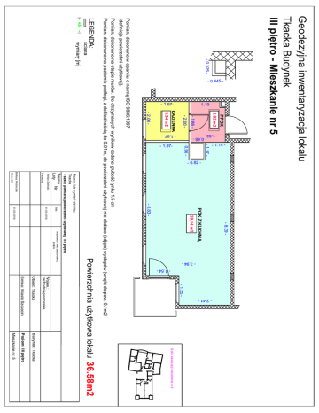 PPOK 2.92 m2 - 1.17 - - 0.96 - - 0.82 - - 0.68 - 1.63 - 1.97- - 8.39 - POK Z KUCHNIĄ 29.84 m2 - 6.83 - - 3.94 - 1.54 - - 1.55 - - 2.41 - ściana LEGENDA: wymiary [m] Sprawdzil Bartosz Woźniczko Pomierzyl Adrian Zieliński Tasma Nr Laty 31.03.2015r. 31.03.2015r. Data Szkic lokalizacji mieszkania nr 5 Obiekt: Tkacka Poziom: III piętro Budynek: Tkacka Mieszkanie nr: 5 Gmina: Miasto Szczecin Wojew.: zachodniopomorskie Powierzchnia użytkowa lokalu 36.58m2 Nazwisko i Imie (wykonawcy) podpis Nazwa lub symbol obiektu: Tkacka - szkic pomiaru powierzchni użytkowej - III piętro Pomiaru dokonano na etapie murów. Do otrzymanych wyników dodano grubość tynku 1.5 cm Pomiaru dokonano na poziomie podłogi, z dokładnością do 0.01m, do powierzchni użytkowej nie dodano (odjęto) występów (wnęk) do pow. 0.1m2 - 1.97- - 1.88 - 2.00 - 3.94 m2 ŁAZIENKA - 2.00 - - 1.14 - Geodezyjna inwentaryzacja lokalu Tkacka Budynek III piętro - Mieszkanie nr 5 - 0.325 - - 1.19 - 1.97- Pomiaru dokonano w oparciu o normę ISO 9836:1997 (definicja powierzchni użytkowej). - 0.445 -