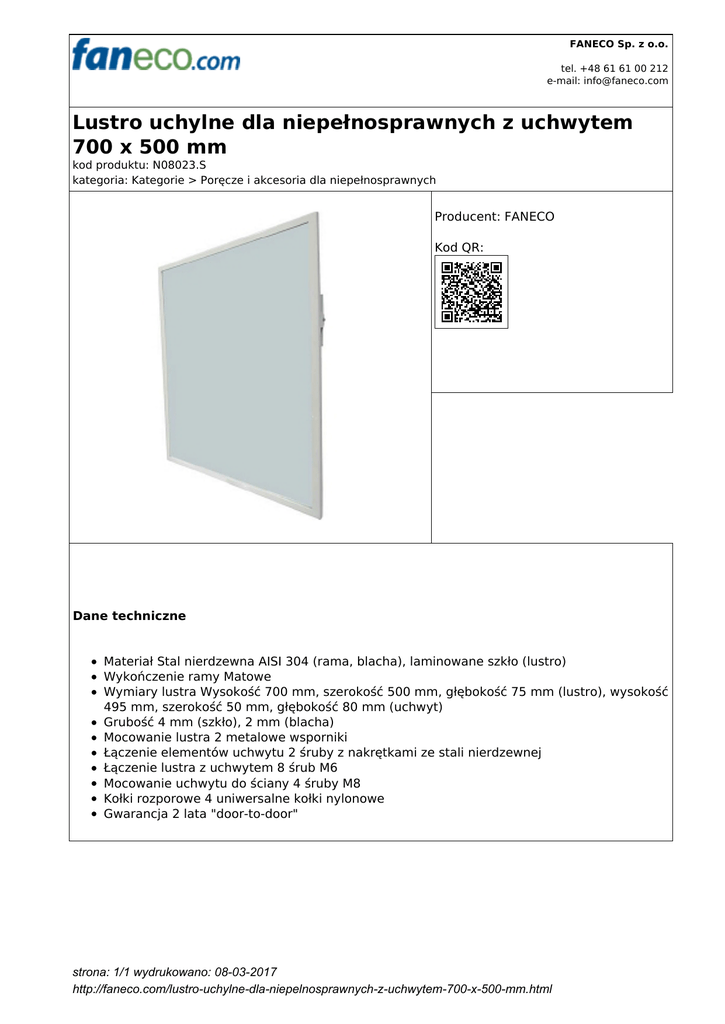 FANECO Sp. z o.o. tel. +48 61 61 00 212 e-mail: [email protected] Lustro uchylne dla niepełnosprawnych z uchwytem 700 x 500 mm kod produktu: N08023.S kategoria: Kategorie > Poręcze i akcesoria dla niepełnosprawnych Producent: FANECO Kod QR: Dane techniczne Materiał Stal nierdzewna AISI 304 (rama, blacha), laminowane szkło (lustro) Wykończenie ramy Matowe Wymiary lustra Wysokość 700 mm, szerokość 500 mm, głębokość 75 mm (lustro), wysokość 495 mm, szerokość 50 mm, głębokość 80 mm (uchwyt) Grubość 4 mm (szkło), 2 mm (blacha) Mocowanie lustra 2 metalowe wsporniki Łączenie elementów uchwytu 2 śruby z nakrętkami ze stali nierdzewnej Łączenie lustra z uchwytem 8 śrub M6 Mocowanie uchwytu do ściany 4 śruby M8 Kołki rozporowe 4 uniwersalne kołki nylonowe Gwarancja 2 lata "door-to-door" strona: 1/1 wydrukowano: 08-03-2017 http://faneco.com/lustro-uchylne-dla-niepelnosprawnych-z-uchwytem-700-x-500-mm.html