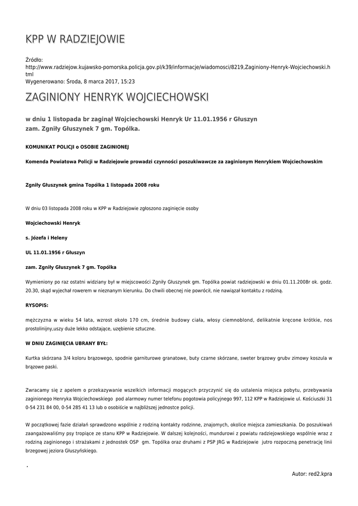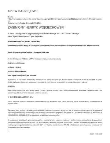 KPP W RADZIEJOWIE Źródło: http://www.radziejow.kujawsko-pomorska.policja.gov.pl/k39/informacje/wiadomosci/8219,Zaginiony-Henryk-Wojciechowski.h tml Wygenerowano: Środa, 8 marca 2017, 15:23 ZAGINIONY HENRYK WOJCIECHOWSKI w dniu 1 listopada br zaginął Wojciechowski Henryk Ur 11.01.1956 r Głuszyn zam. Zgniły Głuszynek 7 gm. Topólka. KOMUNIKAT POLICJI o OSOBIE ZAGINIONEJ Komenda Powiatowa Policji w Radziejowie prowadzi czynności poszukiwawcze za zaginionym Henrykiem Wojciechowskim Zgniły Głuszynek gmina Topólka 1 listopada 2008 roku W dniu 03 listopada 2008 roku w KPP w Radziejowie zgłoszono zaginięcie osoby Wojciechowski Henryk s. Józefa i Heleny UL 11.01.1956 r Głuszyn zam. Zgniły Głuszynek 7 gm. Topólka Wymieniony po raz ostatni widziany był w miejscowości Zgniły Głuszynek gm. Topólka powiat radziejowski w dniu 01.11.2008r ok. godz. 20.30, skąd wyjechał rowerem w nieznanym kierunku. Do chwili obecnej nie powrócił, nie nawiązał kontaktu z rodziną. RYSOPIS: mężczyzna w wieku 54 lata, wzrost około 170 cm, średnie budowy ciała, włosy ciemnoblond, delikatnie kręcone krótkie, nos prostolinijny,uszy duże lekko odstające, uzębienie sztuczne. W DNIU ZAGINIĘCIA UBRANY BYŁ: Kurtka skórzana 3/4 koloru brązowego, spodnie garniturowe granatowe, buty czarne skórzane, sweter brązowy grubv zimowy koszula w brązowe paski. Zwracamy się z apelem o przekazywanie wszelkich informacji mogących przyczynić się do ustalenia miejsca pobytu, przebywania zaginionego Henryka Wojciechowskiego pod alarmowy numer telefonu pogotowia policyjnego 997, 112 KPP w Radziejowie ul. Kościuszki 31 0-54 231 84 00, 0-54 285 41 13 lub o osobiście w najbliższej jednostce policji. W początkowej fazie działań sprawdzono wspólnie z rodziną kontakty rodzinne, znajomych, okolice miejsca zamieszkania. Do poszukiwań zaangażowaliśmy psy tropiące ze stanu KPP w Radziejowie. W dalszej kolejności, mundurowi z powiatu radziejowskiego wspólnie wraz z rodziną zaginionego i strażakami z jednostek OSP gm. Topólka oraz druhami z PSP JRG w Radziejowie jutro rozpoczną penetrację linii brzegowej jeziora Głuszyńskiego. . Autor: red2.kpra Publikacja: red2.kpra Ocena: 0/5 (0) Tweetnij