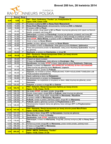 Brevet 200 km, 26 kwietnia 2014 Suma Skręt 0,00 0,00 C 3,00 12,90 3,00 3,00 15,90 18,90 P S P 1,40 20,30 S 6,50 4,70 9,10 0,30 4,60 0,30 26,80 31,50 40,60 40,90 45,50 45,80 P L P L P L 7,90 53,70 S 4,90 58,60 P 0,60 59,20 C 0,00 0,30 9,00 59,20 59,50 68,50 P L L 8,80 77,30 P 12,00 89,30 S 1,00 90,30 P 3,20 1,10 93,50 94,60 L P 4,20 98,80 L 6,60 105,40 P 0,30 105,70 C 0,00 0,40 18,70 0,40 0,80 0,30 105,70 106,10 124,80 125,20 126,00 126,30 S S S P P P 0,10 126,40 L 20,70 147,10 C 0,00 17,50 9,10 147,10 164,60 173,70 L L S 4,70 178,40 L 6,50 1,40 15,90 184,90 186,30 202,20 S L L 3,00 205,20 C Droga PK1 - Start, Delikatesy "Feniks" (ul. Partyzantów 9) Open: 8:00, Close: 9:00 W prawo w główną 630 na Nowy Dwór Mazowiecki Nowy Dwór Mazowiecki, skrzyzowanie, kontynuuj 630 na Gdańsk W prawo w 85 na Płock Rondo, prosto, drugi zjazd w 62 na Płock, trzymaj się głównej (miń zjazd na Serock, Modlin, przejedź nad trasą S7) Zakroczym, w prawo na Pieczoługi, trzymaj się głównej, przejedź nad trasą S7 Swobodnia, rozjazd, zjeżdżamy z głównej w lewą odnogę (w praktyce prosto) Znak STOP, Stara Wrona, w prawo w 571 na Nasielsk. Trzymaj się głównej Skręt w lewo na Nowe Miasto Joniec, po łuku, główną, w prawo na Nowe Miasto Za mostem w lewo na Sochocin, dalej główna przez Królewo, Idzikowice Przez skrzyzowanie prosto na Sochocin, dalej przez Kuchary Żydowskie, trzymaj sie głównej Sochocin, w prawo na Ciechanów, nr drogi 50 PK2 - Sochocin, Stacja benzynowa Orlen, po lewej stronie Open: 09:50, Close: 12:00 Wyjazd ze stacji w prawo W lewo na Karolinowo, dalej główną na Kondrajec i Rzy Karolinowo, na znaku STOP w lewo, dalej główna przez Radziewie i Dąbrowę Ojrzeń, w prawo na Gąsocin, NIE SKRĘCAĆ W DROGĘ 50 NA CIECHANÓW! Dalej trzymaj się głównej przez Bądkowo, Łopacin Gąsocin, rondo, prosto na Pułtusk Gąsocin, na rondzie w prawo. PRZEJECHAĆ TORY KOLEJOWE TUNELEM LUB PRZEJAZDEM NAZIEMNYM. Zjazd z głównej w lewo na Ostaszewo Na skrzyzowaniu w prawo na Ostaszewo Ostaszewo, na rozjeździe (z krzyżem) w lewo, dalej trzymaj sie głównej, przez Garnowo Gołymin, w prawo w drogę 60 na Ostrów PK3 - Gołymin, Stacja benzynowa Optima po lewej stronie Open: 11:30, Close: 15:10 Na znaku STOP, ze stacji, prosto, droga 618 Rondo, trzeci zjazd, droga 618 na Pułtusk, dalej trzymaj sie głównej Pułtusk, rondo, drugi zjazd, droga 618 na Warszawę i Wyszków W prawo w 618 na Warszawę, Wyszków Pułtusk, rondo w prawo, pierwszy zjazd, droga 61 na Warszawę Pułtusk, zjedź z głównej w prawo na Przyborowice w 571 Nieoznaczony rozjazd, kieruj sie główną, lewa odnoga (571 na Przyborowice i Nasielsk) PK4 - Nasielsk, Stacja benzynowa po lewej stronie przed MarcPolem Open: 12:50, Close: 18:00 Ze stacji w lewo, droga 571, na Naruszewo, trzymaj sie głównej Stara Wrona, w lewo na Zaręby Swobodnia, znak STOP, wjeżdżamy w główną Zakroczym, w lewo na Warszawę, droga 62, później kontynuuj 62 na Nowy Dwór Maz. Kontynuuj prosto drogą 85 na Warszawę, przez rondo prosto, później most W lewo w drogę 630 na Warszawę W lewo na Chotomów PK54 - META, Delikatesy "Feniks" Open: 14:50, Close: 21:30