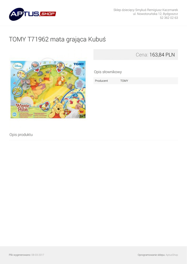 Sklep dziecięcy Smykuś Remigiusz Kaczmarek ul. Nowotoruńska 12, Bydgoszcz 52 362 02 63 TOMY T71962 mata grająca Kubuś Cena: 163,84 PLN Opis słownikowy Producent TOMY Opis produktu Plik wygenerowano: 08-03-2017 Powered by TCPDF (www.tcpdf.org) Oprogramowanie sklepu: AptusShop