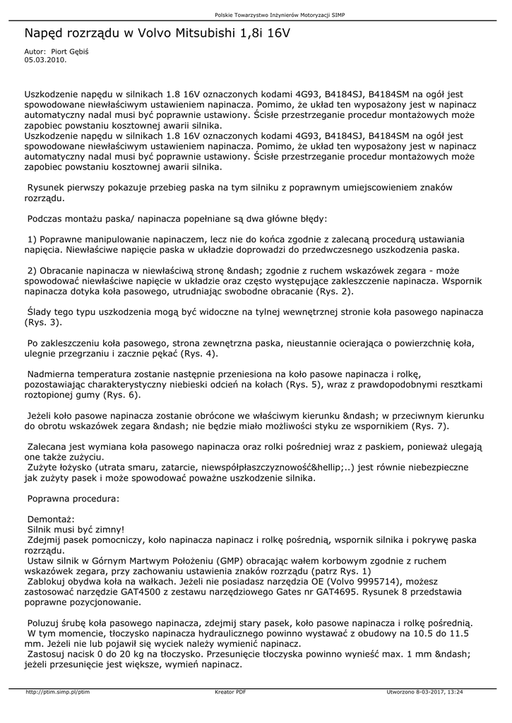 Polskie Towarzystwo Inżynierów Motoryzacji SIMP Napęd rozrządu w Volvo Mitsubishi 1,8i 16V Autor: Piort Gębiś 05.03.2010. Uszkodzenie napędu w silnikach 1.8 16V oznaczonych kodami 4G93, B4184SJ, B4184SM na ogół jest spowodowane niewłaściwym ustawieniem napinacza. Pomimo, że układ ten wyposażony jest w napinacz automatyczny nadal musi być poprawnie ustawiony. Ścisłe przestrzeganie procedur montażowych może zapobiec powstaniu kosztownej awarii silnika. Uszkodzenie napędu w silnikach 1.8 16V oznaczonych kodami 4G93, B4184SJ, B4184SM na ogół jest spowodowane niewłaściwym ustawieniem napinacza. Pomimo, że układ ten wyposażony jest w napinacz automatyczny nadal musi być poprawnie ustawiony. Ścisłe przestrzeganie procedur montażowych może zapobiec powstaniu kosztownej awarii silnika. Rysunek pierwszy pokazuje przebieg paska na tym silniku z poprawnym umiejscowieniem znaków rozrządu. Podczas montażu paska/ napinacza popełniane są dwa główne błędy: 1) Poprawne manipulowanie napinaczem, lecz nie do końca zgodnie z zalecaną procedurą ustawiania napięcia. Niewłaściwe napięcie paska w układzie doprowadzi do przedwczesnego uszkodzenia paska. 2) Obracanie napinacza w niewłaściwą stronę – zgodnie z ruchem wskazówek zegara - może spowodować niewłaściwe napięcie w układzie oraz często występujące zakleszczenie napinacza. Wspornik napinacza dotyka koła pasowego, utrudniając swobodne obracanie (Rys. 2). Ślady tego typu uszkodzenia mogą być widoczne na tylnej wewnętrznej stronie koła pasowego napinacza (Rys. 3). Po zakleszczeniu koła pasowego, strona zewnętrzna paska, nieustannie ocierająca o powierzchnię koła, ulegnie przegrzaniu i zacznie pękać (Rys. 4). Nadmierna temperatura zostanie następnie przeniesiona na koło pasowe napinacza i rolkę, pozostawiając charakterystyczny niebieski odcień na kołach (Rys. 5), wraz z prawdopodobnymi resztkami roztopionej gumy (Rys. 6). Jeżeli koło pasowe napinacza zostanie obrócone we właściwym kierunku – w przeciwnym kierunku do obrotu wskazówek zegara – nie będzie miało możliwości styku ze wspornikiem (Rys. 7). Zalecana jest wymiana koła pasowego napinacza oraz rolki pośredniej wraz z paskiem, ponieważ ulegają one także zużyciu. Zużyte łożysko (utrata smaru, zatarcie, niewspółpłaszczyznowość…..) jest równie niebezpieczne jak zużyty pasek i może spowodować poważne uszkodzenie silnika. Poprawna procedura: Demontaż: Silnik musi być zimny! Zdejmij pasek pomocniczy, koło napinacza napinacz i rolkę pośrednią, wspornik silnika i pokrywę paska rozrządu. Ustaw silnik w Górnym Martwym Położeniu (GMP) obracając wałem korbowym zgodnie z ruchem wskazówek zegara, przy zachowaniu ustawienia znaków rozrządu (patrz Rys. 1) Zablokuj obydwa koła na wałkach. Jeżeli nie posiadasz narzędzia OE (Volvo 9995714), możesz zastosować narzędzie GAT4500 z zestawu narzędziowego Gates nr GAT4695. Rysunek 8 przedstawia poprawne pozycjonowanie. Poluzuj śrubę koła pasowego napinacza, zdejmij stary pasek, koło pasowe napinacza i rolkę pośrednią. W tym momencie, tłoczysko napinacza hydraulicznego powinno wystawać z obudowy na 10.5 do 11.5 mm. Jeżeli nie lub pojawił się wyciek należy wymienić napinacz. Zastosuj nacisk 0 do 20 kg na tłoczysko. Przesunięcie tłoczyska powinno wynieść max. 1 mm – jeżeli przesunięcie jest większe, wymień napinacz. http://ptim.simp.pl/ptim Kreator PDF Utworzono 8-03-2017, 13:24 Polskie Towarzystwo Inżynierów Motoryzacji SIMP Wciśnij powoli tłoczysko (pionowo) do dołu do momentu, kiedy otwory tłoczyska znajdą się w jednej linii z korpusem napinacza. Włóż 2 mm zawleczkę zabezpieczającą (występuje w zestawie GAT4657 lub GAT91010)(Rys. 9). Montaż: Silnik musi być ustawiony w GMP! Zainstaluj ponownie stary lub nowy napinacz hydrauliczny (2 śruby, moment 13 Nm). Zamontuj koło pasowe napinacza i rolkę pośrednią (koło pasowe napinacza z otworem mimośrodowym na górnej powierzchni, 2 małe otwory nastawcze na spodzie) (Rys. 10). Obróć kołem wału korbowego o ½ zęba w kierunku przeciwnym do obrotu wskazówek zegara. Zainstaluj nowy pasek w następującej kolejności: wał korbowy, pompa wodna, rolka pośrednia, wałek zaworów wylotowych, wałek zaworów dolotowych, napinacz. Obróć koło pasowe napinacza (stosując narzędzie nastawcze GAT4577 dołączone do zestawu GAT4657) w kierunku przeciwnym do ruchu wskazówek zegara w stronę paska i dokręć śrubę (Rys. 11). Odblokuj koła pasowe wałków rozrządu i sprawdź czy znaki rozrządu znajdują się we właściwym miejscu Obróć kołem na wale +/- 90° w kierunku przeciwnym do ruchu wskazówek zegara Obróć kołem na wale +/- 90° w kierunku obrotu wskazówek zegara do momentu ustawienia w GMP (wszystkie znaki rozrządu ustawione poprawnie) Poluzuj śrubę koła pasowego napinacza Obróć koło pasowe napinacza (narzędzie GAT 4577 i klucz dynamometryczny) w kierunku przeciwnym do ruchu wskazówek zegara w stronę paska, z siłą 2.5 to 4.0 Nm Dokręć śrubę koła pasowego napinacza (50 Nm) UWAGA: należy unieruchomić koło pasowe podczas dokręcania śruby! Usuń 2 mm zawleczkę zabezpieczającą z napinacza hydraulicznego Obróć silnikiem 720° w kierunku obrotu wskazówek zegara do momentu ustawienia w GMP (znaki rozrządu ustawione w poprawnie) Pozostaw silnik w takim stanie na 5 kolejne minut Tłoczysko powinno wystawać teraz z korpusu napinacza na długość od 3.8 do 4.5 mm. Jeżeli nie mieści się w podanej tolerancji należy powtórzyć procedurę napinania do momentu uzyskania właściwego pozycjonowania. Zainstaluj ponownie pozostałe zdemontowane części Wnioski: •Pracuj zawsze na zimnym silniku •Wymieniaj pasek, koło pasowe napinacza i rolkę pośrednią w tym samym czasie •Obracaj kołem pasowym napinacza wyłącznie w kierunku przeciwnym do ruchu wskazówek zegara •Zwracaj szczególną uwagę na poprawne ustaw
