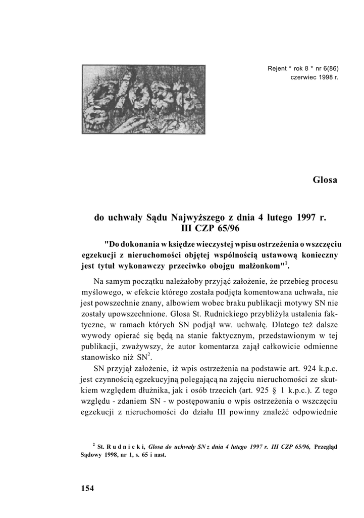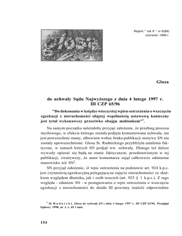 Rejent * rok 8 * nr 6(86) czerwiec 1998 r. Glosa do uchwały Sądu Najwyższego z dnia 4 lutego 1997 r. III CZP 65/96 "Do dokonania w księdze wieczystej wpisu ostrzeżenia o wszczęciu egzekucji z nieruchomości objętej wspólnością ustawową konieczny jest tytuł wykonawczy przeciwko obojgu małżonkom"1. Na samym początku należałoby przyjąć założenie, że przebieg procesu myślowego, w efekcie którego została podjęta komentowana uchwała, nie jest powszechnie znany, albowiem wobec braku publikacji motywy SN nie zostały upowszechnione. Glosa St. Rudnickiego przybliżyła ustalenia faktyczne, w ramach których SN podjął ww. uchwałę. Dlatego też dalsze wywody opierać się będą na stanie faktycznym, przedstawionym w tej publikacji, zważywszy, że autor komentarza zajął całkowicie odmienne stanowisko niż SN2. SN przyjął założenie, iż wpis ostrzeżenia na podstawie art. 924 k.p.c. jest czynnością egzekucyjną polegającą na zajęciu nieruchomości ze skutkiem względem dłużnika, jak i osób trzecich (art. 925 § 1 k.p.c.). Z tego względu - zdaniem SN - w postępowaniu o wpis ostrzeżenia o wszczęciu egzekucji z nieruchomości do działu III powinny znaleźć odpowiednie 2 St. R u d n i c k i, Glosa do uchwały SN z dnia 4 lutego 1997 r. III CZP 65/96, Przegląd Sądowy 1998, nr 1, s. 65 i nast. 154 Glosa zastosowanie zasady rządzące postępowaniem egzekucyjnym. Na poparcie tego zdania SN powołał przepisy art. 787 i 776 k.p.c., z których wynika, iż do egzekucji z majątku objętego wspólnością ustawową małżeńską prowadzonej na podstawie tytułu wykonawczego wydanego tylko przeciwko jednemu małżonkowi, konieczna jest klauzula wykonalności wystawiona przeciwko małżonkowi dłużnika. Ponadto pogląd ten został dodatkowo wsparty przywołanym stanowiskiem zajętym w uchwale 7 sędziów SN z dnia 20 września 1996 r., z której wynika, że tytuł wykonawczy przeciwko osobie pozostającej w związku małżeńskim nie uprawnia do prowadzenia egzekucji z nieruchomości objętej wspólnością ustawową bez nadania tytułowi egzekucyjnemu klauzuli wykonalności przeciwko małżonkowi tej osoby3. Temu stanowisku przeciwstawił się St. Rudnicki4. Zdaniem tego autora, sąd wieczystoksięgowy w ramach kognicji zakreślonej przepisem art. 46 ustawy z dnia 6 lipca 1982 r. o księgach wieczystych i hipotece (Dz.U. Nr 19, poz. 147 ze zm. - zwana dalej u.k.w.h.) nie jest uprawniony do badania prawidłowości wszczęcia postępowania egzekucyjnego skierowanego do nieruchomości. Uważa, że sąd ten nie jest organem egzekucyjnym i poza wpisem hipoteki przymusowej w oparciu o przepis art. 109 u.k.w.h. jego czynności procesowe nie mają charakteru czynności egzekucyjnych. Komentator podkreślił, że takie zajęcie rzeczy jest wprawdzie wadliwe z egzekucyjnego punktu widzenia, ale dla małżonka dłużnika ustawodawca przewidział środek obrony w postaci skargi na czynności komornika (art. 7671 k.p.c. w zw. z art. 41 § 3 k.r.o.). Z tych właśnie względów St. Rudnicki skonkludował, że dokonanie w księdze wieczystej wpisu o wszczęciu egzekucji z nieruchomości objętej wspólnością ustawową może nastąpić w razie wszczęcia egzekucji na podstawie tytułu wykonawczego wydanego przeciwko jednemu małżonkowi. Z tego krótkiego przeglądu stanowisk już na wstępie wynika, że zarówno SN, jak i St. Rudnicki podeszli do omawianej problematyki w zasadzie tylko z jednej strony, tj. z punktu widzenia przepisów egzekucyjnych unormowanych w k.p.c. Mimo to efektem ich procesów myślowych stały się całkowicie rozbieżne wyniki rozumowania. W zasadzie identyczne stano- 3 4 III CZP 60/96, OSNIC 1996, nr 11, poz. 140. Patrz przyp. 2. 155 Wiesław Sługiewicz wisko jak St. Rudnicki zajmuje M. Armata, koncentrując się na tej problematyce również od strony egzekucji 5 . Przy tym samym założeniu (stan faktyczny oraz obowiązujące unormowania) proces logicznego myślenia powinien dać zawsze ten sam wynik, bez względu na ilość podmiotów dokonujących subsumcji. Jest to oczywiście tylko teoretyczny model pracy prawnika. Jednakże pozwala przyjąć, że w wypadku rozbieżnych wyników końcowych popełniony został błąd albo w założeniu, albo też w procesie myślenia (pomijam możliwość jego zaistnienia w obu tych sferach jednocześnie). Zważywszy na wagę problemu, konieczna wydaje się próba dalszego pogłębienia omawianej problematyki. W doktrynie zresztą podnosi się, że zagadnienia dotyczące kognicji sądu wieczystoksięgowego niejednokrotnie nastręczają trudności natury interpretacyjnej 6 . Sąd wieczystoksięgowy nie jest i nigdy nie był zaliczany w poczet organów egzekucyjnych. Ustawodawca w przepisach art. 758 i 759 § 1 k.p.c. wskazał jednoznacznie, że sprawy egzekucyjne należą do właściwości sądów rejonowych i działających przy tych sądach komorników oraz że czynności egzekucyjne są wykonywane przez komorników z wyjątkiem czynności zastrzeżonych dla sądów. Oczywiście mowa jest o sądach cywilnych i rodzinnych 7 . Jeżeli chodzi o stosunek przepisów normujących postępowanie egzekucyjne do procedury wieczystoksięgowej, to orzecznictwo wypracowało stanowisko, z którego wynika, iż postępowanie dotyczące wpisu hipoteki przymusowej stanowi postępowanie egzekucyjne, ponieważ normy o hipotece przymusowej mają wyraźny charakter norm egzekucyjnych 8 . Uzupełnić powyższe można jeszcze tym, iż wnioski o wpis ostrzeżenia o wszczęciu egzekucji z nieruchomości do działu III, tj. wzmianki egzekucyjnej na podstawie art. 924 k.p.c., również muszą pociągać za sobą - poza zajęciem - inne jeszcze skutki egzekucyjno-procesowe. Zdarzają się s M. A r m a t a, Glosa do uchwały (7) SN z dnia 20 września 1996 r. III CZP 60/96, Przegląd Sądowy 1998, nr 2, s. 123 i nast. ust. 1 ustawy o księgach wieczystych i hipotece. Przegląd Sądowy 1997, nr 3, s. 33 i nast. 7 E. W e n g c r c k ,