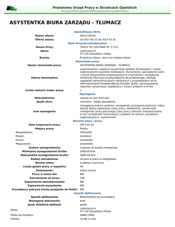 Powiatowy Urząd Pracy w Strzelcach Opolskich http://pup-strzelce.pl/oferta/4590/asystentka-biura-zarzadu-tlumacz ASYSTENTKA BIURA ZARZĄDU - TŁUMACZ Identyfikacja oferty Numer oferty: StPr/17/0316 Oferta ważna: od 2017-02-22 do 2017-03-31 Dane firmy/przedsiębiorstwa Nazwa firmy: Adres: Branża: TRACK TEC KOLTRAM SP. Z O.O. Lubliniecka 6 47-120 Zawadzkie, Polska Produkcja żeliwa i stali oraz stopów żelaza Stanowisko pracy Nazwa stanowiska pracy: Zakres obowiązków: Liczba wolnych miejsc pracy: ASYSTENTKA BIURA ZARZĄDU - TŁUMACZ organizowanie i wsparcie asystenckie spotkań biznesowych i narad, organizowanie wyjazdów służbowych, tłumaczenie, sporządzenie pism i innych dokumentów korporacyjnych w j.niemieckim, zarządzanie hierarchią informacji przybywających do przełożonego, obsługa zagadnień administracyjnych zwiazanych z prowadzeniem biura, administrowanie korespondencją Zarządu Spółki, opracowywanie raportów i prezentacji, współpraca z innymi działami w firmie 1 Wymagania Wykształcenie: Języki obce: Inne wymagania: wyższe (w tym licencjat) niemiecki - biegły (pożądane) nienaganna kultura osobista, umiejętność zachowania dyskrecji i taktu bardzo dobra organizacja czasu pracy, dokładność, sumienność; umiejętność pracy pod presją czasu pracy zdolności interpersonalne, w tym umiejetność komunikacji z osobami na różnych szczeblach organizacyjnych, asertywność, Warunki płacy i pracy Data rozpoczęcia pracy: Miejsce pracy: 2017-02-22 Polska Województwo: OPOLSKIE Powiat: strzelecki Gmina: Zawadzkie Miejscowość: Zawadzkie System wynagrodzenia: Czasowy ze stawką miesięczną Minimalne wynagrodzenie brutto: 2000.00 PLN Maksymalne wynagrodzenie brutto: 3000.00 PLN Rodzaj zatrudnienia: Wymiar etatu: Liczba godzin pracy w tygodniu: Zmianowość: Umowa o pracę w zastępstwie w pełnym wymiarze 40 jedna zmiana Praca w wolne dni: NIE Zatrudnienie od zaraz: TAK Zapewnienie zakwaterowania: NIE Zapewnienie wyżywienia: NIE Pracodawca pokrywa koszty przejazdu do Polski: NIE Sposób Aplikowania Sposób aplikowania: Bezpośrednio do pracodawcy Wymagane dokumenty: brak Język składania aplikacji: polski Adres: Lubliniecka 6 47-120 Zawadzkie, Polska Osoba do kontaktu: ANNA ĆMIEL Telefon: 32 66 11 024 Adres e-mail: pokaż adres Czy oferta jest subsydiowana: NIE Czy oferta jest finansowana z PFRON: NIE Upowszechnienie krajowej oferty pracy na terenie NIE państw EOG: