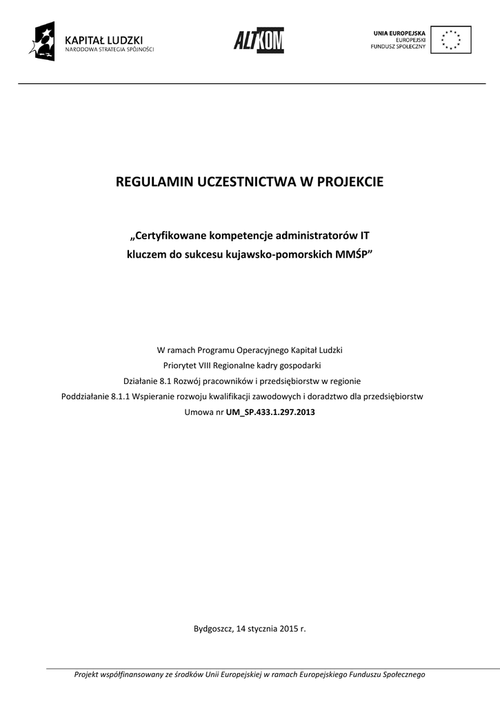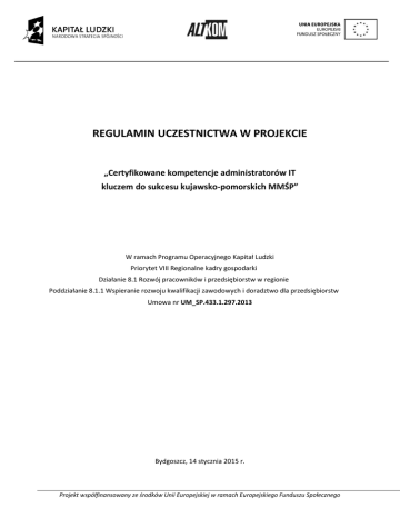 REGULAMIN UCZESTNICTWA W PROJEKCIE „Certyfikowane kompetencje administratorów IT kluczem do sukcesu kujawsko-pomorskich MMŚP” W ramach Programu Operacyjnego Kapitał Ludzki Priorytet VIII Regionalne kadry gospodarki Działanie 8.1 Rozwój pracowników i przedsiębiorstw w regionie Poddziałanie 8.1.1 Wspieranie rozwoju kwalifikacji zawodowych i doradztwo dla przedsiębiorstw Umowa nr UM_SP.433.1.297.2013 Bydgoszcz, 14 stycznia 2015 r. Projekt współfinansowany ze środków Unii Europejskiej w ramach Europejskiego Funduszu Społecznego §1 PRZEPISY OGÓLNE 1. Regulamin określa warunki rekrutacji i uczestnictwa Uczestników Projektu w ramach projektu „Certyfikowane kompetencje administratorów IT kluczem do sukcesu kujawsko-pomorskich MMŚP” realizowanego w ramach Programu Operacyjnego Kapitał Ludzki, Priorytet VIII Regionalne kadry gospodarki, Działanie 8.1 Rozwój pracowników i przedsiębiorstw w regionie, Poddziałanie 8.1.1 Wspieranie rozwoju kwalifikacji zawodowych i doradztwo dla przedsiębiorstw. 2. Projekt jest współfinansowany przez Unię Europejską w ramach Europejskiego Funduszu Społecznego. 3. Wszystkie decyzje podejmowane w oparciu o regulamin są zgodne z umową nr UM_SP.433.1.297.2013 o dofinansowanie projektu „Certyfikowane kompetencje administratorów IT kluczem do sukcesu kujawsko-pomorskich MMŚP” z dnia 18 lipca 2013 roku, zawartą pomiędzy Altkom Akademia S.A., a Urzędem Marszałkowskim Województwa Kujawsko-Pomorskiego. 4. Okres realizacji Projektu: 01.07.2013 roku – 31.05.2015 roku. 5. Obszar realizacji Projektu: województwo kujawsko-pomorskie. §2 SŁOWNIK POJĘĆ Użyte w niniejszym Regulaminie pojęcia oznaczają: 1. Projekt: „Certyfikowane kompetencje administratorów IT kluczem do sukcesu kujawsko-pomorskich MMŚP”. 2. Regulamin: należy przez to rozumieć niniejszy Regulamin uczestnictwa w Projekcie określający zasady rekrutacji i realizacji Projektu. Regulamin jest dostępny na stronie internetowej Projektu. 3. Uczestnik Projektu: mikro, mały lub średni przedsiębiorca mający jednostkę organizacyjną (siedzibę, filię, delegaturę, oddział czy inną prawnie dozwoloną formę organizacyjną działalności podmiotu) położoną na terenie województwa kujawsko-pomorskiego i jego pracownicy zatrudnieni na podstawie umowy o pracę, umowy cywilno-prawnej lub samozatrudnieni, których miejsce pracy znajduje się na terenie województwa kujawsko-pomorskiego. 4. Przedsiębiorca: to osoba fizyczna, osoba prawna i jednostka organizacyjna niebędąca osobą prawną, której odrębna ustawa przyznaje zdolność prawną – wykonująca we własnym imieniu działalność gospodarczą. Za przedsiębiorców uznaje się także wspólników spółki cywilnej w zakresie wykonywanej przez nich działalności gospodarczej. (art. 4 Ustawy z dnia 2 lipca 2004 r. o swobodzie działalności gospodarczej; Dz. U. z 2007 r., Nr 155, poz. 1095, z późn. zm.). 5. Pracownik: to osoba zatrudniona na podstawie umowy o pracę, powołania, wyboru, mianowania, spółdzielczej umowy o pracę lub umowy cywilno-prawnej (Ustawa z dnia 26 czerwca 1974 r., Kodeks Pracy, tekst jednolity: Dz. U. 1998 r. Nr 21 poz. 94 z późn. zm.). 6. Samozatrudnieni – osoby fizyczne prowadzące działalność gospodarczą, niezatrudniające pracowników. 7. MMŚP – mikro- (w tym samozatrudnieni), małe i średnie przedsiębiorstwa, w rozumieniu art. 4 Ustawy z dnia 2 lipca 2004 r. o swobodzie działalności gospodarczej (Dz. U. z 2007 r., Nr 155, poz. 1095, z późn. zm.). 8. Beneficjent: Altkom Akademia S.A., zwana dalej „Akademią”. 9. Siedziba Beneficjenta: ul. Chłodna 51, 00-867 Warszawa. 10. Biuro Projektu: Altkom Akademia S.A., ul. Powstańców Wielkopolskich 26, 85-090 Bydgoszcz 11. POKL: Program Operacyjny Kapitał Ludzki. 12. Instytucja Pośrednicząca II stopnia (IP II): Urząd Marszałkowski Województwa Kujawsko-Pomorskiego. 13. Umowa o dofinansowanie: umowa o dofinansowanie Projektu w ramach Programu Operacyjnego Kapitał Ludzki pt. „Certyfikowane kompetencje administratorów IT kluczem do sukcesu kujawskopomorskich MMŚP”, nr Umowy UM_SP.433.1.297.2013. Projekt współfinansowany ze środków Unii Europejskiej w ramach Europejskiego Funduszu Społecznego Strona 2 z 8 14. Strona internetowa Projektu – www.altkomakademia.pl/bydgoszczIT §3 CEL PROJEKTU 1. Celem głównym Projektu jest wzrost konkurencyjności 110 MMŚP województwa kujawsko-pomorskiego poprzez wzrost kompetencji 248 Administratorów/rek i Specjalistów/tek IT, z co najwyżej średnim wykształceniem w wyniku przeprowadzonych certyfikowanych szkoleń IT do 05.2015 r. 2. Cel główny zostanie osiągnięty do 31 maja 2015 r. w województwie kujawsko-pomorskim przez spełnienie celów szczegółowych tj.: a. Podniesienie wiedzy i umiejętności dotyczących Administratorów/rek systemem RedHat Linux przez 64 Administratorów/rek IT z 40 MMŚP województwa kujawsko-pomorskiego do 05.2015 r. b. Podniesienie wiedzy i umiejętności dotyczących konfiguracji i zarządzania Windows 7 przez 32 Administratorów/rek IT z 20 MMŚP województwa kujawsko-pomorskiego do 05.2015 r. c. Podniesienie wiedzy i umiejętności dotyczących Technologii Active Directory i Sieciowych przez 64 Administratorów/rek IT z 40 MMŚP województwa kujawsko-pomorskiego do 05.2015 r. d. Wzrost kwalifikacji dotyczących zarządzania projektami oraz serwisami IT przez 150 Specjalistów/tek IT z 56 MMŚP województwa kujawsko-pomorskiego do 05.2015 r. §4 GRUPA DOCELOWA 1. Grupę docelową stanowi 110 mikro, małych i średnich przedsiębiorstw z branży IT posiadających jednostkę organizacyjną (siedzibę, oddział, filię) w woj. kujawsko-pomorskim oraz ich pracownicy zatrudnieni na podstawie umowy o pracę, w tym osoby samozatrudnione, zatrudnieni lub wykonujący pracę w dziale IT na stanowisku: administrator/ka systemów i baz danych, administrator/ka sieci komputerowej, specjalista/ka bezpieczeństwa IT, inżynier/