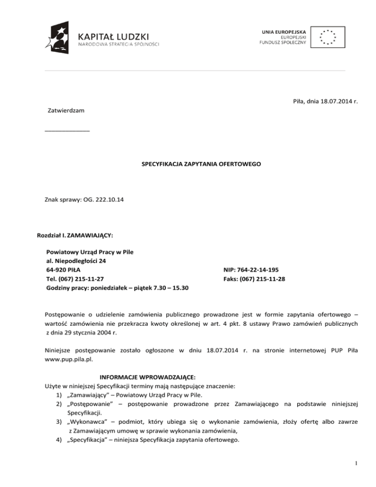 Piła, dnia 18.07.2014 r. Zatwierdzam _____________ SPECYFIKACJA ZAPYTANIA OFERTOWEGO Znak sprawy: OG. 222.10.14 Rozdział I. ZAMAWIAJĄCY: Powiatowy Urząd Pracy w Pile al. Niepodległości 24 64-920 PIŁA Tel. (067) 215-11-27 Godziny pracy: poniedziałek – piątek 7.30 – 15.30 NIP: 764-22-14-195 Faks: (067) 215-11-28 Postępowanie o udzielenie zamówienia publicznego prowadzone jest w formie zapytania ofertowego – wartość zamówienia nie przekracza kwoty określonej w art. 4 pkt. 8 ustawy Prawo zamówień publicznych z dnia 29 stycznia 2004 r. Niniejsze postępowanie zostało ogłoszone w dniu 18.07.2014 r. na stronie internetowej PUP Piła www.pup.pila.pl. INFORMACJE WPROWADZAJĄCE: Użyte w niniejszej Specyfikacji terminy mają następujące znaczenie: 1) „Zamawiający” – Powiatowy Urząd Pracy w Pile. 2) „Postępowanie” – postępowanie prowadzone przez Zamawiającego na podstawie niniejszej Specyfikacji. 3) „Wykonawca” – podmiot, który ubiega się o wykonanie zamówienia, złoży ofertę albo zawrze z Zamawiającym umowę w sprawie wykonania zamówienia, 4) „Specyfikacja” – niniejsza Specyfikacja zapytania ofertowego. 1 Rozdział II. Przedmiot zamówienia: Przedmiotem zamówienia jest zorganizowanie i przeprowadzenie szkolenia „Profesjonalny sprzedawca z obsługą kasy fiskalnej oraz terminalem kart płatniczych” dla 10 osób. • Czas trwania szkolenia – w ciągu 33 dni roboczych: 230 godzin zegarowych zajęć, w tym: 150 godzin zajęć teoretycznych i 80 godzin praktyki u pracodawcy. • Program szkolenia musi obejmować zagadnienia dotyczące: w części teoretycznej: - obowiązujących przepisów prawno-fiskalnych, - przepisów BHP oraz p.poż. na stanowisku pracy, - technik skutecznej sprzedaży, - etyki zawodowej w zawodzie sprzedawcy, - podstawowych pojęć dotyczących urządzeń fiskalnych, - obowiązków właściciela oraz użytkownika kasy fiskalnej, - wystawiania faktur VAT i rachunków, - podstawowej obsługi programów sprzedażowych, - budowy i zasad działania oraz podziału urządzeń fiskalnych, - teoretycznej i praktycznej obsługi kasy fiskalnej, w tym przygotowania kasy do pracy, programowania kasy, wykonywania raportów, - współpracy kas z urządzeniami dodatkowymi: czytnikiem kodów, komputerem itp., - omówienia danych występujących na paragonie, - przepisów dot. reklamacji i gwarancji towarowych, - dostosowywania asortymentu do warunków rynku. - kodów towarowych i elementów oprogramowania, - zasad stosowania terminali płatniczych, - obsługi terminala kart płatniczych, - bezpieczeństwa transakcji bezgotówkowych, autoryzacji transakcji i potwierdzania autentyczności karty płatniczej. w części praktycznej: - zmiany rolek papieru kontrolnego i paragonowego, - rodzajów sprzedaży na kasie fiskalnej i z monitorem, - sprzedaży z rabatem lub marżą od całości zakupów i od pojedynczego towaru, - korygowania błędnie wprowadzonej pozycji, - wpłaty i wypłaty gotówki z kasy, - otwierania szuflady bez dokonywania transakcji, - zakończenia paragonu, - raportów i ich rodzajów. 2 • Na zakończenie szkolenia uczestnicy muszą otrzymać zaświadczenia o ukończeniu szkolenia wydane na podstawie § 18 ust. 2 rozporządzenia Ministra Edukacji Narodowej z dnia 11 stycznia 2012 r. w sprawie kształcenia ustawicznego w formach pozaszkolnych (Dz.U. poz. 186) lub inne równoważne wydane zgodnie z obowiązującymi przepisami prawa. • Szkolenie musi zakończyć się egzaminem, przeprowadzonym z zachowaniem obiektywizmu, potwierdzającym umiejętności i/lub kompetencje i/lub kwalifikacje uczestników. W pracach komisji egzaminacyjnej udział weźmie pracownik Powiatowego Urzędu Pracy w Pile. Wykonawca zobowiązany będzie do dostarczenia dokumentów potwierdzających zdanie egzaminu przez uczestników szkolenia oraz kserokopii arkusza przebiegu egzaminu. Koszt w/w egzaminu należy ująć w cenie szkolenia. • Zajęcia praktyczne mają zostać zorganizowane przez instytucję szkoleniową i odbywać się w formie praktyki u pracodawcy (w wymiarze 80 godzin zajęć). INNE INFORMACJE: Szkolenie musi być realizowane według planu nauczania obejmującego przeciętnie nie mniej niż 25 godzin zegarowych w tygodniu (godzina zegarowa szkolenia liczy 60 minut i obejmuje zajęcia edukacyjne 45 min. oraz przerwę liczącą 15 minut), chyba że przepisy odrębne przewidują niższy wymiar szkolenia. Szkolenie musi odbywać się w dni robocze, w przedziale czasowym między godz. 8.00 a 17.00 z zachowaniem bezpiecznych i higienicznych warunków pracy i nauki. Czas trwania szkolenia nie może przekroczyć 7 godzin dziennie. Usługa szkoleniowa winna być wykonana: • w dostosowanych ilościowo i jakościowo pomieszczeniach, z uwzględnieniem bezpiecznych i higienicznych warunków pracy i nauki, zgodnie z rozporządzeniem MPiPS z dnia 26 września 1997 r. w sprawie ogólnych przepisów bezpieczeństwa i higieny pracy (tekst jednolity Dz. U. z 2003r. Nr 169, poz. 1650 z późniejszymi zmianami), • w lokalach wyposażonych w odpowiedni sprzęt dydaktyczny i niezbędne pomoce dydaktyczne dostosowane do prowadzenia szkoleń będących przedmiotem zamówienia. Zajęcia praktyczne (jeśli są w programie szkolenia) winny być przeprowadzone z wykorzystaniem odpowiedniej bazy i przy użyciu niezbędnego sprzętu. Wykonawca winien zagwarantować uczestnikom szkolenia w każdym dniu zajęć catering w postaci ciepłych i zimnych napojów (w szczególności kawa, herbata, woda mineralna) i poczęstunku (np. ciastka, pączki, bułki słodkie, kanapki itp.) oraz wydzielić miejsce zapewniające swobodne spożycie posiłku. Rozdział III. Termin i miejsce wykonania zamówienia. III.1 Wymagany termin realizacji zamówienia: 09.09.2014 – 23.10.2014 r. III.2. Miejsce wykonania zamówienia: • PIŁA Rozdział IV. Dokumenty wymagane od wykonawcy: • Formularz OFERTA – wg zał. nr 1 do Specyfikacji. • Formularz PROGRAM SZKOLENIA – 