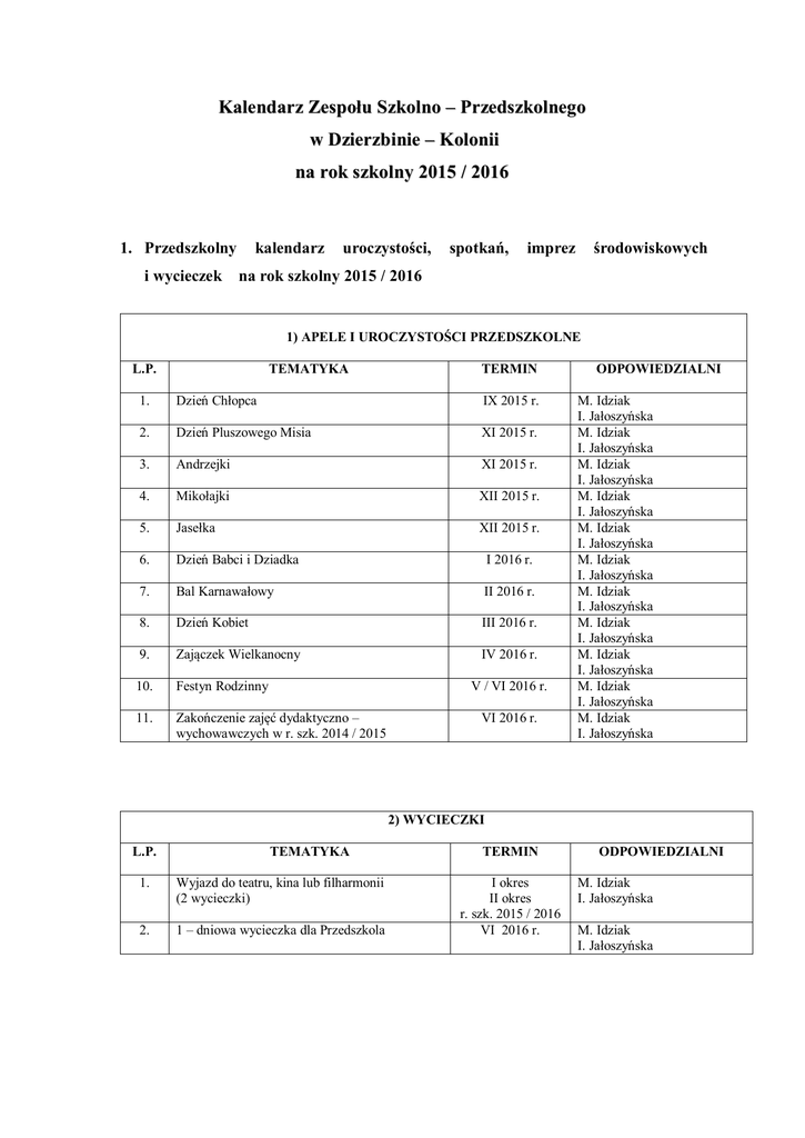 Kalendarz Zespołu Szkolno – Przedszkolnego w Dzierzbinie – Kolonii na rok szkolny 2015 / 2016 1. Przedszkolny i wycieczek kalendarz uroczystości, spotkań, imprez środowiskowych na rok szkolny 2015 / 2016 1) APELE I UROCZYSTOŚCI PRZEDSZKOLNE L.P. TEMATYKA TERMIN 1. Dzień Chłopca IX 2015 r. 2. Dzień Pluszowego Misia XI 2015 r. 3. Andrzejki XI 2015 r. 4. Mikołajki XII 2015 r. 5. Jasełka XII 2015 r. 6. Dzień Babci i Dziadka I 2016 r. 7. Bal Karnawałowy II 2016 r. 8. Dzień Kobiet III 2016 r. 9. Zajączek Wielkanocny IV 2016 r. 10. Festyn Rodzinny 11. Zakończenie zajęć dydaktyczno – wychowawczych w r. szk. 2014 / 2015 V / VI 2016 r. VI 2016 r. ODPOWIEDZIALNI M. Idziak I. Jałoszyńska M. Idziak I. Jałoszyńska M. Idziak I. Jałoszyńska M. Idziak I. Jałoszyńska M. Idziak I. Jałoszyńska M. Idziak I. Jałoszyńska M. Idziak I. Jałoszyńska M. Idziak I. Jałoszyńska M. Idziak I. Jałoszyńska M. Idziak I. Jałoszyńska M. Idziak I. Jałoszyńska 2) WYCIECZKI L.P. TEMATYKA 1. Wyjazd do teatru, kina lub filharmonii (2 wycieczki) 2. 1 – dniowa wycieczka dla Przedszkola TERMIN I okres II okres r. szk. 2015 / 2016 VI 2016 r. ODPOWIEDZIALNI M. Idziak I. Jałoszyńska M. Idziak I. Jałoszyńska 2. Szkolny kalendarz uroczystości, spotkań, imprez środowiskowych, konkursów i wycieczek na r. szk. 2015 / 2016 1) APELE I UROCZYSTOŚCI SZKOLNE L.P. TEMATYKA TERMIN 1. 2. 3. 4. Inauguracja roku szkolnego Dzień Patrona Szkoły. Dzień Chłopca Europejski Dzień Języków 5. 6. 7. 8. 9. Dzień Papieski Dzień Edukacji Narodowej Ślubowanie kl. 1 Pasowanie pierwszoklasistów na czytelników Halloween 10. Święto Niepodległości XI 2015 r. K. Milewska B. Wieczorkiewicz Wychowawcy klas B. Wieczorkiewicz Ż. Zygmunt K. Milewska Opiekun SU - G. Dębińska A. Chorąży T. Korkosz G. Dębińska B. Wieczorkiewicz Ż. Zygmunt Ż. Zygmunt 11. Jasełka XII 2015 r. K. Milewska 12. Choinka Noworoczna I 2015 r. 13. Dzień Babci i Dziadka II 2016 r. 14. Walentynki II 2016 r. 15. Dzień Kobiet III 2016 r. E. Matusiak - koordynator A. Chorąży T. Korkosz E. Matusiak - koordynator A. Chorąży T. Korkosz Opiekun SU- G. Dębińska B. Wieczorkiewicz G. Dębińska R. Wieczorek 16. Dzień Wiosny, Dzień Talentów i Samorządności Projekt edukacyjny w ramach programu „Bajki naszych marzeń” Gry i zabawy dla klas I - III Kwiecień Miesiącem Zdrowia – występ artystyczny promujący zdrowy styl życia spotkanie z pielęgniarką Konstytucja 3 – go Maja Święto Rodziny / Dzień Matki i Dziecka Festyn Rodzinny Dyskoteka dla klas I - III Dzień Sportu III 2016 r. Wychowawcy klas IV 2016 r. Wychowawcy klas I - III R. Wieczorek V 2016 r. V 2016 r. Ż. Zygmunt Wychowawcy klas I – III 17. 18. 19. 20. 21. 22. 23. Zawody szkolne zgodne z kalendarzem imprez sportowych Pożegnanie absolwentów szkoły – kl. VI Program na zakończenie roku szkolnego 2014 / 2015 Inauguracja roku szkolnego 2016 / 2017 IX 2015 r. IX 2015 r. IX 2015 r. X 2015 r. ODPOWIEDZIALNI X 2015 r. X 2015 r. X 2015 r. X 2015 r. X/XI 2014 r. VI 2016 r. 2015 / 2016 Wychowawcy klas IV - VI R. Wieczorek T. Korkosz R. Wieczorek VI 2016 r. B. Wieczorkiewicz G. Dębińska IX 2016 r. R. Wieczorek 2) KONKURSY L.P. TEMATYKA TERMIN 1. Konkurs Czytelniczy – całoroczny kl. IV-VI IX – V 2015 / 2016 2. 3. 4. Olimpiada Wiedzy ARCHIMEDES.PLUS – LINGUA.PLUS XX Gminny Konkurs Ortograficzny Wojewódzki Konkurs J. polskiego 5. Wojewódzki Konkurs Matematyczny 6. Wojewódzki Konkurs Przyrodniczy 7. Wojewódzki Konkurs J. angielskiego 8. 9. 10. 11. 12. XX Konkurs Wiedzy o Wielkopolsce Szkolny Konkurs Matematyczny dla kl. IV-VI ,,Wyścigi rzędów’’ Tworzenie spójnych tekstów kl. IV - VI Konkurs BRD 13. 14. XI Międzyszkolny Konkurs Mitologiczny Tworzenie spójnych tekstów kl. II - III IV 2016 r. V 2016 r. 15. V 2016 r. 16. 17. 18.. 19. 20. 21. Olimpiada Wiedzy ARCHIMEDES.PLUS – MATEMATYKA.PLUS Gminny Konkurs Matematyczny Mała Olimpiada Matematyczna Konkurs ,,Matematyk Roku’’ kl. III Szkolny Konkurs Języka Angielskiego Konkurs Recytatorski kl. I - III Konkurs Ortograficzny kl. II - III 22. 23. 24. 25. Czytelnik Roku Sportowiec Roku Estetyczny zeszyt kl. I Gminny Konkurs Poetycki X 2015 r. IV 2016 r. XI 2015 r. XI – II 2015 / 2016 XI – II 2015 / 2016 XI – II 2015 / 2016. XI – II 2015 / 2016 XII – IV 2015 / 2016 II – III 2016 r. IV 2016 V / VI 2016 r. IV – V 2016 r. V / VI 2016 r. V 2016 r. V / VI 2016 r. V / VI 2016 r. V / VI 2016 r. V / VI 2016 r. VI 2016 r. 2015 / 2016 2015 / 2016 VI 2016 r. ODPOWIEDZIALNI T. Korkosz Ż. Zygmunt B. Wieczorkiewicz Ż. Zygmunt Ż. Zygmunt G. Dębińska J. Tomczyk B. Wieczorkiewicz Ż. Zygmunt G. Dębińska T. Korkosz Ż. Zygmunt A. Chorąży R. Wieczorek Ż. Zygmunt T. Korkosz E. Matusiak G. Dębińska G. Dębińska E. Matusiak E. Matusiak B. Wieczorkiewicz E. Matusiak T. Korkosz E. Matusiak T. Korkosz R. Wieczorek A. Chorąży Ż. Zygmunt 3) WYCIECZKI L.P. TEMATYKA TERMIN ODPOWIEDZIALNI 1. 1 – dniowa wycieczka dla klasy I - III V 2016 r. T. Korkosz 2. 3 - dniowa wycieczka dla klas IV - VI V 2016 r. 3. Rajd Rowerowy VI 2016 r. B. Wieczorkiewicz - koordynator Ż. Zygmunt G. Dębińska Ż. Zygmunt B. Wieczorkiewicz R. Wieczorek G. Dębińska