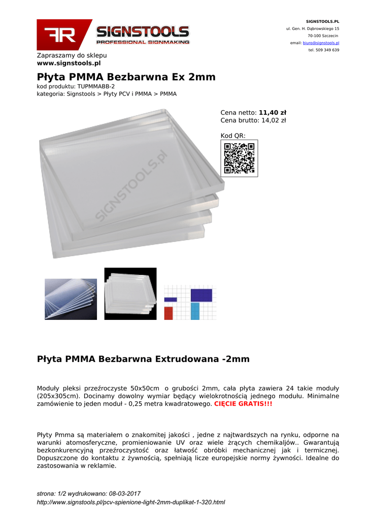 SIGNSTOOLS.PL ul. Gen. H. Dąbrowskiego 15 70-100 Szczecin email: [email protected] tel. 509 349 639 Zapraszamy do sklepu www.signstools.pl Płyta PMMA Bezbarwna Ex 2mm kod produktu: TUPMMABB-2 kategoria: Signstools > Płyty PCV i PMMA > PMMA Cena netto: 11,40 zł Cena brutto: 14,02 zł Kod QR: Płyta PMMA Bezbarwna Extrudowana -2mm Moduły pleksi przeźroczyste 50x50cm o grubości 2mm, cała płyta zawiera 24 takie moduły (205x305cm). Docinamy dowolny wymiar będący wielokrotnością jednego modułu. Minimalne zamówienie to jeden moduł - 0,25 metra kwadratowego. CIĘCIE GRATIS!!! Płyty Pmma są materiałem o znakomitej jakości , jedne z najtwardszych na rynku, odporne na warunki atomosferyczne, promieniowanie UV oraz wiele żrących chemikaljów.. Gwarantują bezkonkurencyjną przeźroczystość oraz łatwość obróbki mechanicznej jak i termicznej. Dopuszczone do kontaktu z żywnością, spełniają licze europejskie normy żywności. Idealne do zastosowania w reklamie. strona: 1/2 wydrukowano: 08-03-2017 http://www.signstools.pl/pcv-spienione-light-2mm-duplikat-1-320.html Zalety: Przeźroczystość. Wysoka odporność na warunki atmosferyczne, chemikalia. Dopuszczone do kontaktu z żywnością Idealny materiał do druku i aplikacji folii. Ekonomiczna obróbka płyt. Zastosowanie: Szyldy, plansze i tablice podświetlane. Różnego rodzaju wykończenia witryn sklepowych. Litery i znaki przestrzenne. Zabudowa stoisk, prezentacje. Stojaki i panele reklamowereklamowe. Obudowa maszyn i urządzeń. Sufity podwieszane. Zabudowa sklepów i lokali usługowych. strona: 2/2 wydrukowano: 08-03-2017 http://www.signstools.pl/pcv-spienione-light-2mm-duplikat-1-320.html