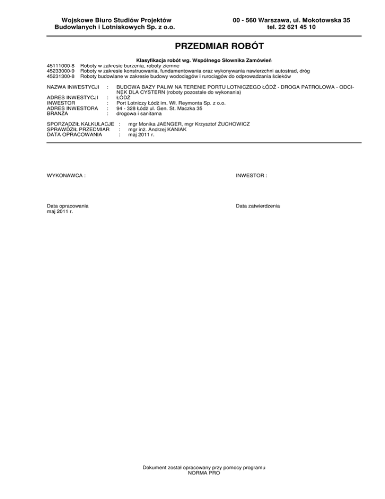 Wojskowe Biuro Studiów Projektów Budowlanych i Lotniskowych Sp. z o.o. 00 - 560 Warszawa, ul. Mokotowska 35 tel. 22 621 45 10 PRZEDMIAR ROBÓT 45111000-8 45233000-9 45231300-8 Klasyfikacja robót wg. Wspólnego Słownika Zamówień Roboty w zakresie burzenia, roboty ziemne Roboty w zakresie konstruowania, fundamentowania oraz wykonywania nawierzchni autostrad, dróg Roboty budowlane w zakresie budowy wodociągów i rurociągów do odprowadzania ścieków NAZWA INWESTYCJI : ADRES INWESTYCJI INWESTOR ADRES INWESTORA BRANŻA : : : : BUDOWA BAZY PALIW NA TERENIE PORTU LOTNICZEGO ŁÓDŻ - DROGA PATROLOWA - ODCINEK DLA CYSTERN (roboty pozostałe do wykonania) ŁÓDŹ Port Lotniczy Łódź im. Wł. Reymonta Sp. z o.o. 94 - 328 Łódź ul. Gen. St. Maczka 35 drogowa i sanitarna SPORZĄDZIŁ KALKULACJE : SPRAWDZIŁ PRZEDMIAR : DATA OPRACOWANIA : mgr Monika JAENGER, mgr Krzysztof ŻUCHOWICZ mgr inż. Andrzej KANIAK maj 2011 r. WYKONAWCA : INWESTOR : Data opracowania maj 2011 r. Data zatwierdzenia Dokument został opracowany przy pomocy programu NORMA PRO Droga patrolowa zamienny p Lp. 1 1.1 1.2 1.3 2 2.1 2.2 2.3 2.4 2.5 3 DZIAŁY KOSZTORYSU Nazwa działu ROBOTY ROZBIÓRKOWE I ZIEMNE ROZBIÓRKA ISTNIEJĄCEJ NAWIERZCHNI DROGOWEJ ROBOTY POMIAROWE, WYKOPY I NASYPY W KORYTACH I NA SKARPACH UKSZTAŁTOWANIE TERENU ROBOTY BUDOWLANE W ZAKRESIE WYKONYWANIA NAWIERZCHNI DRÓG ŁAWY i KRAWĘŻNIKI NAWIERZCHNIA ASFALTOBETONOWA DROGI PATROLOWEJ OZNAKOWANIE ORGANIZACJI RUCHU NAWIERZCHNIA BETONOWA - POŁĄCZENIE Z PPS-2 ROBOTY UZUPEŁNIAJĄCE UJĘCIE W KANAŁ KRYTY OTWARTEGO KANAŁU DESZCZOWEGO 2 Norma PRO Wersja 4.23 Licencja: 18496 dla KRZYSZTOF Od 1 1 6 17 23 23 27 35 36 45 47 Do 22 5 16 22 46 26 34 35 44 46 59 PRZEDMIAR Droga patrolowa zamienny p Lp. Nr spec. techn. Podstawa Opis i wyliczenia j.m. 1 45111000-8 1.1 1 STWiOR KNR 2-31 d.1. Roboty 0803-03 1 drogowe 0803-04 Rozdz. I ROBOTY ROZBIÓRKOWE I ZIEMNE ROZBIÓRKA ISTNIEJĄCEJ NAWIERZCHNI DROGOWEJ Mechaniczne rozebranie nawierzchni z mieszanek mineralno-bitumicznych o grubości 5 cm 2 STWiOR KNR 2-31 d.1. Roboty 0802-03 1 drogowe 0802-04 Rozdz. I Mechaniczne rozebranie podbudowy z gruntu stabilizowanego o gruboś- m2 ci 20 cm 3 STWiOR KNR 2-25 d.1. Roboty 0408-05 1 drogowe Rozdz. I Rozebranie nawierzchni z płyt żelbetowych pełnych o wym. 3,0 x 1,0 x 0, m2 25 m 4 STWiOR KNR 4-04 d.1. Roboty 1103-01 1 drogowe Rozdz. I Załadowanie gruzu z rozbiórek nawierzchni koparko-ładowarką przy ob- m3 słudze na zmianę roboczą przez 3 samochody samowyładowcze 5 STWiOR KNR 4-04 d.1. Roboty 1103-04 1 drogowe 1103-05 Rozdz. I Wywiezienie gruzu z terenu rozbiórki przy mechanicznym załadowaniu i m3 wyładowaniu samochodem samowyładowczym na odległość 20 km 1.2 6 STWiOR KNR 2-01 d.1. Roboty 0121-01 2 drogowe Rozdz. II ROBOTY POMIAROWE, WYKOPY I NASYPY W KORYTACH I NA SKARPACH Roboty pomiarowe przy powierzchniowych robotach ziemnych - niwela- ha cja terenu w rejonie poboczy i skarp 0.00 ha 7 STWiOR KNR 2-01 d.1. Roboty 0119-04 2 drogowe Rozdz. II Roboty pomiarowe przy liniowych robotach ziemnych - trasa drogi w terenie pagórkowatym km 1.343 km 8 STWiOR KNR 2-01 d.1. Roboty 0126-01 2 drogowe 0126-02 Rozdz. III Usunięcie warstwy ziemi urodzajnej (humusu) o grubości 30 cm za pomocą spycharek i przemieszczenie na odległość 40 m m2 56.00 m2 9 STWiOR KNR 2-01 d.1. Roboty 0211-03 2 drogowe Rozdz. III Roboty ziemne wyk.koparkami przedsiębiernymi 0,25 m3 w ziemi kat.I-II m3 (humus) uprzednio zmagazynowanej w hałdach z transportem urobku samochodami samowyładowczymi na odl.do 1 km - odwiezienie humusu na hałdę tymczasową, do późniejszego wykorzystania, oraz powtórne dowiezienie 1482.50 m3 0.00 m2 0.00 m2 0.00 m3 0.00 m3 10 STWiOR KNR 2-01 d.1. Roboty 0228-05 2 drogowe Rozdz. V, VI Wykopy (likwidacja skarpy) wykonywane spycharkami o mocy 74 kW (100 KM) w gruncie kat. III z przemieszczeniem na odległość 10 m m3 409.86 m3 11 STWiOR KNR 2-31 d.1. Roboty 0101-01 2 drogowe Rozdz. VIII Mechaniczne wykonanie koryta na całej szerokości jezdni wraz z pobo- m2 czami w gruncie kat. III głębokości 20 cm z profilowaniem i zagęszczaniem dna i poboczy - wykopy w gruncie mineralnym o kubaturze 1053 + 931 = 1984 m3 4798.044 m2 3 Norma PRO Wersja 4.23 Licencja: 18496 dla KRZYSZTOF Razem m2 m2 0.00 Poszcz 0.000 RAZEM 0.000 0.000 RAZEM 0.000 0.000 RAZEM 0.000 0.000 RAZEM 0.000 0.000 RAZEM 0.000 0.000 RAZEM 0.000 1.343 RAZEM 1.343 56.000 RAZEM 56.000 1482.500 RAZEM 1482.500 409.860 RAZEM 409.860 4798.044 RAZEM 4798.044 PRZEDMIAR Droga patrolowa zamienny p Lp. Nr Podstawa Opis i wyliczenia j.m. spec. techn. 12 STWiOR KNR 2-01 Roboty ziemne wyk.koparkami przedsiębiernymi 0.25 m3 w ziemi kat.III m3 d.1. Roboty 0211-03 (grunt mineralny) uprzednio zmagazynowanej w hałdach z transportem 2 drogowe urobku samochodami samowyładowczymi na odl.do 1 km - odwiezienie Rozdz. ziemi z wykopów na hałdę tymczasową, do późniejszego wykorzystania, V, VII oraz ponowne dowiezienie 82.00 m3 13 STWiOR KNR 2-01 d.1. Roboty 0201-05 2 drogowe 0214-04 Rozdz. V, VII Poszcz Razem 82.000 RAZEM 82.000 517.500 RAZEM 517.500 75.000 RAZEM 75.000 3798.000 RAZEM 3798.000 3798.000 RAZEM 3798.000 59.120 RAZEM 59.120 73.900 RAZEM 73.900 73.900 RAZEM 73.900 5930.000 RAZEM 5930.000 1500.000 RAZEM 1500.000 Roboty ziemne wykon.koparkami przedsiębiernymi o poj.łyżki 0.25 m3 w m3 gr.kat.III z transp.urobku samochod.samowyładowczymi na odległość 20 km - dowiezienie brakujacego gruntu do nasypów 517.50 m3 14 STWiOR KNR 2-01 Formowanie i zagęszczanie nasypów w korycie spycharkami w gruncie d.1. Roboty 0235-02 kat. III. Wskaźnik zagęszczenia Js = 1.00 2 drogowe z.sz. 2.5.2. Rozdz. 9907 VII 56.00+19.00 m3 m3 15 STWiOR KNR 2-01 d.1. Roboty 0235-05 2 drogowe z.sz. 2.5.2. Rozdz. 9907 VII, XIII Formowanie i zagęszczanie nasypu - skarpy o wys. ponad 3,0 m (w ma- m3 teracach i półmateracach grubości 60 cm) spycharkami w gruncie kat. III-IV wraz z plantowaniem powierzchni skarp. Wskaźnik zagęszcze