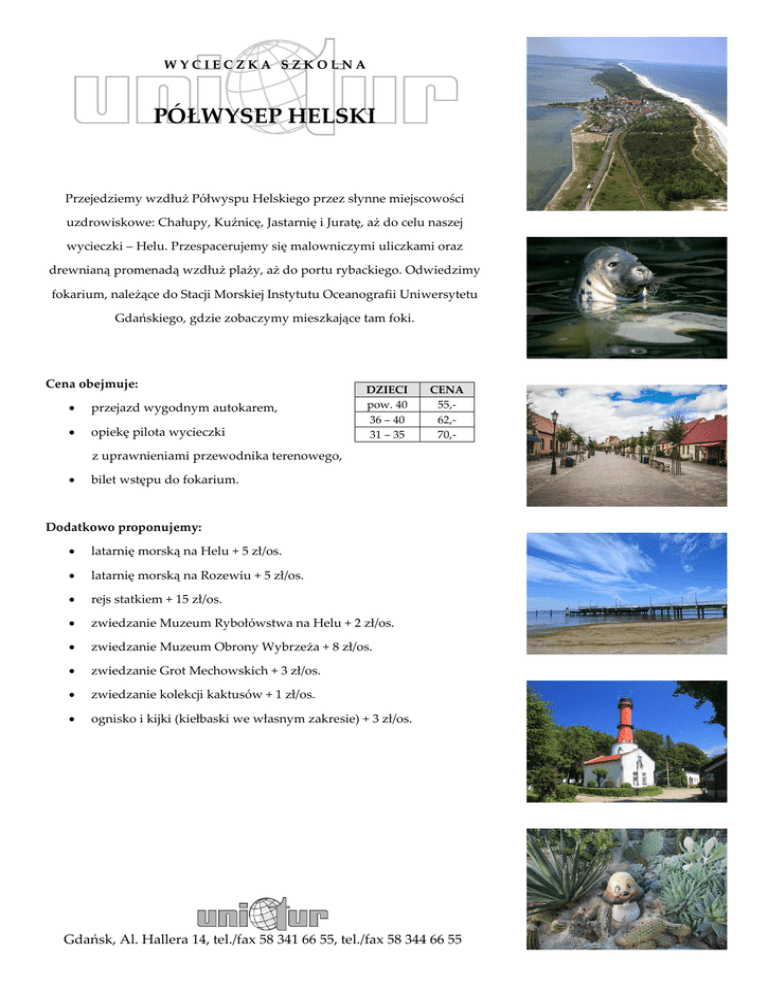 WYCIECZKA SZKOLNA PÓŁWYSEP HELSKI Przejedziemy wzdłuż Półwyspu Helskiego przez słynne miejscowości uzdrowiskowe: Chałupy, Kuźnicę, Jastarnię i Juratę, aż do celu naszej wycieczki – Helu. Przespacerujemy się malowniczymi uliczkami oraz drewnianą promenadą wzdłuż plaży, aż do portu rybackiego. Odwiedzimy fokarium, należące do Stacji Morskiej Instytutu Oceanografii Uniwersytetu Gdańskiego, gdzie zobaczymy mieszkające tam foki. Cena obejmuje: przejazd wygodnym autokarem, opiekę pilota wycieczki DZIECI pow. 40 36 – 40 31 – 35 CENA 55,62,70,- z uprawnieniami przewodnika terenowego, bilet wstępu do fokarium. Dodatkowo proponujemy: latarnię morską na Helu + 5 zł/os. latarnię morską na Rozewiu + 5 zł/os. rejs statkiem + 15 zł/os. zwiedzanie Muzeum Rybołówstwa na Helu + 2 zł/os. zwiedzanie Muzeum Obrony Wybrzeża + 8 zł/os. zwiedzanie Grot Mechowskich + 3 zł/os. zwiedzanie kolekcji kaktusów + 1 zł/os. ognisko i kijki (kiełbaski we własnym zakresie) + 3 zł/os. Gdańsk, Al. Hallera 14, tel./fax 58 341 66 55, tel./fax 58 344 66 55