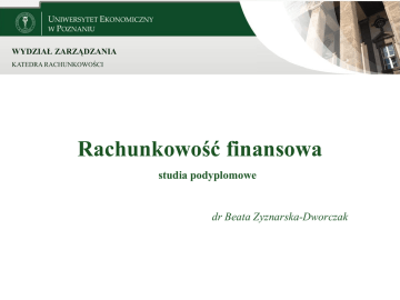 WYDZIAŁ ZARZĄDZANIA KATEDRA RACHUNKOWOŚCI Rachunkowość finansowa studia podyplomowe dr Beata Zyznarska-Dworczak Program zajęć I. Zakres tematyczny zajęć 1. Produkty gotowe - definicja, - wycena 2. Przychody i koszty ich uzyskania Produkty pracy Produkty gotowe => zaliczane są do rzeczowych aktywów obrotowych (art. 3. ust 1 pkt 19 UoR), => obejmują wyroby i usługi (art. 3. ust 1 pkt 19 UoR), => wyceniane według kosztu wytworzenia: A. rzeczywistego lub B. planowanego, tzw. ceny ewidencyjnej => koszt wytworzenia obejmuje (art. 28 ust. 3 i 4 UoR): - koszty pozostające w bezpośrednim związku z danym produktem oraz - uzasadnioną część kosztów pośrednio związanych z wytworzeniem tego produktu. [Koszt wytw. WG = koszty bezpośrednie + uz. część kosztów pośrednich] Produkty pracy [Koszt wytw. WG = koszty bezpośrednie + uz. cz. kosztów pośrednich] => I. Koszty bezpośrednie obejmują (art. 28 ust. 3 UoR): - wartość zużytych materiałów bezpośrednich, - koszty pozyskania i przetworzenia związane bezpośrednio z produkcją i - inne koszty poniesione w związku z doprowadzeniem produktu do postaci i miejsca, w jakich się znajduje w dniu wyceny. Produkty pracy [Koszt wytw. WG = koszty bezpośrednie + uz. cz. kosztów pośrednich] => II. Do uzasadnionej, odpowiedniej do okresu wytwarzania produktu, części kosztów pośrednich zalicza się (art. 28 ust. 3 UoR): - zmienne pośrednie koszty produkcji oraz - tę część stałych, pośrednich kosztów produkcji, które odpowiadają poziomowi tych kosztów przy normalnym wykorzystaniu zdolności produkcyjnych. Za normalny poziom wykorzystania zdolności produkcyjnych uznaje się przeciętną, zgodną z oczekiwaniami w typowych warunkach, wielkość produkcji za daną liczbę okresów lub sezonów, przy uwzględnieniu planowych remontów. Produkty pracy [Koszt wytw. WG = koszty bezpośrednie + uz. cz. kosztów pośrednich] => Obowiązek wyznaczania uzasadnionej części kosztów pośrednich W przypadku gdy roczne sprawozdanie finansowe jednostki nie podlega obowiązkowi badania i ogłaszania w myśl art. 64 ust. 1 to obliczając koszt wytworzenia produktu zgodnie z ust. 3, jednostka może do kosztów bezpośrednich doliczyć koszty pośrednie związane z wytworzeniem tego produktu, niezależnie od poziomu wykorzystania zdolności produkcyjnych. Ustalony w ten sposób koszt wytworzenia nie może być wyższy od ceny sprzedaży netto. (art. 28 ust. 4a UoR) Produkty pracy Do kosztów wytworzenia produktu nie zalicza się kosztów (art. 28 ust. 3 UoR): 1) będących konsekwencją niewykorzystanych zdolności produkcyjnych i strat produkcyjnych; 2) ogólnego zarządu, które nie są związane z doprowadzaniem produktu do postaci i miejsca, w jakich się znajduje na dzień wyceny; 3) magazynowania wyrobów gotowych i półproduktów, chyba że poniesienie tych kosztów jest niezbędne w procesie produkcji; 4) kosztów sprzedaży produktów. Koszty te wpływają na wynik finansowy sprawozdawczego, w którym zostały poniesione. okresu Produkty pracy Do kosztów wytworzenia produktu można zaliczyć : w przypadkach uzasadnionych niezbędnym, długotrwałym przygotowaniem produktu do sprzedaży bądź długim okresem wytwarzania produktu, koszty obsługi zobowiązań zaciągniętych w celu finansowania zapasu produktów w okresie ich przygotowania do sprzedaży bądź wytworzenia i związanych z nimi różnic kursowych, pomniejszone o przychody z tego tytułu. (art. 28 ust. 4 UoR) Produkty pracy Wycena – art. 28 ust. 3 UoR Jeżeli nie jest możliwe ustalenie kosztu wytworzenia produktu, jego wyceny dokonuje się według ceny sprzedaży netto takiego samego lub podobnego produktu, pomniejszonej o przeciętnie osiągany przy sprzedaży produktów zysk brutto ze sprzedaży, a w przypadku produktu w toku – także z uwzględnieniem stopnia jego przetworzenia. Produkty pracy Wycena przyjęcia produktów na magazyn i ich rozchodu: A) Koszt rzeczywisty - przyjęcie według rzeczywistego kosztu wytworzenia - wycena rozchodu według metody LIFO, FIFO, ceny przeciętnej lub szczegółowej identyfikacji sprzedanych wyrobów gotowych, B) Koszt planowany => UoR Produkty pracy B) Wycena w koszcie planowanym – w cenach ewidencyjnych art. 34 ust. 2 UoR Składniki rzeczowych aktywów obrotowych mogą być na dzień nabycia lub wytworzenia ujmowane w księgach rachunkowych w cenach przyjętych do ewidencji, z uwzględnieniem różnic między tymi cenami a rzeczywistymi cenami ich nabycia albo zakupu, albo kosztami wytworzenia. Na dzień bilansowy wartość składników rzeczowych aktywów obrotowych, wyrażoną w cenach ewidencyjnych, doprowadza się do poziomu rzeczywistego. Stosowane do wyceny na dzień bilansowy ceny nabycia albo zakupu, albo planowane koszty wytworzenia nie mogą być wyższe od cen sprzedaży netto tych składników. Produkty pracy Wycena rozchodu produktów : A) Koszt rzeczywisty - wycena rozchodu według metody LIFO, FIFO, ceny przeciętnej lub szczegółowej identyfikacji sprzedanych wyrobów gotowych, B) Koszt planowany - rozchód według planowanego kosztu wytworzenia, tzw. ceny ewidencyjnej: - ewidencja i rozliczanie odchyleń od cen ewidencyjnych wyrobów gotowych => rozliczanie podobnie jak przy OCE materiałów => Ewidencja i wycena produktów gotowych - OCE OCE produktów gotowych podlegają rozliczeniu proporcjonalnie do wartości zapasu i rozchodu. Rozliczenie to polega na: a) obliczeniu wskaźnika narzutu OCE według wzoru: WNo O p Ob Z p Zb 100 gdzie: WNo - wskaźnik narzutu odchyleń od stałych cen ewidencyjnych Op - odchylenia przypadające na zapas początkowy Ob - odchylenia powstałe w bieżącym okresie Zp - wartość zapasu początkowego Zb - wartość przychodów produktów w bieżącym okresie pomniejszona o zwroty Ewidencja i wycena produktów - OCE Rozliczenie OCE produktów polega na: (cd) b) obliczeniu kwoty narzutu odchyleń przypadającej na: - Rozchód według wzoru Rb WNo NO 100% gdzie: