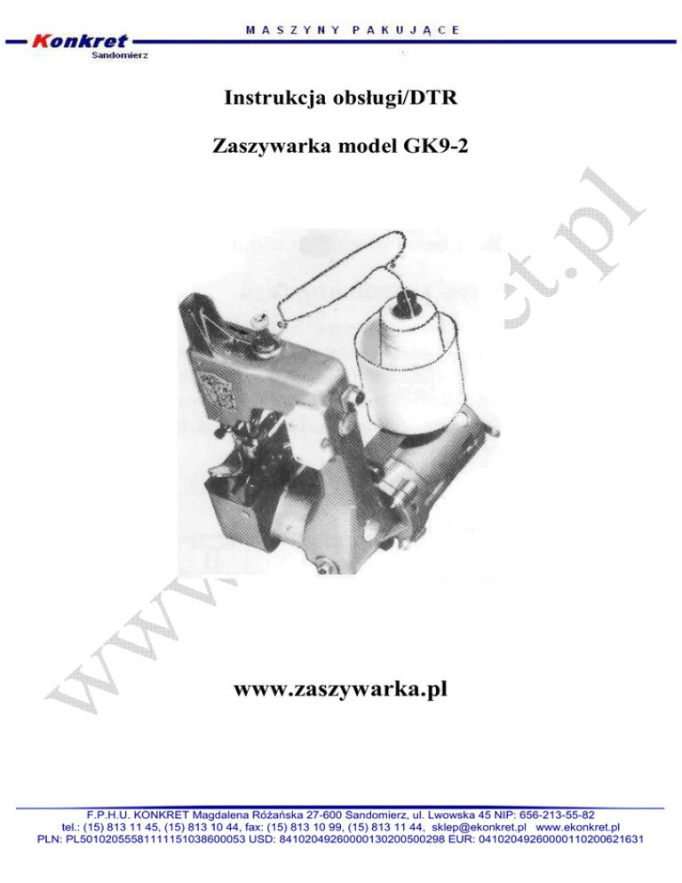Instrukcja obsługi/DTR Zaszywarka model GK9-2 www.zaszywarka.pl F.P.H.U. KONKRET Magdalena RóŜańska 27-600 Sandomierz, ul. Lwowska 45 NIP: 656-213-55-82 tel.: (15) 813 11 45, (15) 813 10 44, fax: (15) 813 10 99, (15) 813 11 44, [email protected] www.ekonkret.pl PLN: PL50102055581111151038600053 USD: 84102049260000130200500298 EUR: 04102049260000110200621631 I. Specyfikacje Dane techniczne: 1. 2. 3. 4. 5. 6. 7. 8. 9. 10. 11. Ścieg Długość ściegu(stała w mm) Prędkość obr. Silnika Prędkość szycia Igły Nici (winylowe, syntetyczne lub bawełniane) Materiał do zaszywania Silnik Moc Waga Netto Wymiary jedno-igłowy łańcuszkowy 8 8000 Obr/min 800 uderzeń na minutę 250 20/6 juta, tkanina, bawełna,papier, folia.. 90W 230V, A.C. 4,5kg. 268x160x330 II. Przed przystąpieniem do uŜywania maszyny 1. Zakładanie igieł (Rys. 2) Przekręcić kołem zamachowym(D11) do momentu aŜ igielnica znajdzie się w swoim skrajnym górnym połoŜeniu. Następnie poluzować śrubę dociskającą igłę(S4) i wsadzić igłę, upewniając się, Ŝe wklęsła strona igły zwrócona jest w stronę chwytacza( ku środkowi płyty igłowej,R6). NaleŜy upewnić się Ŝe igła jest mocno dokręcona, gdyŜ w przeciwnym wypadku wypadnie i się złamię. F.P.H.U. KONKRET Magdalena RóŜańska 27-600 Sandomierz, ul. Lwowska 45 NIP: 656-213-55-82 tel.: (15) 813 11 45, (15) 813 10 44, fax: (15) 813 10 99, (15) 813 11 44, [email protected] www.ekonkret.pl PLN: PL50102055581111151038600053 USD: 84102049260000130200500298 EUR: 04102049260000110200621631 2. Nawlekanie nici (Rys. 3) Dla poprawnego szycia konieczne jest dobre nawleczenie igły. W tym celu urządzenie dostarczane jest juŜ nawleczone, aby uŜytkownik mógł zobaczyć w rzeczywistości jak ten proces przeprowadzić poprawnie. W razie wątpliwości naleŜy przewlekać w kolejności niŜej wymienionych punktów: A. B. C. D. E. F. G. Oczko nici Oczko nici NapręŜacz Oczko nici Górna, szarpiąca część igielnicy Igła Po nawleczeniu igły naleŜy przeprowadzić nić przez środek stopki. III. Uruchamianie urządzenia Przed uruchomieniem naleŜy upewnić się, Ŝe natęŜenie prądu w gniazdku jest takie samo, jak w maszynie. Weź maszynę w prawą rękę i ułóŜ kciuk na przycisku startowym przycisku. Następnie przytrzymaj worek w swojej lewej ręce delikatnie i podłóŜ górną część worka pomiędzy ząbki transportu i stopę. Uruchom maszynę starając się trzymać worek prosto. Nigdy nie popychaj ani nie ciągnij worka. Po zatrzymaniu maszyny przetnij niepotrzebny ścieg (przed przecięciem ściegu naleŜy przeszyć go na ok. 3cm. poza workiem, by móc swobodnie przeciąć oraz by ścieg się nie rozwinął). WAśNE! Przed szyciem worków naleŜy przeszyć pusty worek lub inny materiał, aby upewnić się Ŝe maszyna jest sprawna i Ŝe umiejętnie się ją uruchomiło. IV. Dostosowania WAśNE! Jeśli potrzebna jest regulacja lub z sieci. To podstawowy wymóg bezpieczeństwa dla obsługującego. wymiana części zawsze odłączaj maszynę 1. NapręŜenie nici NapręŜenie nici reguluje się przez dokręcanie nakrętki (rys. 3, C) . Kręcąc zgodnie z ruchem wskazówek zegara napręŜenie nici się zwiększa, przeciwnie kręcąc poluzowujemy napręŜenie nici. F.P.H.U. KONKRET Magdalena RóŜańska 27-600 Sandomierz, ul. Lwowska 45 NIP: 656-213-55-82 tel.: (15) 813 11 45, (15) 813 10 44, fax: (15) 813 10 99, (15) 813 11 44, [email protected] www.ekonkret.pl PLN: PL50102055581111151038600053 USD: 84102049260000130200500298 EUR: 04102049260000110200621631 2 Pozycjonowanie igieł i chwytaczy (rys. 4) Chwytacz w prawidłowym połoŜeniu porusza się w odległości 0,1 mm od igły. Regulacja oraz czyszczenie mogą być dokonywane po poluzowaniu śrubki chwytacza. 3 Regulowanie ząbków transportu (rys. 5) W momencie instalowania nowych ząbków (R29) transportu naleŜy upewnić się, Ŝe są one wypozycjonowane odpowiednio do płytki ściegowej (R6/7) i doregulować róŜnicę śrubą (4-3)delikatnie dokręcając. NaleŜy sprawdzić takŜe, by ząbki wystawały na 2,8mm nad płytkę ściegową w momencie najwyŜszego ich ruchu i doregulować ewentualną róŜnicę za pomocą śrubki (4-3) 4 Czyszczenie i smarowanie (rys. 6) Urządzenie naleŜy regularnie czyścic i smarować. Częstotliwość tych czynności powinna być zaleŜna od tego jak często urządzenie jest uŜywane, oraz w jakich warunkach pracuję tj. pylistych, suchych, o duŜej wilgotności powietrza i odwrotnie itp. Smarowanie Maszny polega na: Zdjęciu pokrywy mechanizmu chwytacza(1), wyczyszczeniu wszystkich pruszyn i innych zanieczyszczeń i nasmarowaniu wszystkich elementów pracujących w tulejach olejem wazelinowym bądź innym smarem penetrującym, pozostałych zaś smarem stałym. Następnie naleŜy zdjąć pokrywę igielnicy(2) i nasmarować olejem wazelinowym bądź innym penetrującym igielnice (a) na całej długości, oraz zakonserwować znajdująca się obok spręŜynę i mechanizm docisku stopki. Na koniec naleŜy zdjąć (podwaŜając śrubokrętem) znajdujące się na rączce otwory rewizyjne i równieŜ nasmarować znajdujące się w niej mechanizmy olejem wazelinowym bądź innym penetrującym. F.P.H.U. KONKRET Magdalena RóŜańska 27-600 Sandomierz, ul. Lwowska 45 NIP: 656-213-55-82 tel.: (15) 813 11 45, (15) 813 10 44, fax: (15) 813 10 99, (15) 813 11 44, [email protected] www.ekonkret.pl PLN: PL50102055581111151038600053 USD: 84102049260000130200500298 EUR: 04102049260000110200621631 * Zaleca się, aŜeby poza regularnym czyszczeniem i smarowaniem, wszystkie inne czynności regulacyjne, były wykonywane przez profesjonalny serwis sprzedawcy sprzętu. Wykonywanie wyŜej wymienionych czynności przez osoby nie posiadające w tym zakresie specjalistycznego przeszkolenia moŜe doprowadzić do uszkodzenia urządzenia, a co za tym idzie utraty gwarancji. V. Informacje pozostałe INFORMACJE O PRZECHOWYWANIU MASZYNY * Aby dbać o maszynę naleŜy zawsze przechowywa