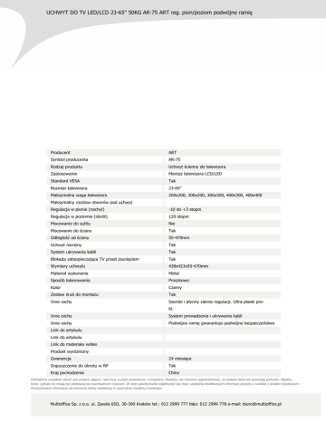 UCHWYT DO TV LED/LCD 23-65" 50KG AR-75 ART reg. pion/poziom podwójne ramię Producent ART Symbol producenta AR-75 Rodzaj produktu Uchwyt ścienny do telewizora Zastosowanie Montaż telewizora LCD/LED Standard VESA Tak Rozmiar telewizora 23-65" Maksymalna waga telewizora 200x200, 300x200, 300x300, 400x300, 400x400 Maksymalny rozstaw otworów pod uchwyt Regulacja w pionie (nachył) -10 do +3 stopni Regulacja w poziomie (obrót) 120 stopni Mocowanie do sufitu Nie Mocowanie do ściany Tak Odległość od ściany 55-470mm Uchwyt narożny Tak System ukrywania kabli Tak Blokada zabezpieczająca TV przed zsunięciem Tak Wymiary uchwytu 438x423x55-470mm Materiał wykonania Metal Sposób lakierowania Proszkowo Kolor Czarny Zestaw śrub do montażu Tak Inne cechy Szeroki i płynny zakres regulacji. Ultra płaski profil. Inne cechy System prowadzenia i ukrywania kabli Inne cechy Podwójne ramię gwarantuje podwójne bezpieczeństwo Link do artykułu Link do artykułu Link do materiału wideo Produkt wyróżniony Gwarancja 24 miesiące Dopuszczenie do obrotu w RP Tak Kraj pochodzenia Chiny Dokładamy wszelkich starań aby podane zdjęcie i opis były w pełni prawidłowe i kompletne. Niestety, nie możemy zagwarantować, że podane dane nie zawierają pomyłek i błędów, które jednak nie mogą być podstawą do ewentualnych roszczeń. W razie jakichkolwiek wątpliwości lub chęci uzyskania dodatkowych informacji prosimy o kontakt z działem handlowym. Prezentowane informacje nie stanowią oferty handlowej w rozumieniu Kodeksu Cywilnego. Multioffice Sp. z o.o. ul. Zawiła 65D, 30-390 Kraków tel.: 012 2999 777 faks: 012 2999 778 e-mail: [email protected]