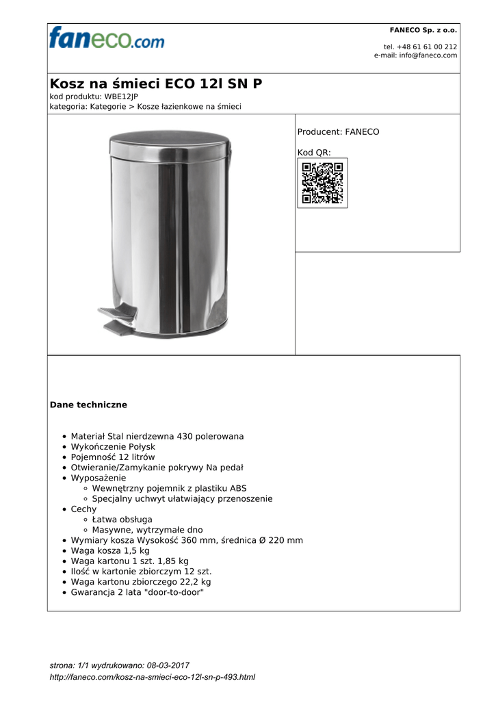 FANECO Sp. z o.o. tel. +48 61 61 00 212 e-mail: [email protected] Kosz na śmieci ECO 12l SN P kod produktu: WBE12JP kategoria: Kategorie > Kosze łazienkowe na śmieci Producent: FANECO Kod QR: Dane techniczne Materiał Stal nierdzewna 430 polerowana Wykończenie Połysk Pojemność 12 litrów Otwieranie/Zamykanie pokrywy Na pedał Wyposażenie Wewnętrzny pojemnik z plastiku ABS Specjalny uchwyt ułatwiający przenoszenie Cechy Łatwa obsługa Masywne, wytrzymałe dno Wymiary kosza Wysokość 360 mm, średnica Ø 220 mm Waga kosza 1,5 kg Waga kartonu 1 szt. 1,85 kg Ilość w kartonie zbiorczym 12 szt. Waga kartonu zbiorczego 22,2 kg Gwarancja 2 lata "door-to-door" strona: 1/1 wydrukowano: 08-03-2017 http://faneco.com/kosz-na-smieci-eco-12l-sn-p-493.html