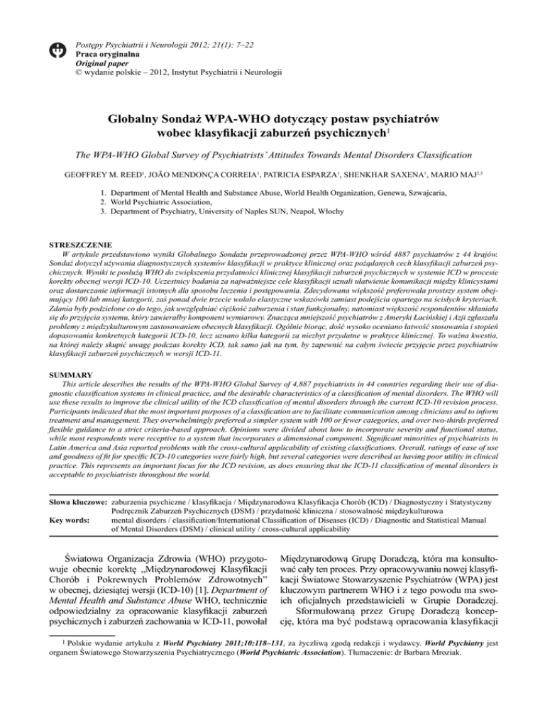Postępy Psychiatrii i Neurologii 2012; 21(1): 7–22 Praca oryginalna Original paper © wydanie polskie – 2012, Instytut Psychiatrii i Neurologii Globalny Sondaż WPA-WHO dotyczący postaw psychiatrów wobec klasyfikacji zaburzeń psychicznych1 The WPA-WHO Global Survey of Psychiatrists’ Attitudes Towards Mental Disorders Classification GEOFFREY M. REED1, JOĀO MENDONÇA CORREIA1, PATRICIA ESPARZA1, SHENKHAR SAXENA1, MARIO MAJ2,3 1. Department of Mental Health and Substance Abuse, World Health Organization, Genewa, Szwajcaria, 2. World Psychiatric Association, 3. Department of Psychiatry, University of Naples SUN, Neapol, Włochy STRESZCZENIE W artykule przedstawiono wyniki Globalnego Sondażu przeprowadzonej przez WPA-WHO wśród 4887 psychiatrów z 44 krajów. Sondaż dotyczył używania diagnostycznych systemów klasyfikacji w praktyce klinicznej oraz pożądanych cech klasyfikacji zaburzeń psychicznych. Wyniki te posłużą WHO do zwiększenia przydatności klinicznej klasyfikacji zaburzeń psychicznych w systemie ICD w procesie korekty obecnej wersji ICD-10. Uczestnicy badania za najważniejsze cele klasyfikacji uznali ułatwienie komunikacji między klinicystami oraz dostarczanie informacji istotnych dla sposobu leczenia i postępowania. Zdecydowana większość preferowała prostszy system obejmujący 100 lub mniej kategorii, zaś ponad dwie trzecie wolało elastyczne wskazówki zamiast podejścia opartego na ścisłych kryteriach. Zdania były podzielone co do tego, jak uwzględniać ciężkość zaburzenia i stan funkcjonalny, natomiast większość respondentów skłaniała się do przyjęcia systemu, który zawierałby komponent wymiarowy. Znacząca mniejszość psychiatrów z Ameryki Łacińskiej i Azji zgłaszała problemy z międzykulturowym zastosowaniem obecnych klasyfikacji. Ogólnie biorąc, dość wysoko oceniano łatwość stosowania i stopień dopasowania konkretnych kategorii ICD-10, lecz uznano kilka kategorii za niezbyt przydatne w praktyce klinicznej. To ważna kwestia, na której należy skupić uwagę podczas korekty ICD, tak samo jak na tym, by zapewnić na całym świecie przyjęcie przez psychiatrów klasyfikacji zaburzeń psychicznych w wersji ICD-11. SUMMARY This article describes the results of the WPA-WHO Global Survey of 4,887 psychiatrists in 44 countries regarding their use of diagnostic classification systems in clinical practice, and the desirable characteristics of a classification of mental disorders. The WHO will use these results to improve the clinical utility of the ICD classification of mental disorders through the current ICD-10 revision process. Participants indicated that the most important purposes of a classification are to facilitate communication among clinicians and to inform treatment and management. They overwhelmingly preferred a simpler system with 100 or fewer categories, and over two-thirds preferred flexible guidance to a strict criteria-based approach. Opinions were divided about how to incorporate severity and functional status, while most respondents were receptive to a system that incorporates a dimensional component. Significant minorities of psychiatrists in Latin America and Asia reported problems with the cross-cultural applicability of existing classifications. Overall, ratings of ease of use and goodness of fit for specific ICD-10 categories were fairly high, but several categories were described as having poor utility in clinical practice. This represents an important focus for the ICD revision, as does ensuring that the ICD-11 classification of mental disorders is acceptable to psychiatrists throughout the world. Słowa kluczowe: zaburzenia psychiczne / klasyfikacja / Międzynarodowa Klasyfikacja Chorób (ICD) / Diagnostyczny i Statystyczny Podręcznik Zaburzeń Psychicznych (DSM) / przydatność kliniczna / stosowalność międzykulturowa Key words: mental disorders / classification/International Classification of Diseases (ICD) / Diagnostic and Statistical Manual of Mental Disorders (DSM) / clinical utility / cross-cultural applicability Światowa Organizacja Zdrowia (WHO) przygotowuje obecnie korektę „Międzynarodowej Klasyfikacji Chorób i Pokrewnych Problemów Zdrowotnych” w obecnej, dziesiątej wersji (ICD-10) [1]. Department of Mental Health and Substance Abuse WHO, technicznie odpowiedzialny za opracowanie klasyfikacji zaburzeń psychicznych i zaburzeń zachowania w ICD-11, powołał Międzynarodową Grupę Doradczą, która ma konsultować cały ten proces. Przy opracowywaniu nowej klasyfikacji Światowe Stowarzyszenie Psychiatrów (WPA) jest kluczowym partnerem WHO i z tego powodu ma swoich oficjalnych przedstawicieli w Grupie Doradczej. Sformułowaną przez Grupę Doradczą koncepcję, która ma być podstawą opracowania klasyfikacji 1 Polskie wydanie artykułu z World Psychiatry 2011;10:118‒131, za życzliwą zgodą redakcji i wydawcy. World Psychiatry jest organem Światowego Stowarzyszenia Psychiatrycznego (World Psychiatric Association). Tłumaczenie: dr Barbara Mroziak. 8 Geoffrey M. Reed, Joāo Mendonça Correia, Patricia Esparza, Shenkhar Saxena, Mario Maj zaburzeń psychicznych i zaburzeń zachowania w ICD-11, przedstawiono w innym artykule tego numeru World Psychiatry [2], gdzie za najważniejszy cel trwającego obecnie procesu korekty uznano zwiększenie użyteczności klinicznej klasyfikacji. Zagadnienie to omówiono bardziej szczegółowo w innej publikacji [3]. WHO podkreśla również międzynarodowy i wielojęzyczny charakter prac nad nową wersją, a także zamiar przeprowadzenia poważnych badań nad międzykulturowym stosowaniem kategorii, definicji i opisów diagnostycznych. Jeśli poprawa globalnej przydatności klinicznej i możliwości stosowanie międzykulturowego stanowi ważny cel korekty, to niewątpliwie bardzo istotne jest uzyskanie informacji od profesjonalistów, którzy w różnych krajach codziennie mają kontakt z osobami wymagającymi leczenia z powodu zabur