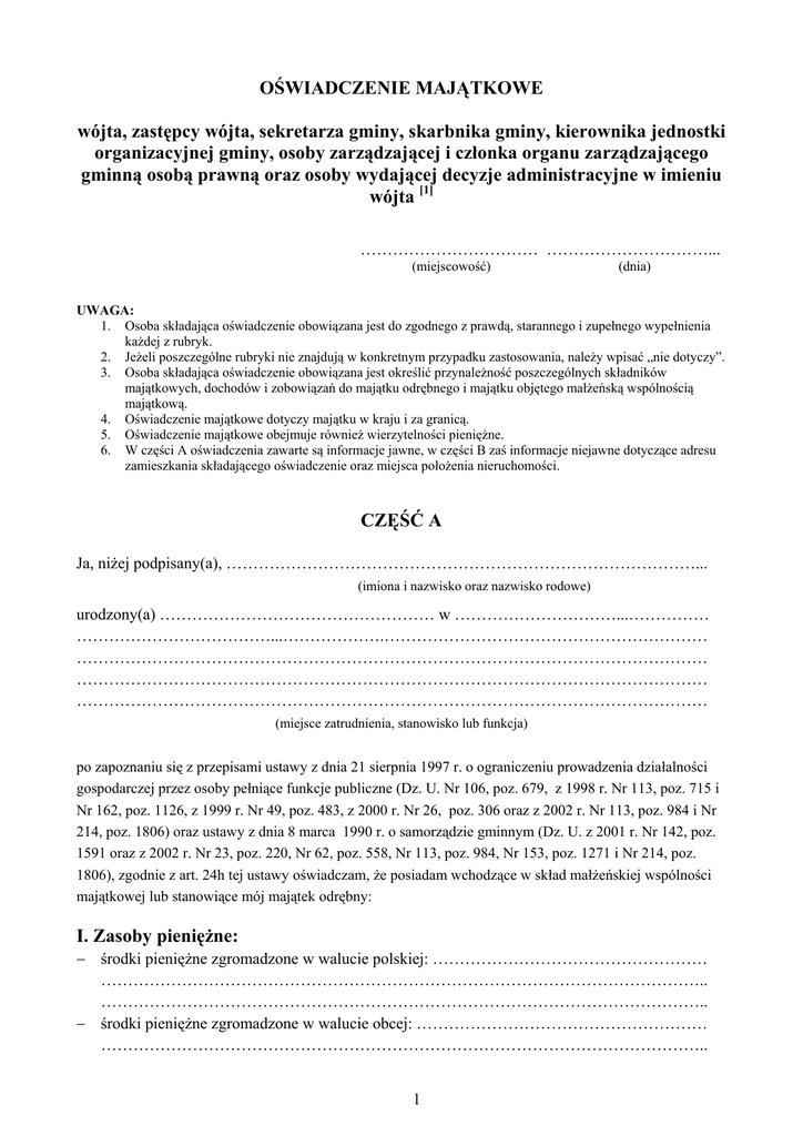 OŚWIADCZENIE MAJĄTKOWE wójta, zastępcy wójta, sekretarza gminy, skarbnika gminy, kierownika jednostki organizacyjnej gminy, osoby zarządzającej i członka organu zarządzającego gminną osobą prawną oraz osoby wydającej decyzje administracyjne w imieniu wójta [1] …………………………… …………………………... (miejscowość) (dnia) UWAGA: 1. Osoba składająca oświadczenie obowiązana jest do zgodnego z prawdą, starannego i zupełnego wypełnienia każdej z rubryk. 2. Jeżeli poszczególne rubryki nie znajdują w konkretnym przypadku zastosowania, należy wpisać „nie dotyczy”. 3. Osoba składająca oświadczenie obowiązana jest określić przynależność poszczególnych składników majątkowych, dochodów i zobowiązań do majątku odrębnego i majątku objętego małżeńską wspólnością majątkową. 4. Oświadczenie majątkowe dotyczy majątku w kraju i za granicą. 5. Oświadczenie majątkowe obejmuje również wierzytelności pieniężne. 6. W części A oświadczenia zawarte są informacje jawne, w części B zaś informacje niejawne dotyczące adresu zamieszkania składającego oświadczenie oraz miejsca położenia nieruchomości. CZĘŚĆ A Ja, niżej podpisany(a), ……………………………………………………………………………... (imiona i nazwisko oraz nazwisko rodowe) urodzony(a) …………………………………………… w …………………………...…………… ………………………………...……………….…………………………………………………… ……………………………………………………………………………………………………… ……………………………………………………………………………………………………… ……………………………………………………………………………………………………… (miejsce zatrudnienia, stanowisko lub funkcja) po zapoznaniu się z przepisami ustawy z dnia 21 sierpnia 1997 r. o ograniczeniu prowadzenia działalności gospodarczej przez osoby pełniące funkcje publiczne (Dz. U. Nr 106, poz. 679, z 1998 r. Nr 113, poz. 715 i Nr 162, poz. 1126, z 1999 r. Nr 49, poz. 483, z 2000 r. Nr 26, poz. 306 oraz z 2002 r. Nr 113, poz. 984 i Nr 214, poz. 1806) oraz ustawy z dnia 8 marca 1990 r. o samorządzie gminnym (Dz. U. z 2001 r. Nr 142, poz. 1591 oraz z 2002 r. Nr 23, poz. 220, Nr 62, poz. 558, Nr 113, poz. 984, Nr 153, poz. 1271 i Nr 214, poz. 1806), zgodnie z art. 24h tej ustawy oświadczam, że posiadam wchodzące w skład małżeńskiej wspólności majątkowej lub stanowiące mój majątek odrębny: I. Zasoby pieniężne: − środki pieniężne zgromadzone w walucie polskiej: …………………………………………… ………………………………………………………………………………………………….. ………………………………………………………………………………………………….. − środki pieniężne zgromadzone w walucie obcej: ……………………………………………… ………………………………………………………………………………………………….. 1 ………………………………………………………………………………………………….. − papiery wartościowe: ………………………………………………………………………...… ………………………………………………………………………………………………….. ………………………………………………………………………………………………….. ………………………………………………………………………………………………….. ……………………………………………….. na kwotę: …………………………………….. II. 1. Dom o powierzchni: ……………... m2, o wartości: ……………... tytuł prawny: …………… 2. Mieszkanie o powierzchni: …………. m2, o wartości: ……………... tytuł prawny: ………… 3. Gospodarstwo rolne: rodzaj gospodarstwa: ……………………, powierzchnia: …………….. o wartości: ………………………………… rodzaj zabudowy: ………………………………. tytuł prawny: …………………………………………………………………………………… Z tego tytułu osiągnąłem(ęłam) w roku ubiegłym przychód i dochód w wysokości: …………. 4. Inne nieruchomości: powierzchnia:……………………………………………………………. o wartości: ……………………………………………………………………………………... tytuł prawny: …………………………………………………………………………………… III. Posiadam udziały w spółkach handlowych - należy podać liczbę i emitenta udziałów: ………….. ……………………………………………………………………………………………………… ……………………………………………………………………………………………………… ……………………………………………………………………………………………………… udziały te stanowią pakiet większy niż 10% udziałów w spółce: …………………………………. ……………………………………………………………………………………………………… Z tego tytułu osiągnąłem(ęłam) w roku ubiegłym dochód w wysokości: …………………………. ……………………………………………………………………………………………………… ……………………………………………………………………………………………………… IV. Posiadam akcj