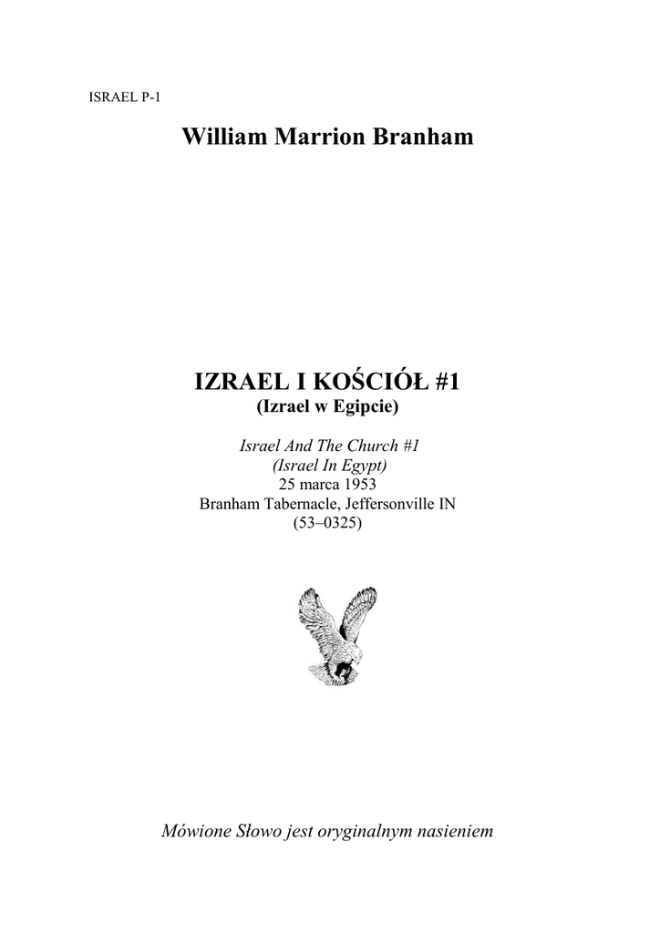 ISRAEL P-1 William Marrion Branham IZRAEL I KOŚCIÓŁ #1 (Izrael w Egipcie) Israel And The Church #1 (Israel In Egypt) 25 marca 1953 Branham Tabernacle, Jeffersonville IN (53–0325) Mówione Słowo jest oryginalnym nasieniem Zdjęcie Williama Branhama ze Słupem Ognia (wykonane przez Jamesa Ayersa w Sam Houston Collisseum w Houston w stanie Teksas w dniu 25 stycznia 1950 r.) Izrael i Kościół #1 (Izrael w Egipcie) Israel And The Church #1 (Israel In Egypt) środa wieczór, 25 marca 1953 Branham Tabernacle, Jeffersonville IN Nagranie na taśmie magnetofonowej o numerze 53-0325 trwa 1 godzinę i 47 minut. Numeracja akapitów według VGR 53-0325 Software Version IZRAEL I KOŚCIÓŁ #1 (IZRAEL W EGIPCIE) Stara, miła Świątynia… Wiele razy byłem tu przez godzinę albo dwie, czy jakoś tak, w czasie jakiejś usługi. Teraz jestem tu pierwszy raz od powrotu, w ogóle gdziekolwiek, starając się podtrzymać przebudzenie. Dzisiejszego wieczora rozpoczynamy. Przebudzenie, moim zdaniem, nie polega na pozyskiwaniu nowych członków. Przebudzenie nie polega na pozyskaniu grupy nawróconych, chociaż w trakcie przebudzenia i te sprawy mają miejsce. Ale przebudzenie jest ożywieniem tych, którzy już są, powoduje ono ich ożywienie. 2 A więc ja… my mamy tutaj cudownego pastora, brata Neville, który siedzi tu z przodu na krześle, dzisiaj z lekką chrypką, od zimna. I dzisiaj chciałbym urządzić to tak po domowemu. Kiedyś, kiedy byłem tu, to byłem tu pastorem, prowadzącym pieśni, zbierałem ofiary, płaciłem długi, byłem odźwiernym, cieślą, wybierałem popiół z pieca, i robiłem wszystko, co było do zrobienia. Wtedy jeszcze pracowałem w Public Service Company na boku. Siedemnaście lat to trwało – byłem tutaj. I jestem bardzo szczęśliwy, że mamy dzisiaj tu ten miły, stary budynek. On stanowi dla mnie coś w rodzaju kolebki. Nie jest dopracowany, ale… i nie jest olbrzymich rozmiarów, ale jest przytulny i czuję się w nim bardzo wygodnie. I jestem bardzo zadowolony z niego. 4 A więc, nasze zgromadzenia będą zawierać się, zdaje się… Poświęcamy na to pięć wieczorów, aż do niedzieli wieczór. I mamy zamiar nauczać z Pisma; [będzie to – tł.] nauczanie. Otóż, w tym nauczaniu, ono oparte będzie wyłącznie na Biblii. Otóż, i dalej, i w – w czasie tego zgromadzenia… Otóż, chcę to jasno zaznaczyć, od razu na początku, abyśmy mieli prawdziwe podłoże [do dalszych rozważań – tł.]. Wierzę, że wy… Tak najpierw chcemy – zobaczyć te zasady i uregulowania, i wszystko to, co mamy robić – zanim zaczniemy się modlić i rozpoczniemy te usługi… 5 A więc zamierzam, jeśli Pan pozwoli, mówić dzisiaj o „Kościele”, i pięć wieczorów o kościele. Pierwszy wieczór, dzisiejszy – Izrael w Egipcie. I jutro wieczór, jeśli Pan pozwoli – Na zewnątrz nad Morzem Czerwonym. I potem kolejny wieczór – Przed Mosiężnym Wężem. 1 6 WILLIAM BRANHAM Potem w sobotni wieczór – W Kadesz-Barnea. I w niedzielny wieczór chcemy umieścić ich – W Kraju Rodzinnym. I wszystko to będzie nauczaniem z Pisma. I przynieście swoje Biblie, bowiem będziemy podawali z Pisma cytat za cytatem. 6 Było wiele telefonów o modlitwę za chorych itd. Ale trzymam się trochę z dala od tego. Staram się skupić swoją uwagę wprost na nauczaniu z Biblii. A więc, nie wiem, co nasz Pan będzie czynił. Spodziewamy się telefonu zza morza, aby pojechać do krajów zamorskich. Pomyślałem, że byłby to cudowny czas. Być może w tym czasie brat Neville poczuje się lepiej i podniesie się z tego, być może, i będzie uczestniczył w tym przebudzeniu. Chciałbym, aby potrwało ono aż do końca Wielkanocy. I chciałbym mieć potężny chrzest tutaj w wielkanocny ranek. Czy to nie byłoby cudowne, czas wielkiej grupy uczestników chrztu? Wierzę, że są tu młodzi ludzie, gotowi na chrzest. A więc, kiedy już jestem przy pytaniu o młodych ludzi. Otóż, mamy kilku gości. Sądzę, nie jestem zaznajomiony z tym, kto tu tak naprawdę przyjechał, a kto nie. Po prostu nie wiem… [Czyste miejsce na taśmie – tł.] 8 Rozdział dwunasty, [od którego – tł.] zaczniemy, a ci, którzy mają ołówki i kartki… Mamy trochę dodatkowych Biblii, jeśli ktoś ma życzenie śledzić wraz z nami czytane fragmenty Pisma i chciałby wziąć jedną, to któryś ze starszych rad będzie wam ją przynieść, teraz właśnie, jeśli tylko podniesiecie swoją rękę. Mamy tu pięć czy sześć [dodatkowych – tł.] Biblii. Inne to Nowe Testamenty, bracie, a ja mam zamiar dziś głównie zajmować się Starym Testamentem. 9 W sposobie studiowania Pisma byłem obwiniany za to, że zbyt wielką wagę przykładam do typologii. Jako ten, który typuje Stary [Testament – tł.] z Nowym. Powiem wam, dlaczego to robię. Jest tak z następującego powodu. Być może czasami w wielkich słowach uczeni itd. starają się podać terminy biblijne czy swoje wypowiedzi… Jestem zadowolony, osobiście, z tłumaczenia Króla Jakuba. Dużo wody upłynie zanim pojawi się lepsze tłumaczenie. I ja wierzę w to w ten sposób. 11 I ja wierzę w to w ten sposób. I wierzę, że całe Pismo uczy, że wszystko w Starym Testamencie było cieniem rzeczy przyszłych. Zatem, jeśli idę w kierunku ściany, a mój cień jest przede mną, to on coś wskazuje – kim się okażę, kiedy do niej dojdę. On pokazuje, czy jestem czworonożnym zwierzęciem czy ptakiem, czy co by to nie było; ten cień to pokaże. IZRAEL I KOŚCIÓŁ #1 7 I Stary Testament był cieniem albo typem Nowego Testamentu. Wszystko w Starym Testamencie wskazuje na Golgotę. Wierzę, z pomocą Ducha Świętego, że w ciągu tych nadchodzących tygodni (jak długo, nie wiem), ale będę w stanie udowodnić, że każdy rozdział Starego Testamentu mówi o Jezusie Chrystusie, i że wszystko wypełniło się w Nim. I my, w Nim, jesteśmy doskonali. Jak prosto Bóg to uczynił. W Chrystusie jesteśmy doskonali. 13 O