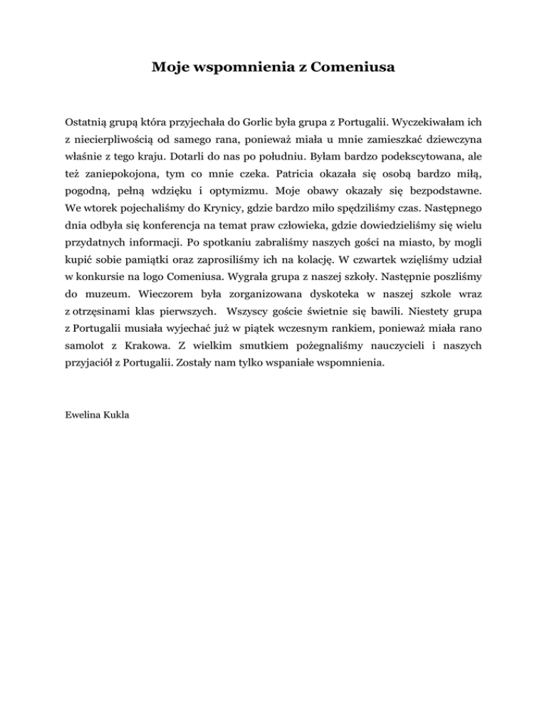 Moje wspomnienia z Comeniusa Ostatnią grupą która przyjechała do Gorlic była grupa z Portugalii. Wyczekiwałam ich z niecierpliwością od samego rana, ponieważ miała u mnie zamieszkać dziewczyna właśnie z tego kraju. Dotarli do nas po południu. Byłam bardzo podekscytowana, ale też zaniepokojona, tym co mnie czeka. Patricia okazała się osobą bardzo miłą, pogodną, pełną wdzięku i optymizmu. Moje obawy okazały się bezpodstawne. We wtorek pojechaliśmy do Krynicy, gdzie bardzo miło spędziliśmy czas. Następnego dnia odbyła się konferencja na temat praw człowieka, gdzie dowiedzieliśmy się wielu przydatnych informacji. Po spotkaniu zabraliśmy naszych gości na miasto, by mogli kupić sobie pamiątki oraz zaprosiliśmy ich na kolację. W czwartek wzięliśmy udział w konkursie na logo Comeniusa. Wygrała grupa z naszej szkoły. Następnie poszliśmy do muzeum. Wieczorem była zorganizowana dyskoteka w naszej szkole wraz z otrzęsinami klas pierwszych. Wszyscy goście świetnie się bawili. Niestety grupa z Portugalii musiała wyjechać już w piątek wczesnym rankiem, ponieważ miała rano samolot z Krakowa. Z wielkim smutkiem pożegnaliśmy nauczycieli i naszych przyjaciół z Portugalii. Zostały nam tylko wspaniałe wspomnienia. Ewelina Kukla