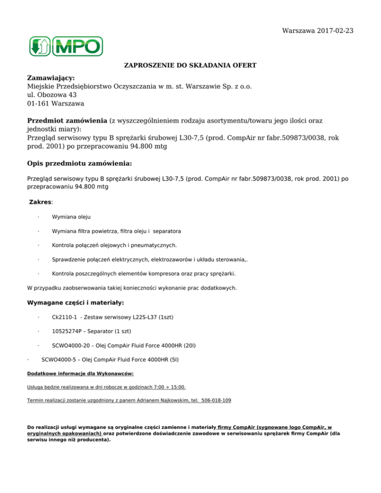 Warszawa 2017-02-23 ZAPROSZENIE DO SKŁADANIA OFERT Zamawiający: Miejskie Przedsiębiorstwo Oczyszczania w m. st. Warszawie Sp. z o.o. ul. Obozowa 43 01-161 Warszawa Przedmiot zamówienia (z wyszczególnieniem rodzaju asortymentu/towaru jego ilości oraz jednostki miary): Przegląd serwisowy typu B sprężarki śrubowej L30-7,5 (prod. CompAir nr fabr.509873/0038, rok prod. 2001) po przepracowaniu 94.800 mtg Opis przedmiotu zamówienia: Przegląd serwisowy typu B sprężarki śrubowej L30-7,5 (prod. CompAir nr fabr.509873/0038, rok prod. 2001) po przepracowaniu 94.800 mtg Zakres: · Wymiana oleju · Wymiana filtra powietrza, filtra oleju i separatora · Kontrola połączeń olejowych i pneumatycznych. · Sprawdzenie połączeń elektrycznych, elektrozaworów i układu sterowania,. · Kontrola poszczególnych elementów kompresora oraz pracy sprężarki. W przypadku zaobserwowania takiej konieczności wykonanie prac dodatkowych. Wymagane części i materiały: · · Ck2110-1 - Zestaw serwisowy L22S-L37 (1szt) · 10525274P – Separator (1 szt) · SCWO4000-20 – Olej CompAir Fluid Force 4000HR (20l) SCWO4000-5 – Olej CompAir Fluid Force 4000HR (5l) Dodatkowe informacje dla Wykonawców: Usługa będzie realizowana w dni robocze w godzinach 7:00 ÷ 15:00. Termin realizacji zostanie uzgodniony z panem Adrianem Najkowskim, tel. 506-018-109 Do realizacji usługi wymagane są oryginalne części zamienne i materiały firmy CompAir (sygnowane logo CompAir, w oryginalnych opakowaniach) oraz potwierdzone doświadczenie zawodowe w serwisowaniu sprężarek firmy CompAir (dla serwisu innego niż producenta). Powyższe informacje muszą być zawarte na druku ofertowym Wykonawcy. Na druku ofertowym Wykonawca musi zawrzeć również wykaz stosowanych części i materiałów zgodny z wymaganiami Zamawiającego. Wymagany okres gwarancji wynosi: 12 Termin składania ofert upływa w dn.: 2017-03-01 o godz. 12:00 Osoba do kontaktu w sprawie zamówienia z ramienia komórki metorycznie odpowiedzialnej za przedmiot zamówienia: Julianna Tyska Tel. kontaktowy: 22 391 02 04 Oferty należy nadesłać w jednej z następujących form: - drogą mailową na adres: [email protected] - w formie pisemnej: ul. Obozowa 43, pok. DZA Ocena ofert będzie dokonywana na podstawie następujących kryteriów: Cena 100% Zapraszamy do składania ofert.